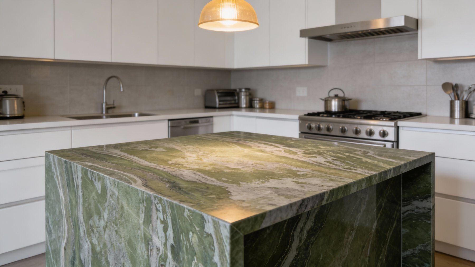表面经精细抛光处理,呈现**细腻光滑的温润光泽**。纹理过渡自然,无生硬边界:浅灰区域略带半透明感,与橄榄绿基底融合细腻;深绿脉络则增添了视觉纵深感。触感应是顺滑温润,视觉上兼具“细腻肌理”与“层次丰富性”,既保留石材的天然质感,又透出雅致的精致感。