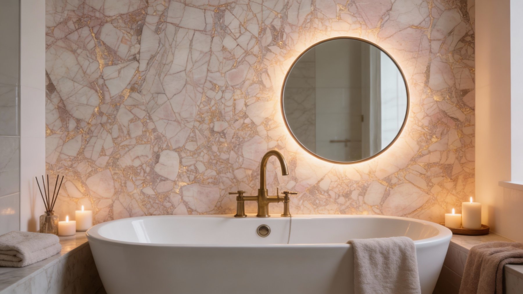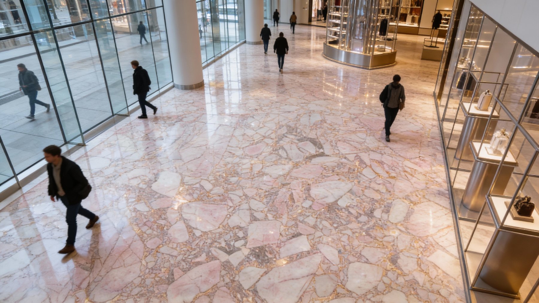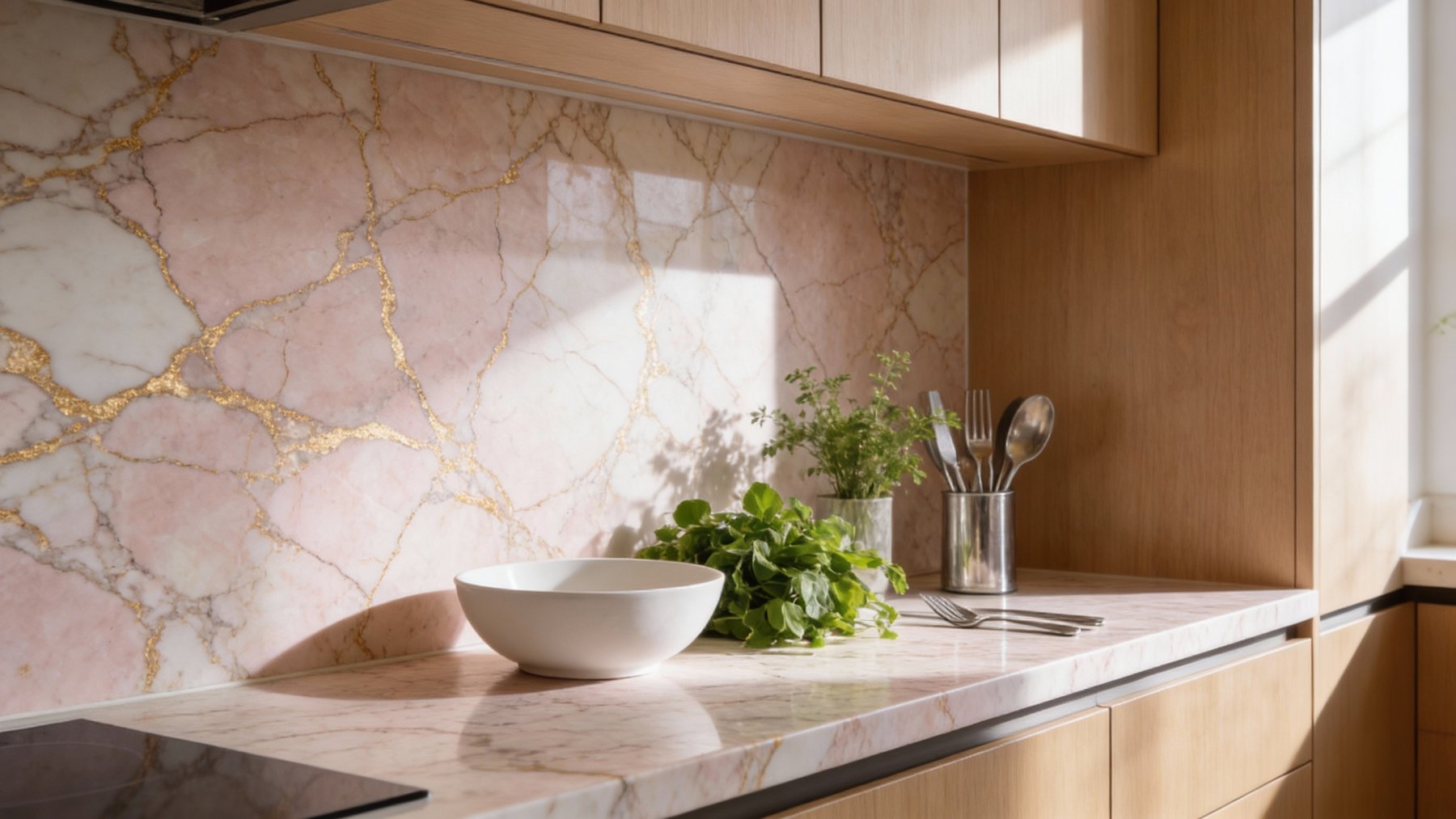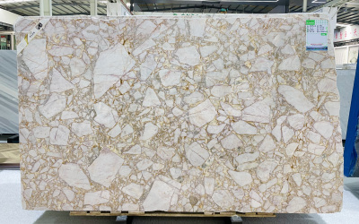表面经精细抛光处理后,呈现**细腻温润的轻奢质感**:光泽柔和内敛,无镜面般的强光反射,却能在光线下隐约透出石材的肌理层次。细节处可见块面颜色的微妙渐变(白、浅粉、米黄交织),与脉络线条的深浅变化相呼应,丰富了视觉层次;触感上似玉石般温润,又保留了石材的坚实厚重感,每一处纹理的细微差异都彰显天然独特性,尽显自然高级之美。