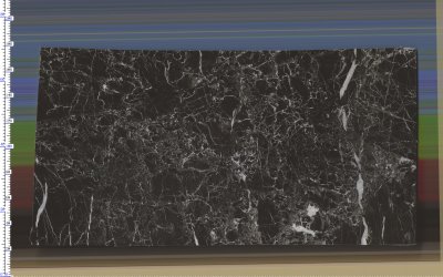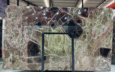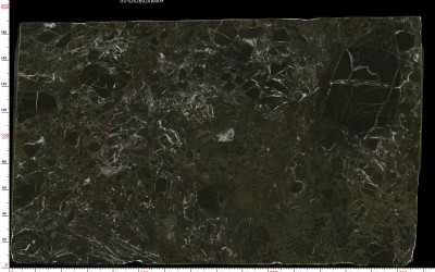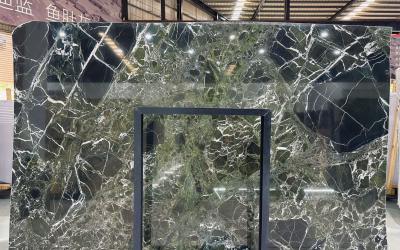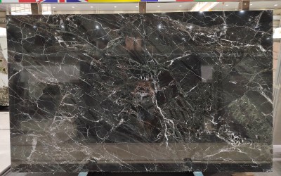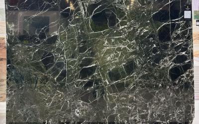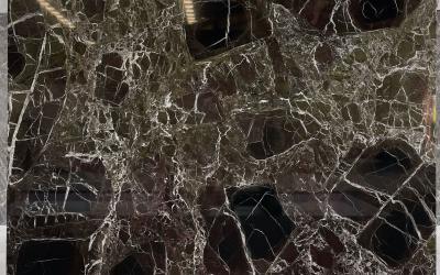 纹理以**白色不规则脉络状**呈现,纵横交错间充满自然随性的张力:既有纤细如发丝的轻盈线条,蜿蜒穿梭于黑色基底;也有宽幅不一的带状纹理,如大地龟裂般舒展延伸。纹理相互连接、交织,形成疏密有致的网状结构,无刻意的规则感,却暗含天然石材的生长逻辑,如同时光在石面上刻下的灵动痕迹,富有动态美感与原始生命力。