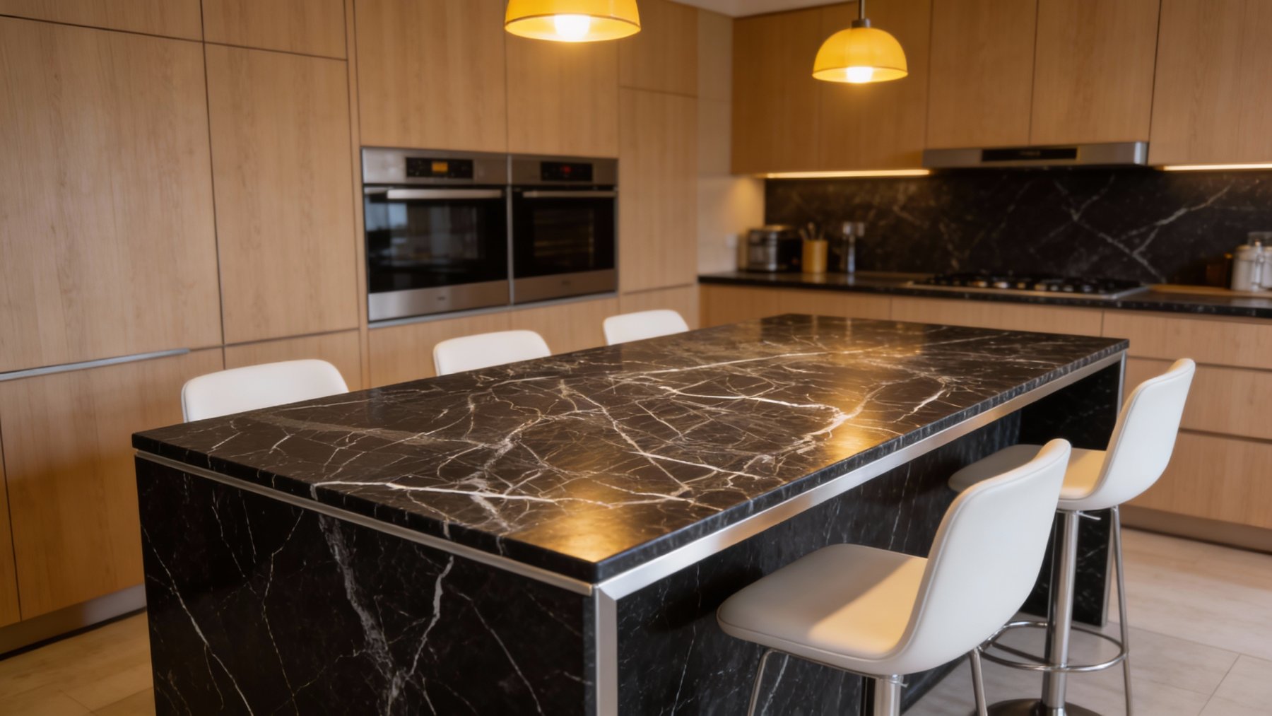 这款石材的底色为**浓郁深邃的黑色**,整体基调沉稳内敛,如同深夜的天幕般纯粹厚重,却又因石材本身的自然质感,隐约透出细腻的光泽层次,而非单调的纯黑。这种深色基底自带低调奢华的气场,能为空间奠定大气庄重的视觉基调。