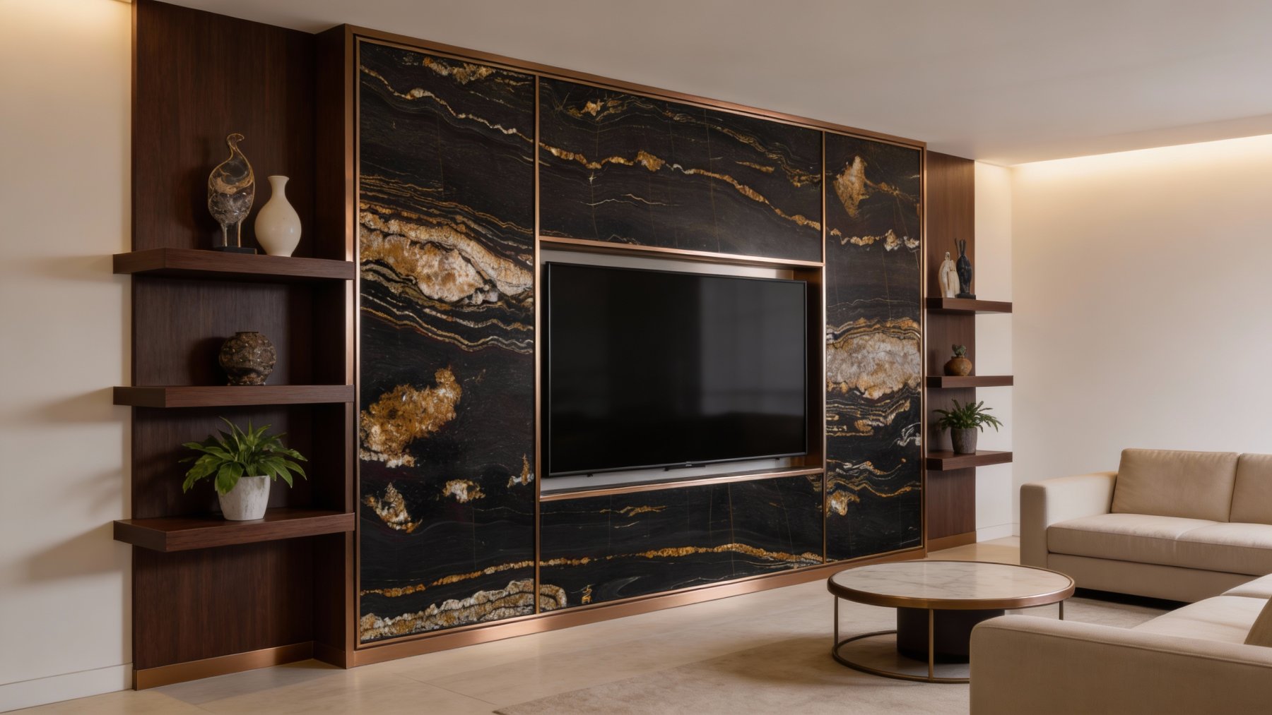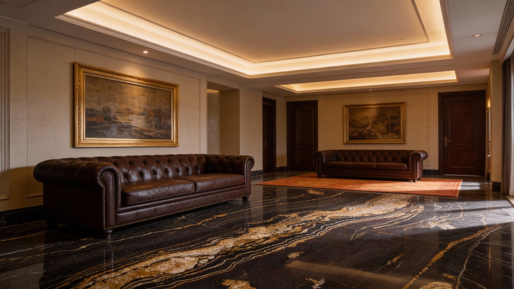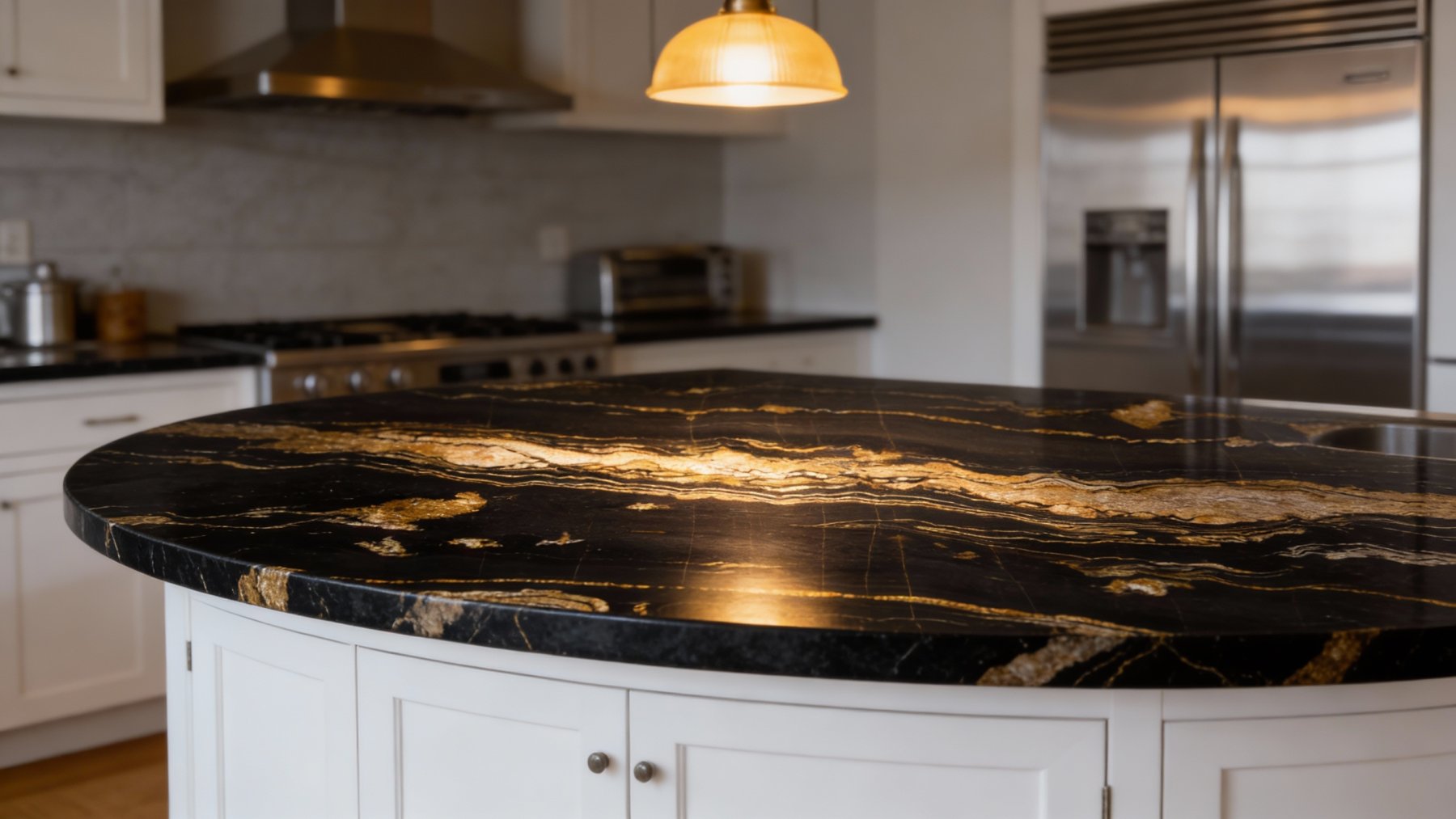 表面经精细抛光处理,呈现莹润亮泽的镜面效果,触感应是平滑细腻却不失石材的坚实质感;金色纹理自带温润的金属光泽,反光细腻且富有变化,细看可见纹理内部细微的结晶颗粒感,与深邃的黑色基底形成强烈对比,每一处纹理的起伏与色彩过渡都彰显自然天成的奢华韵味,兼具轻奢精致与厚重质感。