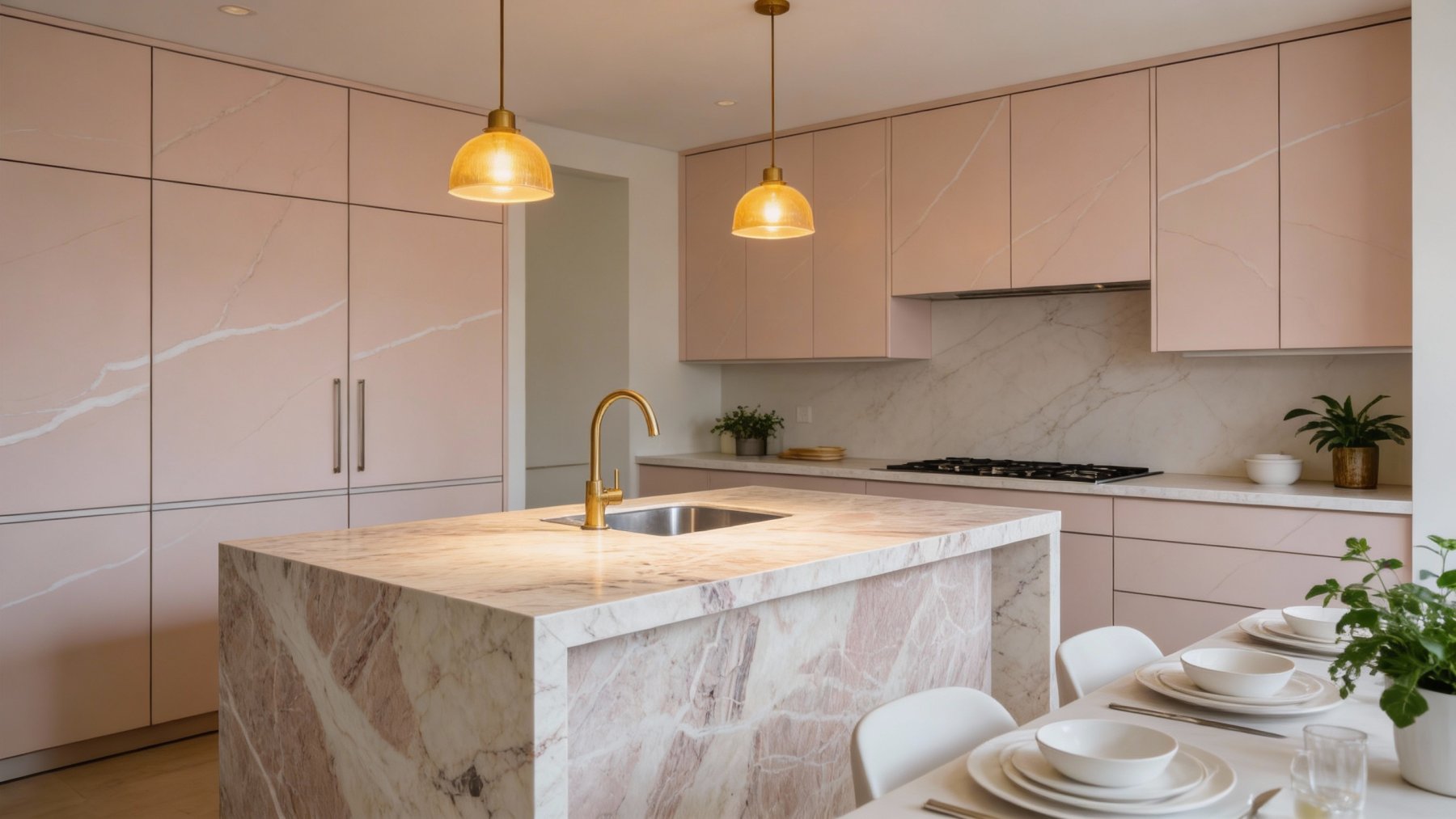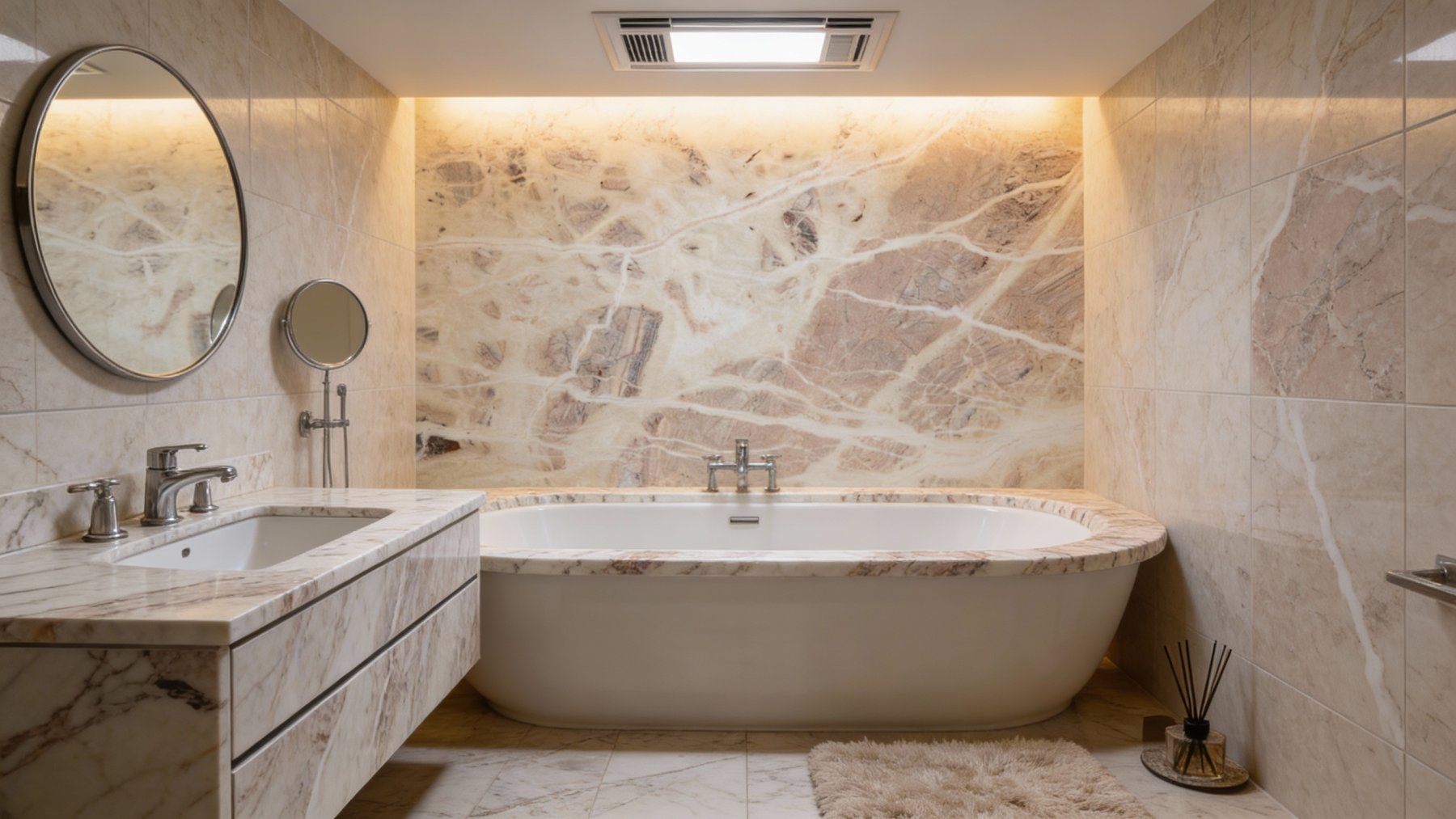 呈现自然流动的脉络状纹理,浅棕与淡粉交织的线条粗细不一、疏密有致:宽幅的条带似舒展的丝带,纤细的脉络如游走的溪流,纹理走向无拘无束,交织成不规则的网状结构,既有灵动的韵律感,又保留了天然石材的随性野趣。