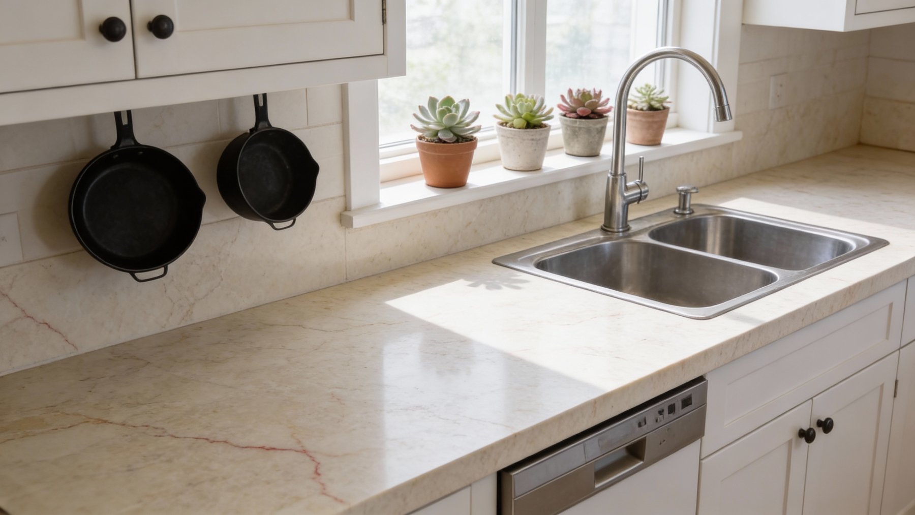 这款石材的底色基调为**柔和奶白色**,色调温润雅致,并非冷硬的纯白,而是融入了自然的暖调质感,如同清晨薄雾般纯净舒适,给人一种宁静、亲和的视觉感受。