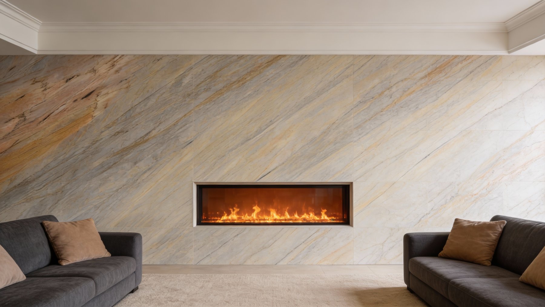 **细节质感**:表面质地致密细腻,光泽柔和内敛(似柔光或半哑光处理),触感应顺滑无明显颗粒感;纹理边缘过渡自然,细微的色差变化与发丝纹增添了天然石材的真实肌理感,整体兼具石材的坚硬质感与温润视觉效果,精致而内敛。