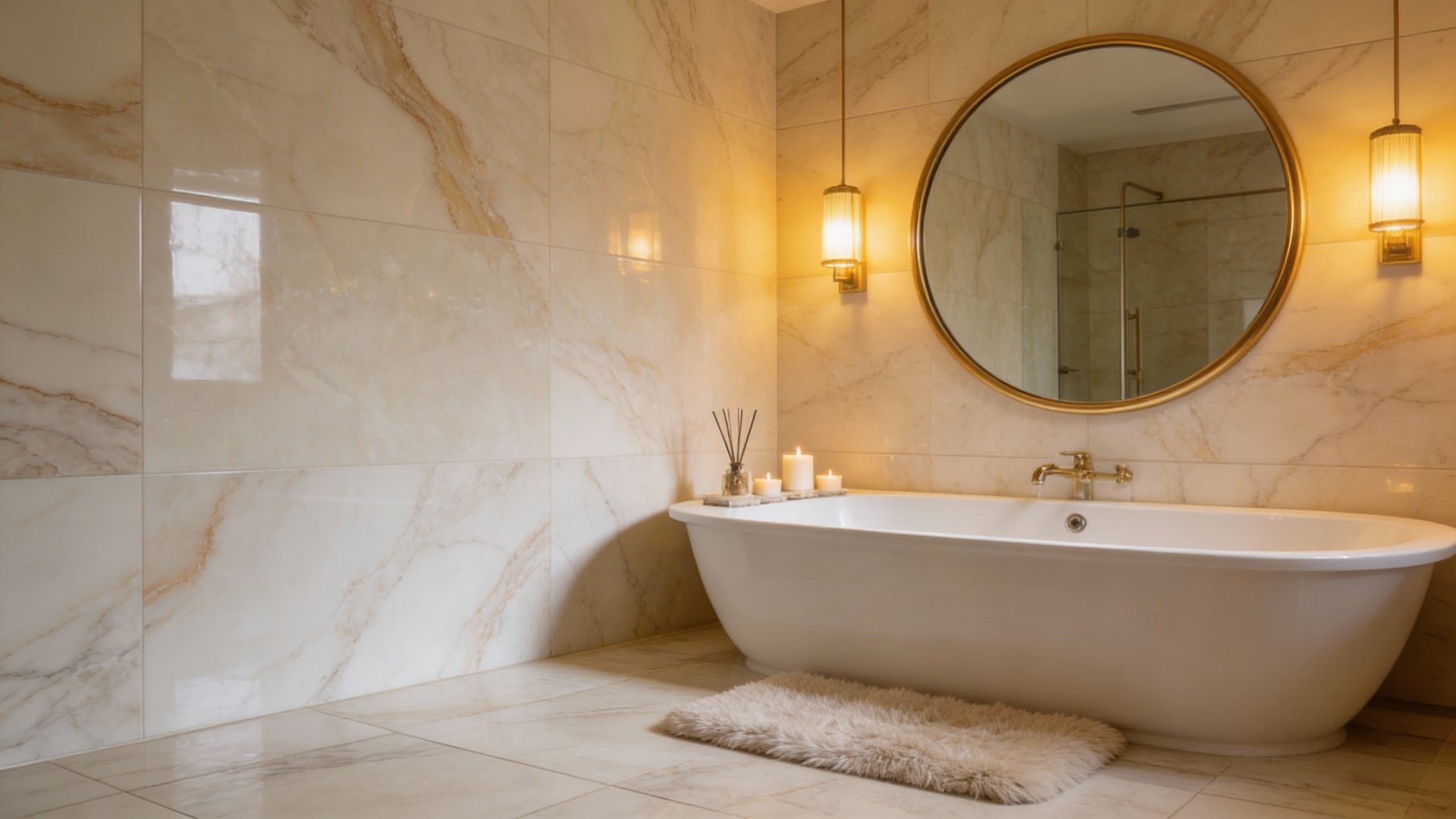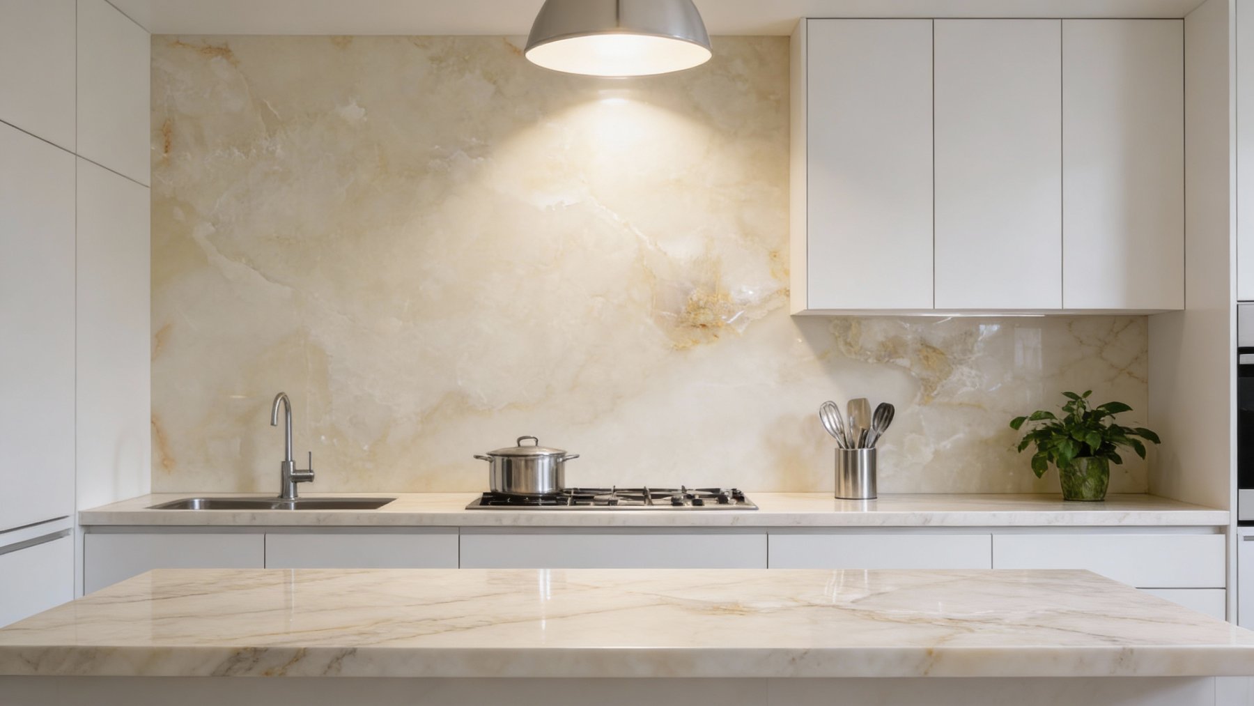 整体以**暖调浅米白色**为基底,色泽柔和温润,近似浅杏白或奶白色质感,无强烈色彩跳跃,整体氛围温馨雅致,既保留了天然石材的质朴感,又传递出轻盈柔和的视觉温度。