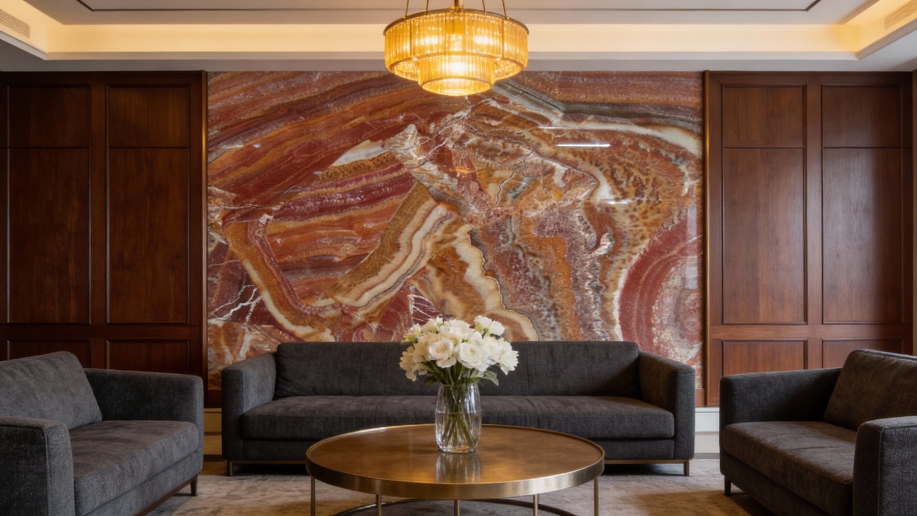 这款石材的底色基调以暖色系为主,融合了浓郁的红棕色、醇厚的橙棕色与柔和的浅米色。多种暖调相互交织,奠定了温暖而厚重的视觉基底;同时白色与浅黄的脉络穿插其中,平衡了整体色调的饱和度,既消解了深色调的沉闷感,又为石材增添了灵动的层次感。