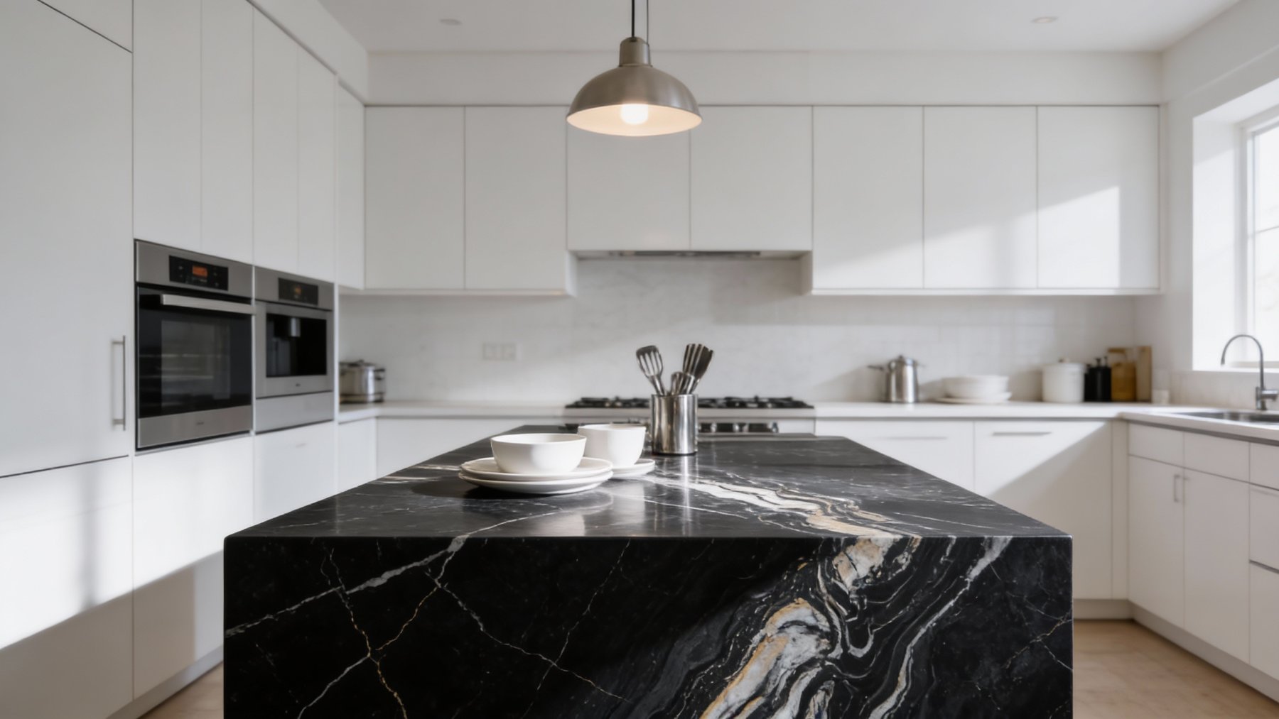 表面经精细抛光处理,触感细腻光滑,光泽柔和内敛却不失质感;纹理细节丰富多变:白色纹路通透洁净,似冰晶般清透;浅金色脉络温润雅致,带有些许温润的金属光泽;墨绿与黑色基底深邃厚重,如凝脂般细腻。各色彩带过渡自然,边缘或清晰锐利、或朦胧晕染,层次分明,每一处纹理都彰显着天然石材的独特肌理,兼具细腻触感与视觉张力。