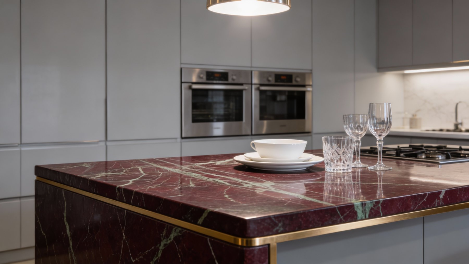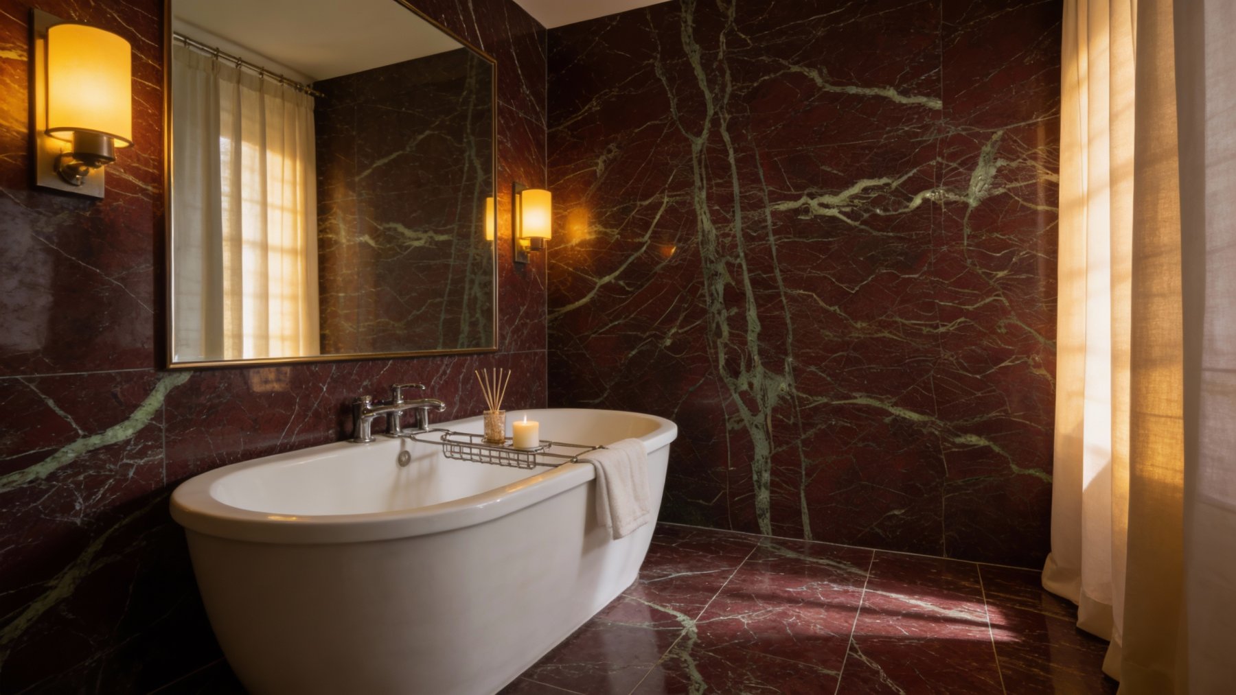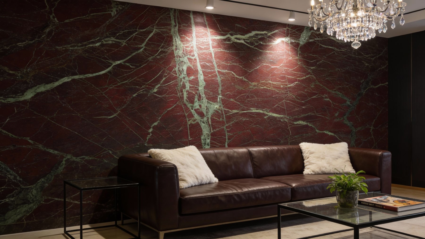 这款石材的底色基调为**浓郁深邃的酒红色**,色泽饱满厚重,如陈酿红酒般温润且富有层次感,整体基调沉稳大气,既蕴含奢华感又不失内敛,给人以典雅庄重的视觉初印象。