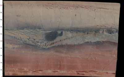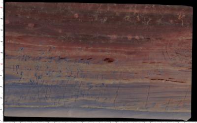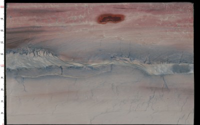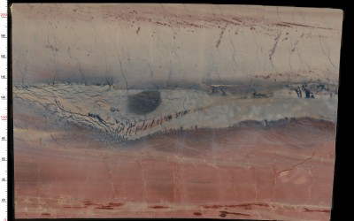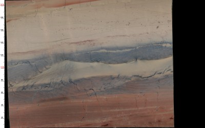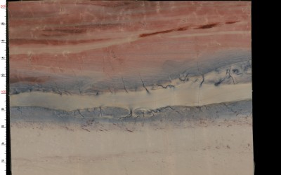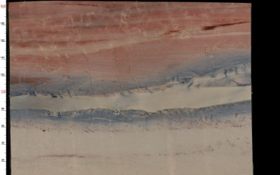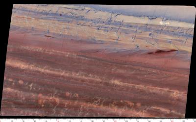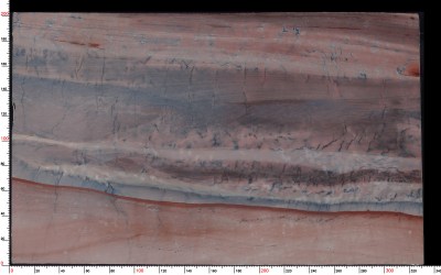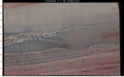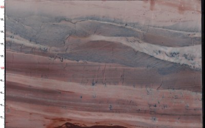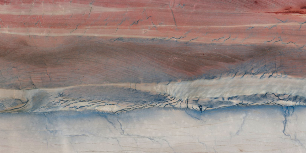 石材底色呈现**多层次自然渐变**,从顶部的暖调红褐(略带粉调的地质感),平滑过渡至中部的中性棕灰,再向下延伸为底部的冷调浅灰蓝。暖冷色调交织融合,仿佛地质沉积的时间印记,整体基调丰富却和谐,既保留了自然石材的原始厚重感,又因冷暖过渡增添了柔和层次。