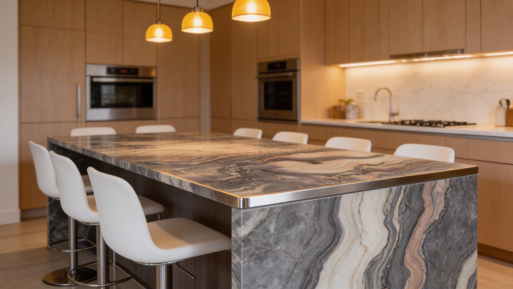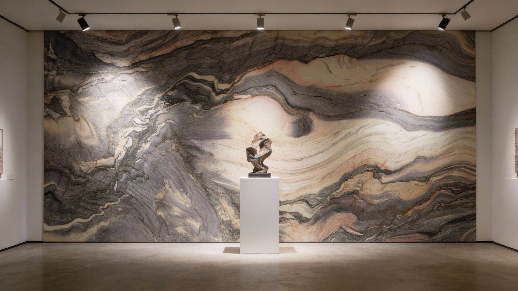 细节质感温润雅致,表面带着**自然石材特有的柔和光泽**(非高光亦非哑光),触感细腻平滑却暗含纹理的细微起伏。纹理边缘过渡自然晕染,深灰、褐棕与浅米的色彩无生硬界限,细微处可见矿物颗粒的天然交织,赋予石材厚重的层次感。整体质感厚重而不笨重,温润而不轻薄,仿佛承载着时光的沉淀,尽显天然石材的高端雅致与独特质感。