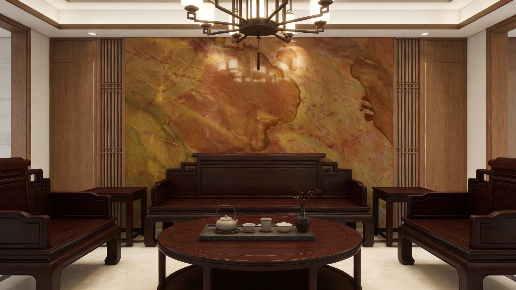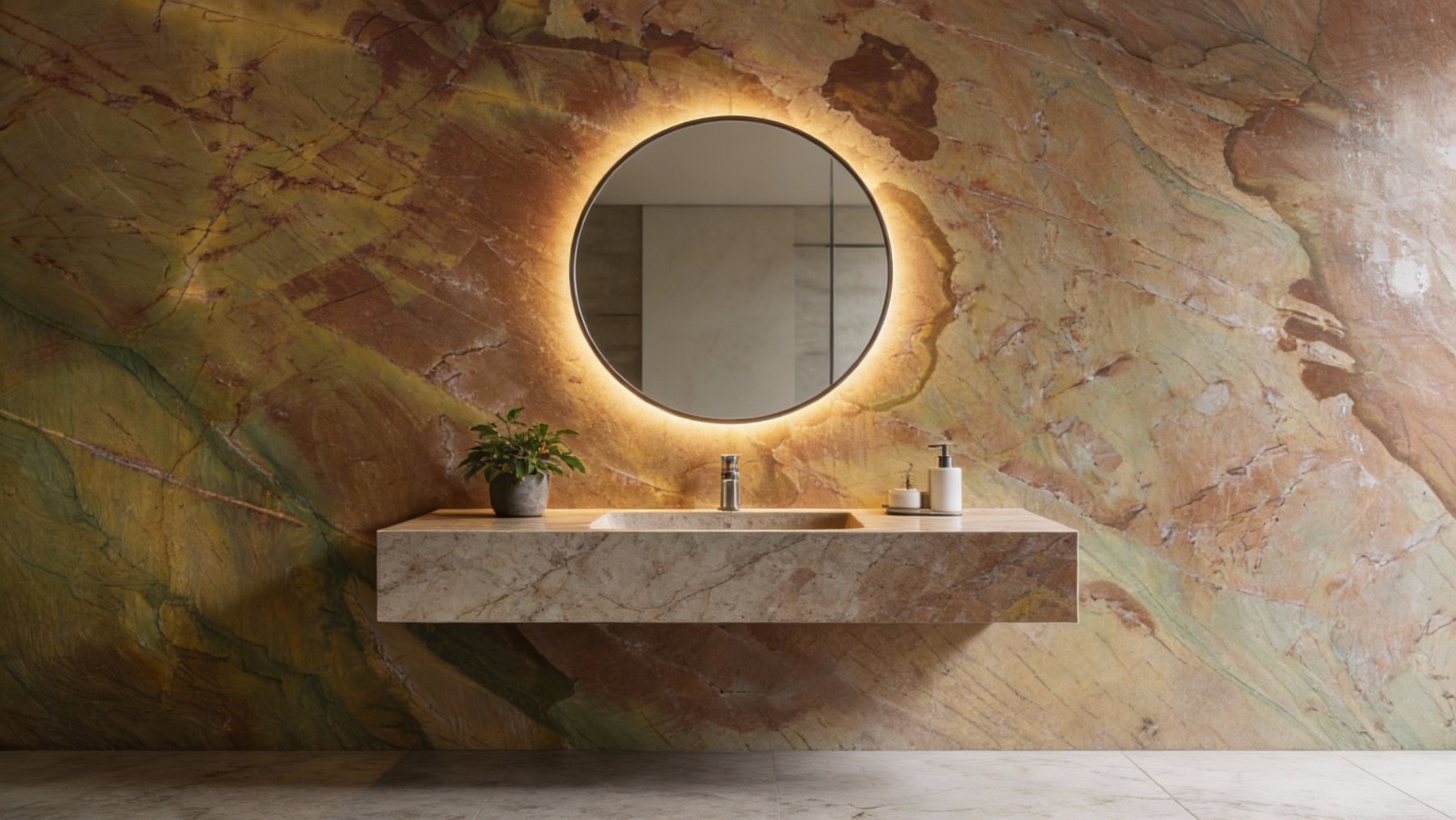 这款石材的底色以温暖浓郁的大地色系为核心,融合金棕、赭黄与浅褐的基础色调,其间交织着深浅不一的红棕色斑块,底部还隐约透出淡橄榄绿的自然底色。整体色调和谐内敛,如沉淀了岁月的土地肌理,既保留了天然石材的质朴感,又因暖调的交织而显得温润亲和。