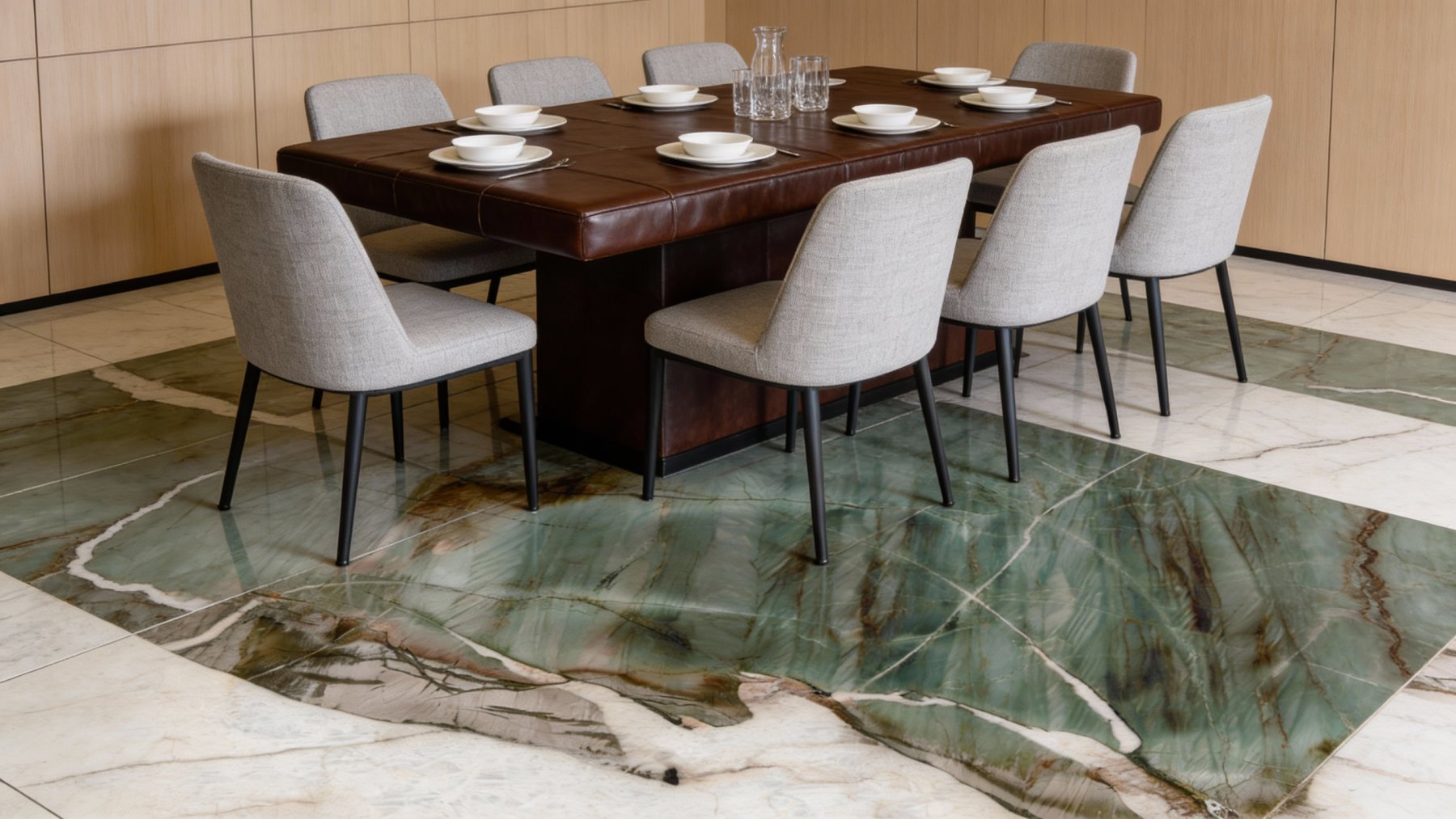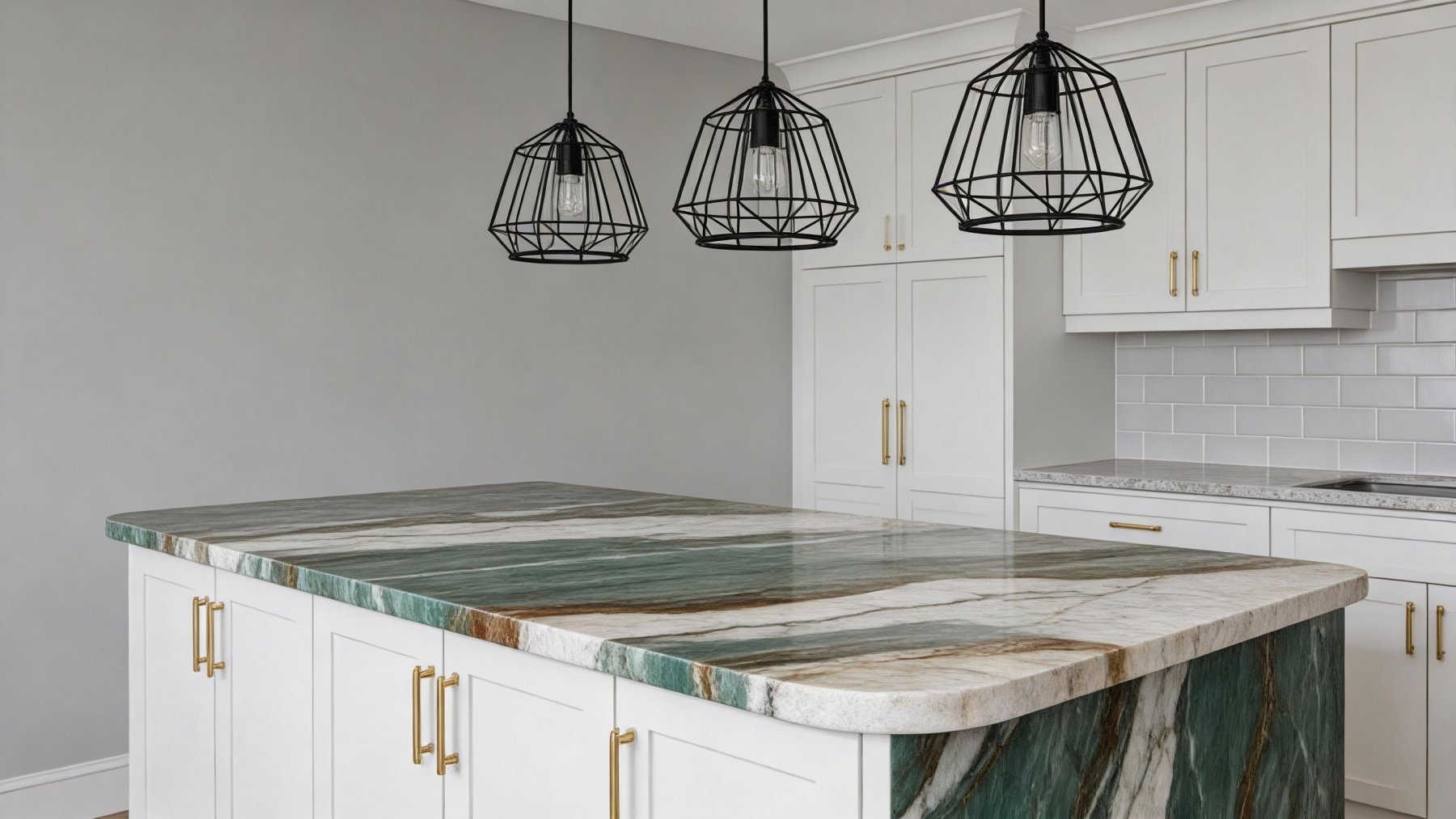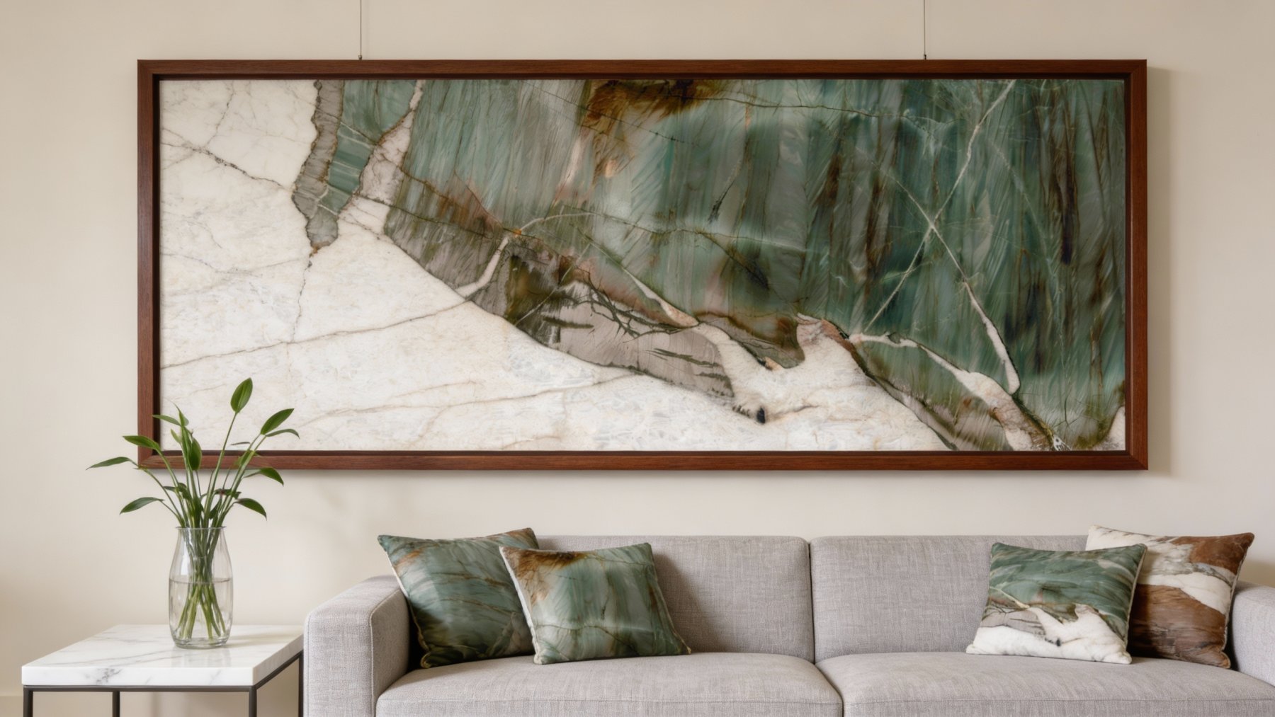 石材表面质感**细腻温润**,触感平滑且带有天然石材的柔和光泽。绿色区域透出隐约的半透明感,似玉石般温润通透;白色纹理洁净如凝脂,细腻无杂;褐色纹路则带着些许深沉的肌理感,与绿、白部分形成微妙的视觉对比。纹理过渡自然无生硬边界,每一处细节都彰显出天然石材的独特肌理,既具光滑细腻的触感,又有视觉上的厚重与温润质感。