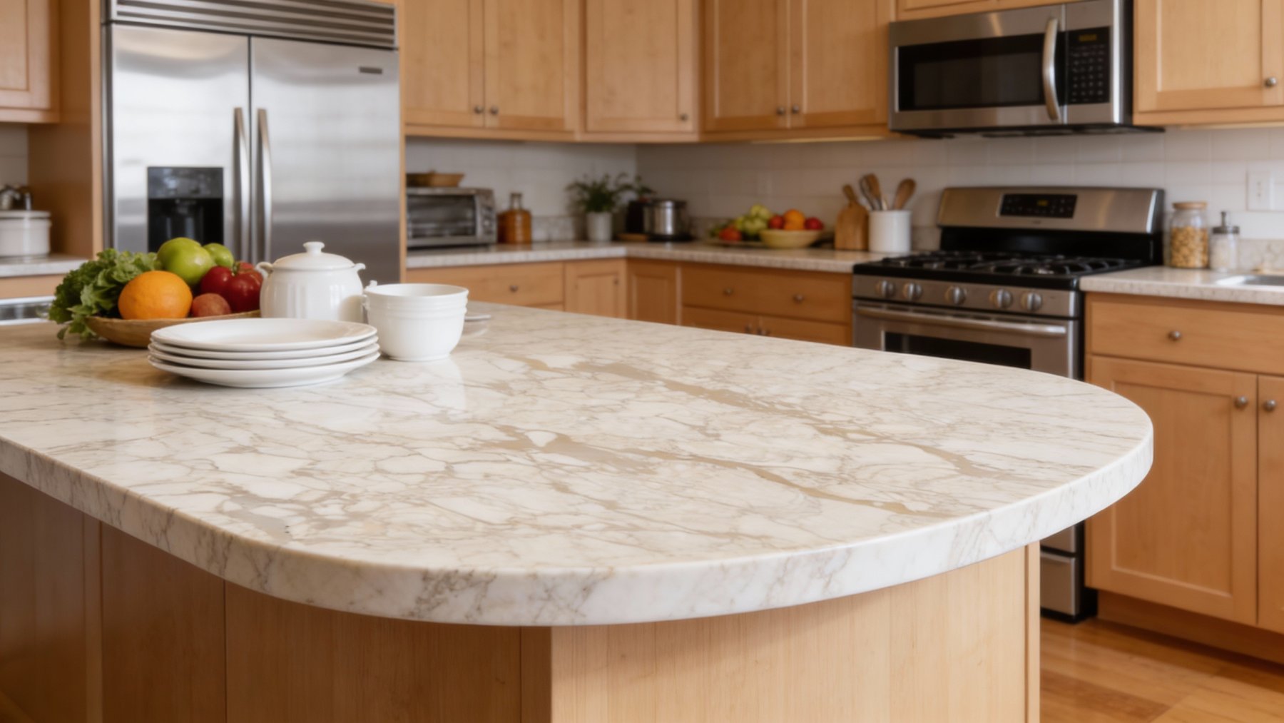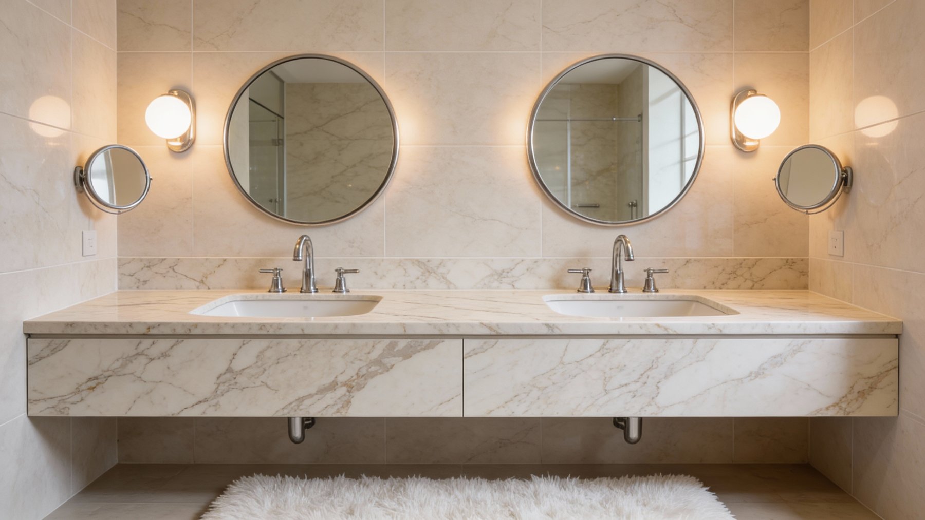 石材底色以**暖调米白**为主基调,揉入浅奶油色的温润质感,整体色调柔和雅致。既保留了白色系的明亮通透,又因暖调的注入避免了冷硬感,如同清晨的柔光洒在石材表面,奠定了温馨舒适且不失高级感的视觉基础。