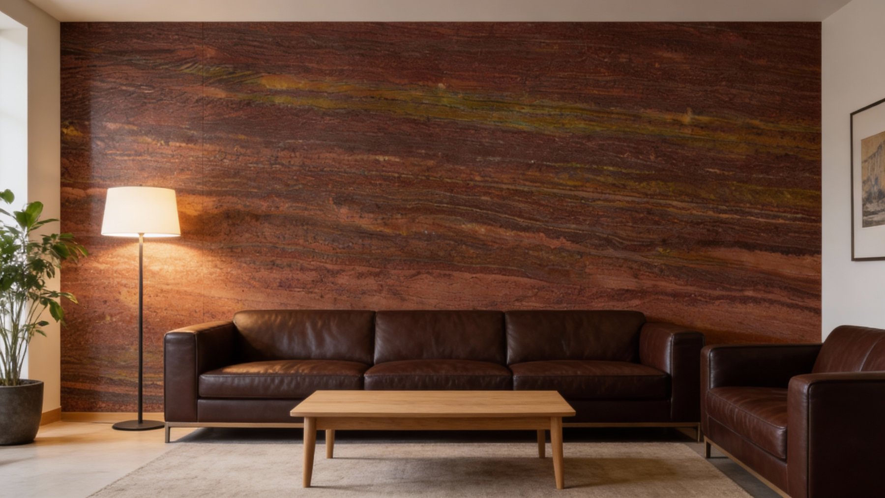 以浓郁醇厚的红棕色为核心基底,交织着深褐、赭石等暖调色彩,整体氛围沉稳古朴又不失温润感,如同地质岁月沉淀下的岩层底色,传递出自然厚重的原生质感。