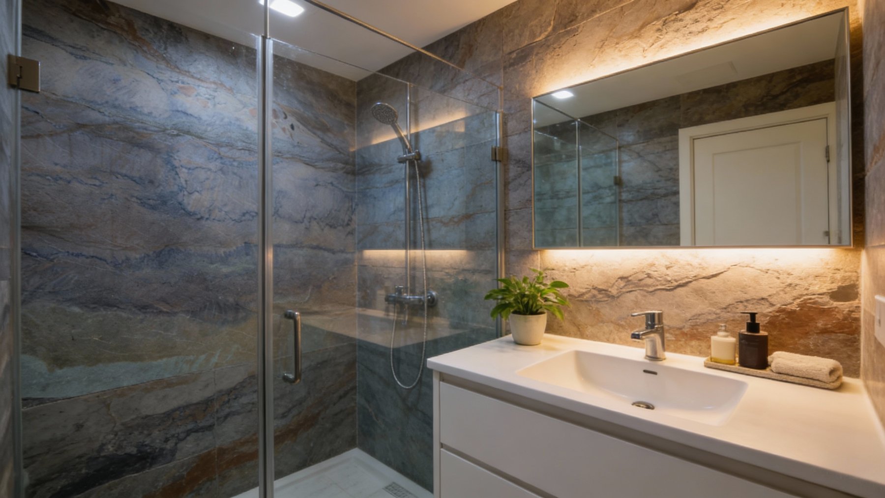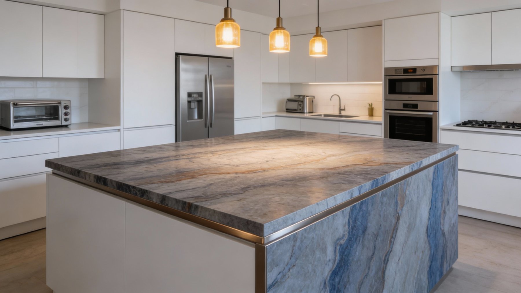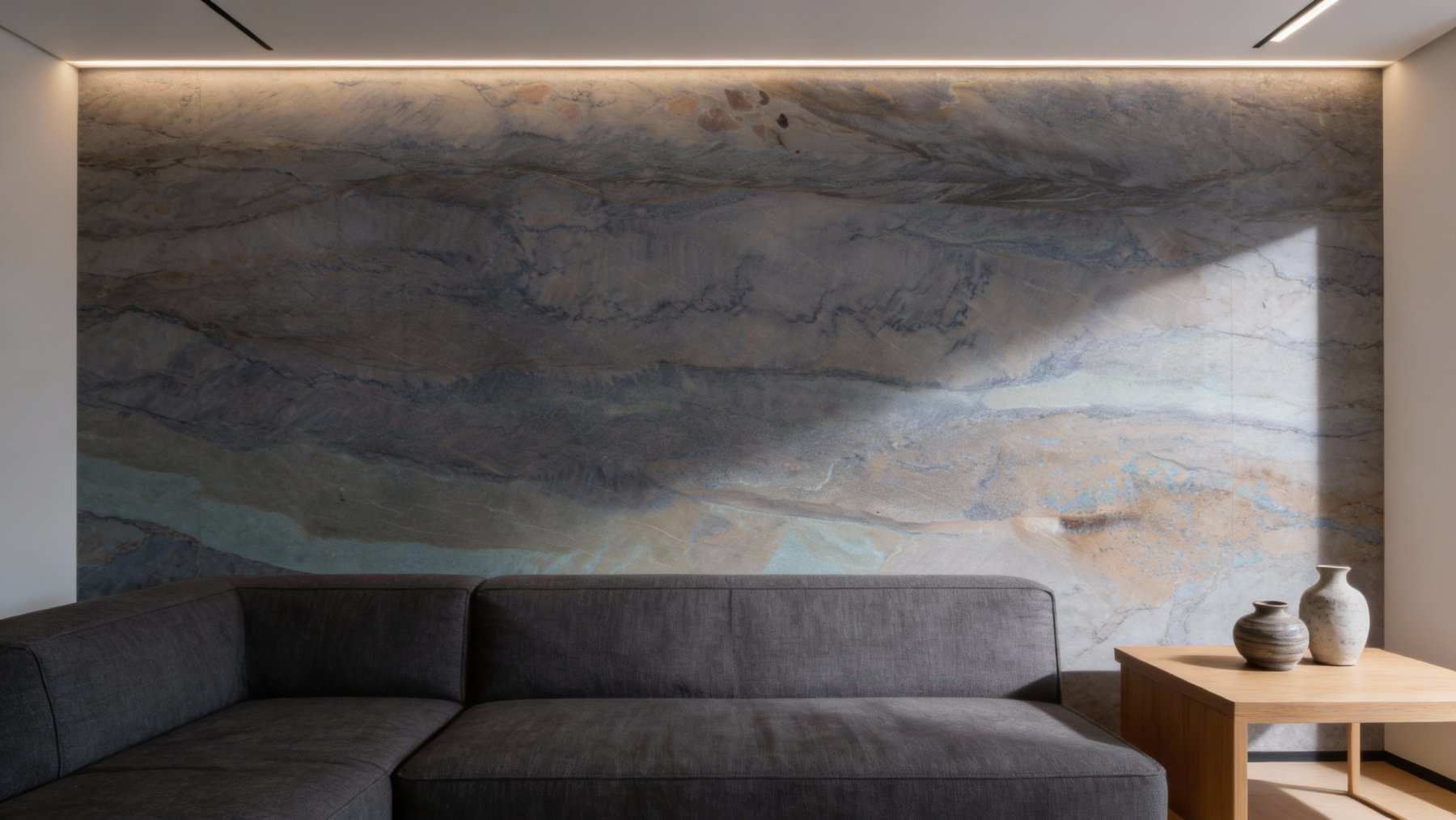 呈现自然层叠的水平肌理,深灰蓝色的线条或粗或细、或断或续,似流水长期冲刷形成的岩层痕迹,纹理间散落着细碎的矿物斑点(暗褐或深灰),如星尘嵌入肌理,赋予石材流动的韵律感;无刻意规整的切割感,每一处纹理都带着自然天成的随性,似大地脉络般舒展。