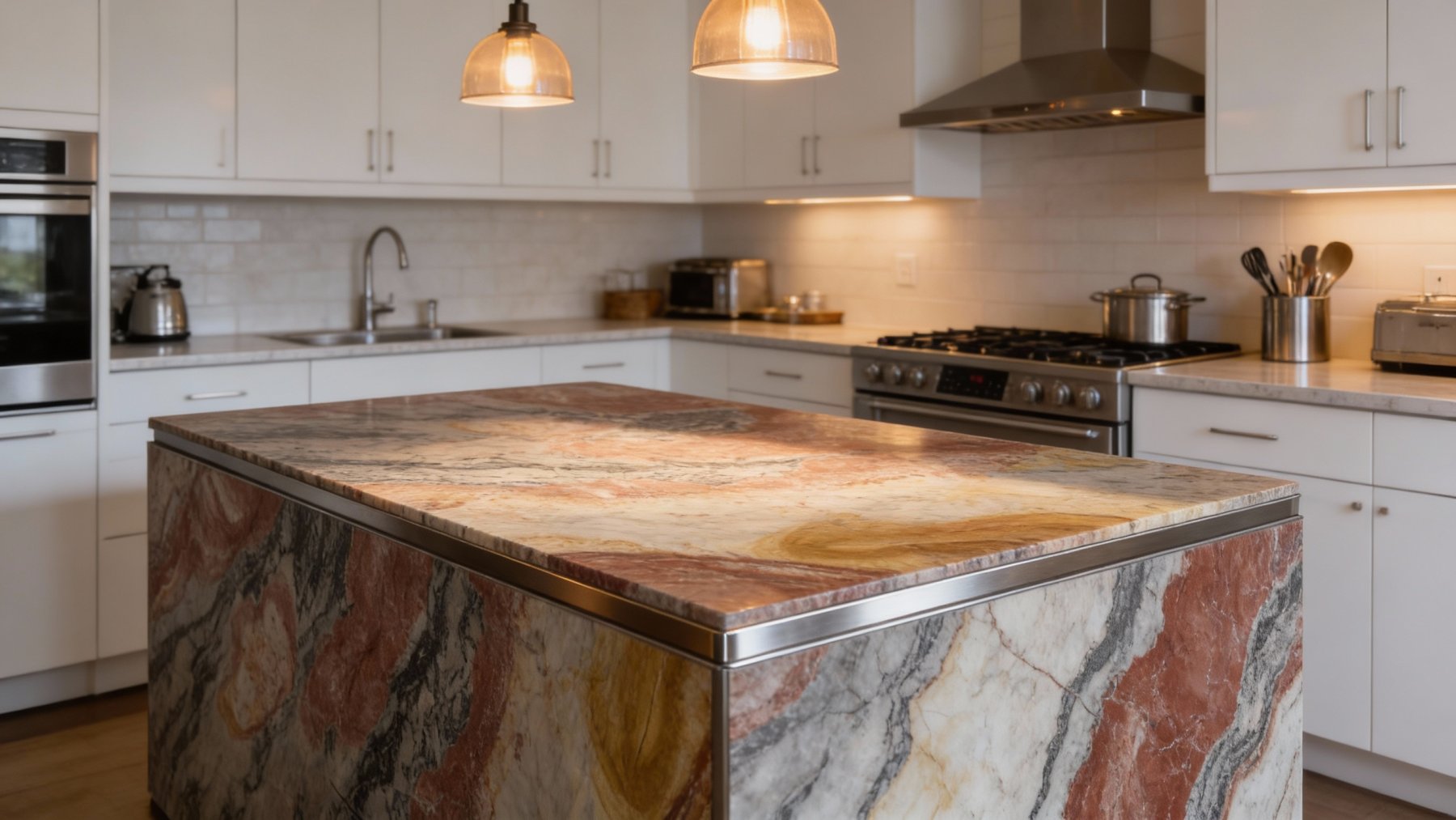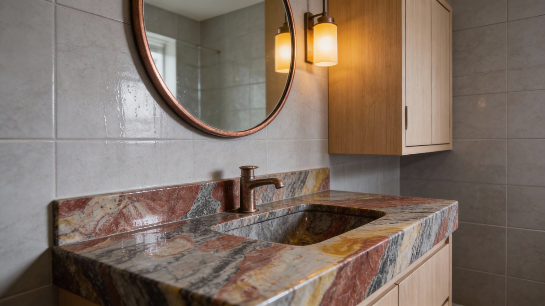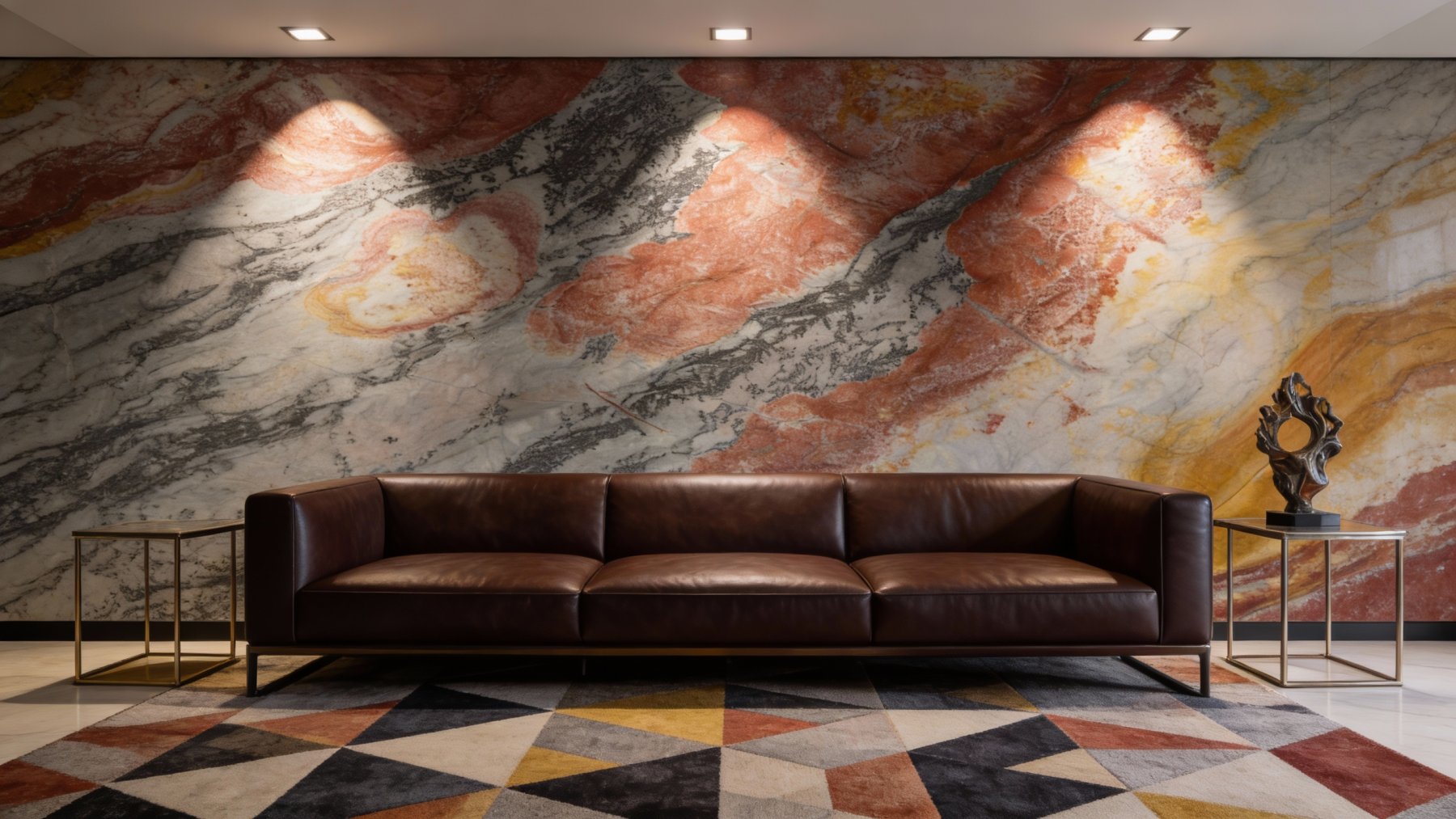 表面质感细腻温润,浅底色区域带有微妙的矿物颗粒感,触感应平滑却不失天然肌理;暖棕红区域色泽饱满且过渡自然,深浅变化中藏有淡黄褐色的细微点缀;深灰纹理线条纤细却清晰,边缘略带晕染感,似水墨洇开的朦胧;整体呈现出哑光或半哑光的厚重质朴感,每一处细节都彰显着天然石材的原始质感与独特性。