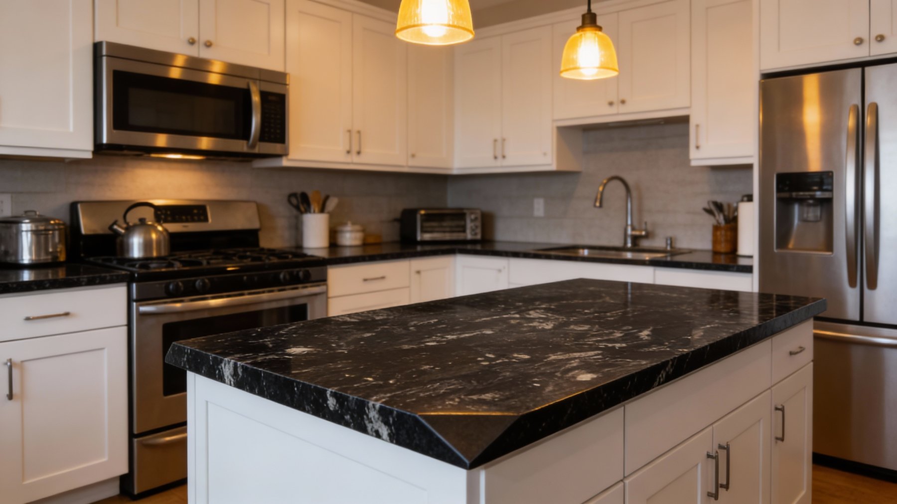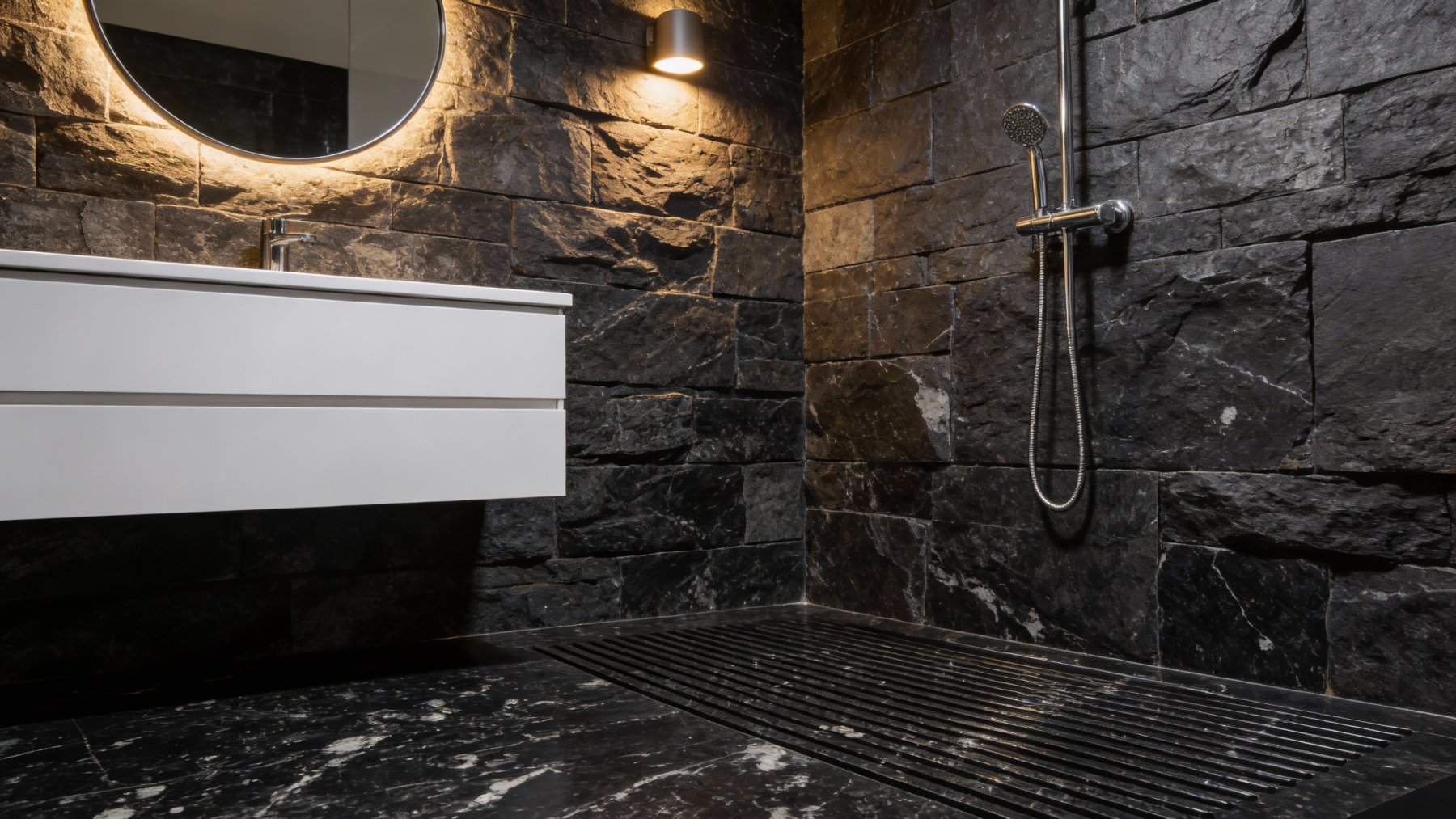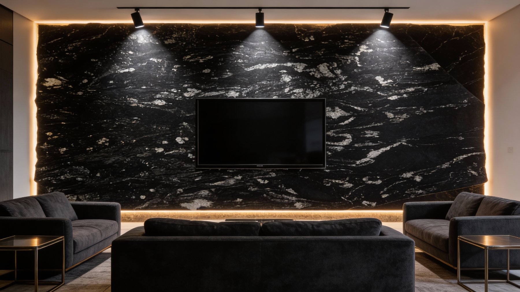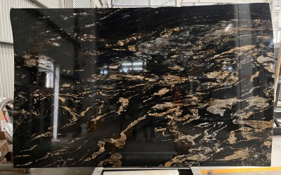 这款石材以**深邃浓郁的纯黑色**为核心基调,色泽饱满厚重,如墨色凝炼般均匀沉稳,无明显杂色干扰,奠定了静谧高级的视觉基底,给人以强烈的质感沉淀感与空间压迫感(此处指厚重感,非贬义),适配性极强。