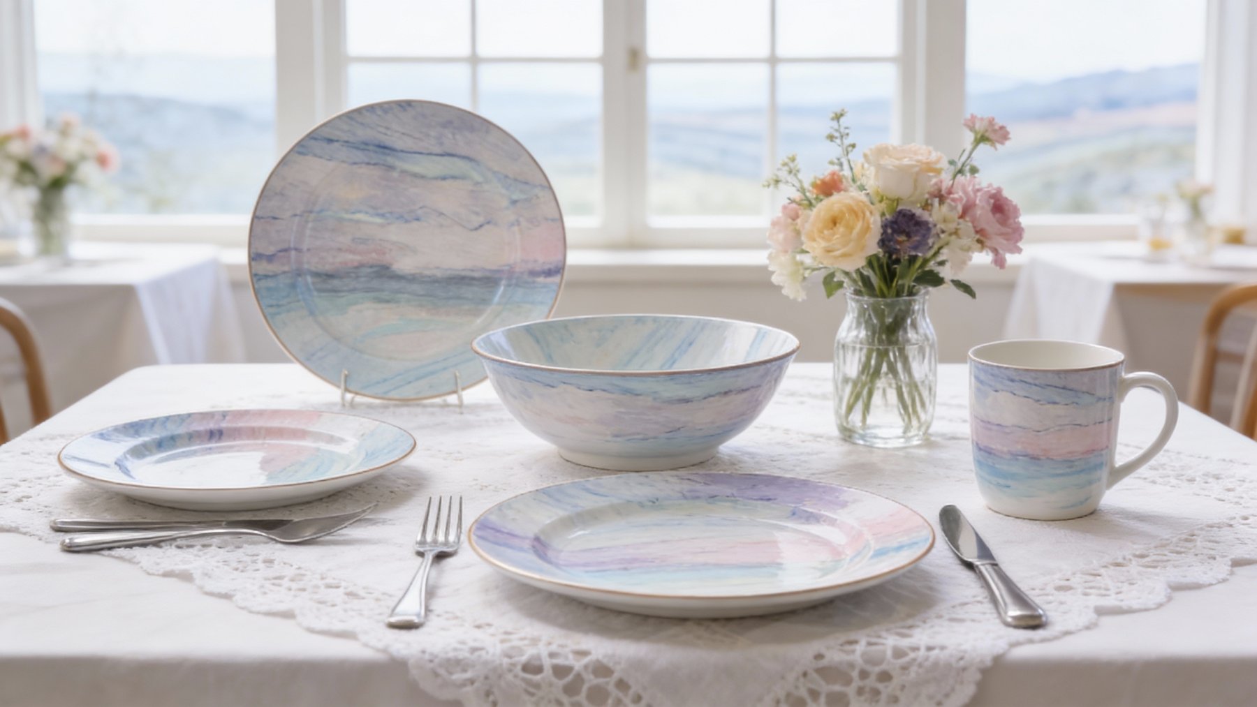 以清新淡雅的冷色调为主,融合浅蓝、灰白与淡绿等柔和色彩,整体呈现如天空与湖水交织般的澄澈感,基调温润宁静,似将自然间的澄澈景致凝于石上。