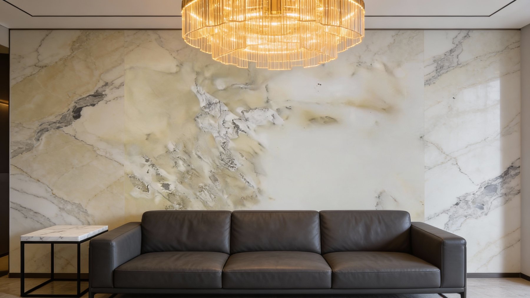 这款石材的底色以**温润的奶白色与浅米黄色**为主调,整体色调柔和雅致,带着天然石材特有的暖润质感。没有强烈的色彩碰撞,仅通过细微的色调过渡,营造出静谧舒适的视觉基底,仿佛清晨的阳光洒在凝脂上,自带柔和光晕。