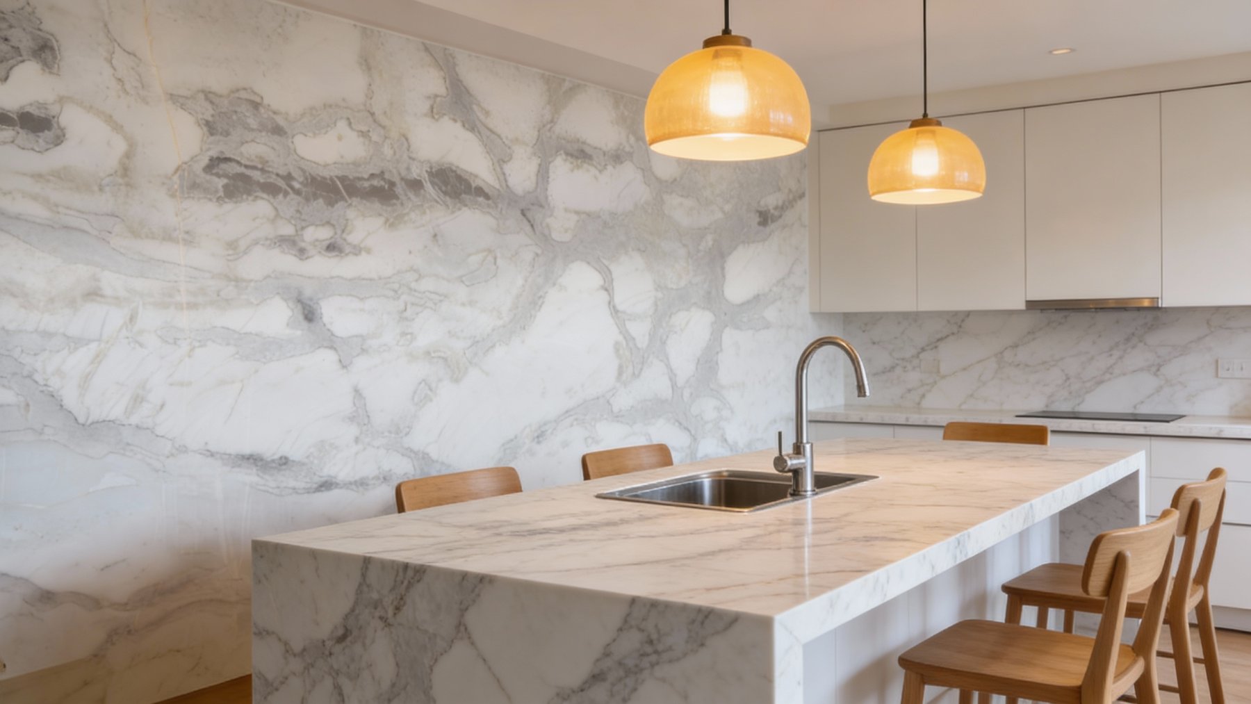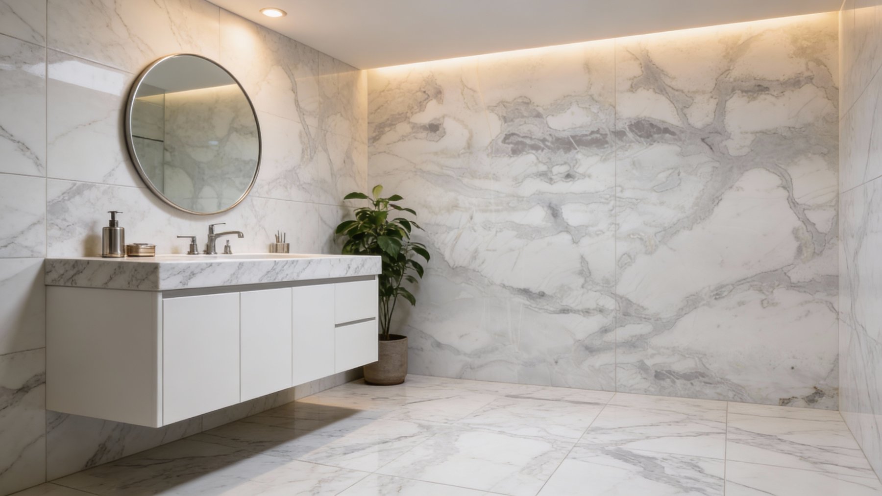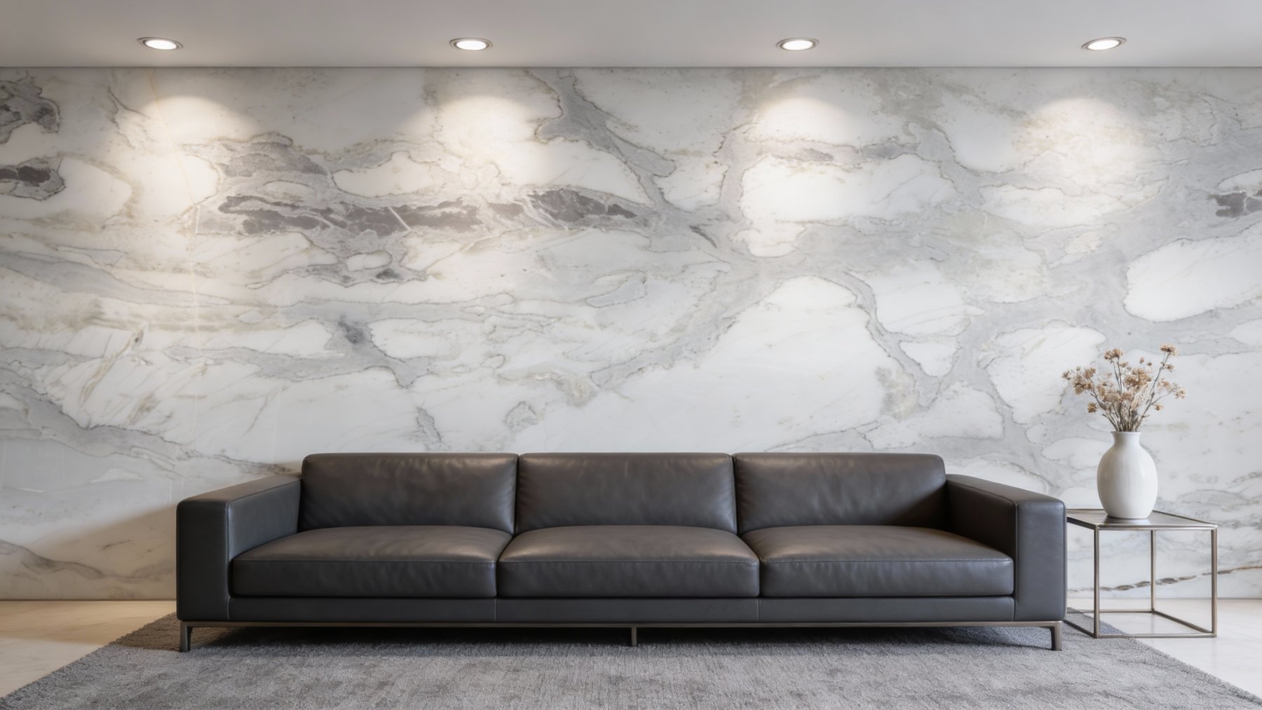 表面经精细处理后呈现光滑细腻的触感,带有柔和的温润光泽(似半抛光效果)。纹理部分由深浅不一的灰色层次构成,从淡灰到中灰的渐变过渡自然,纹理边缘无生硬割裂感,与白色基底融合得恰到好处。整体质感致密温润,无粗糙颗粒感,视觉上兼具雅致高级感与天然石材的细腻肌理,触感应是顺滑且带有轻微凉感的舒适质地。