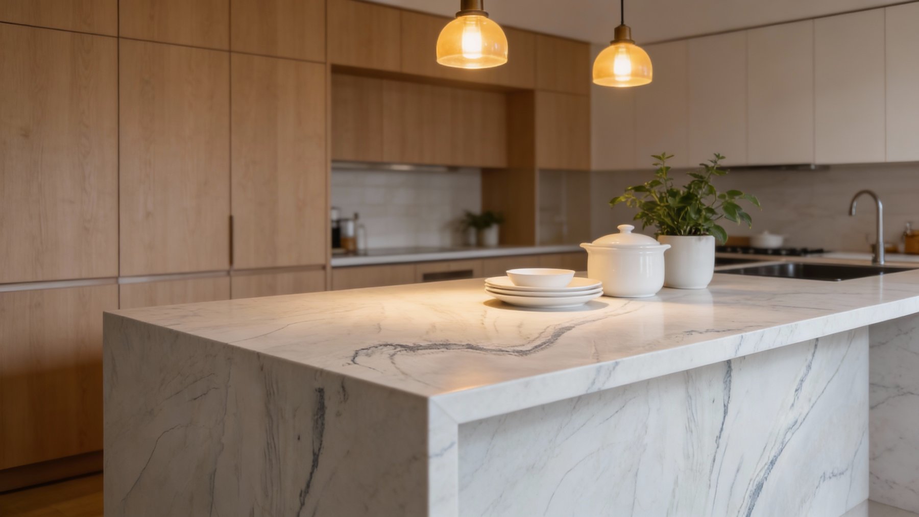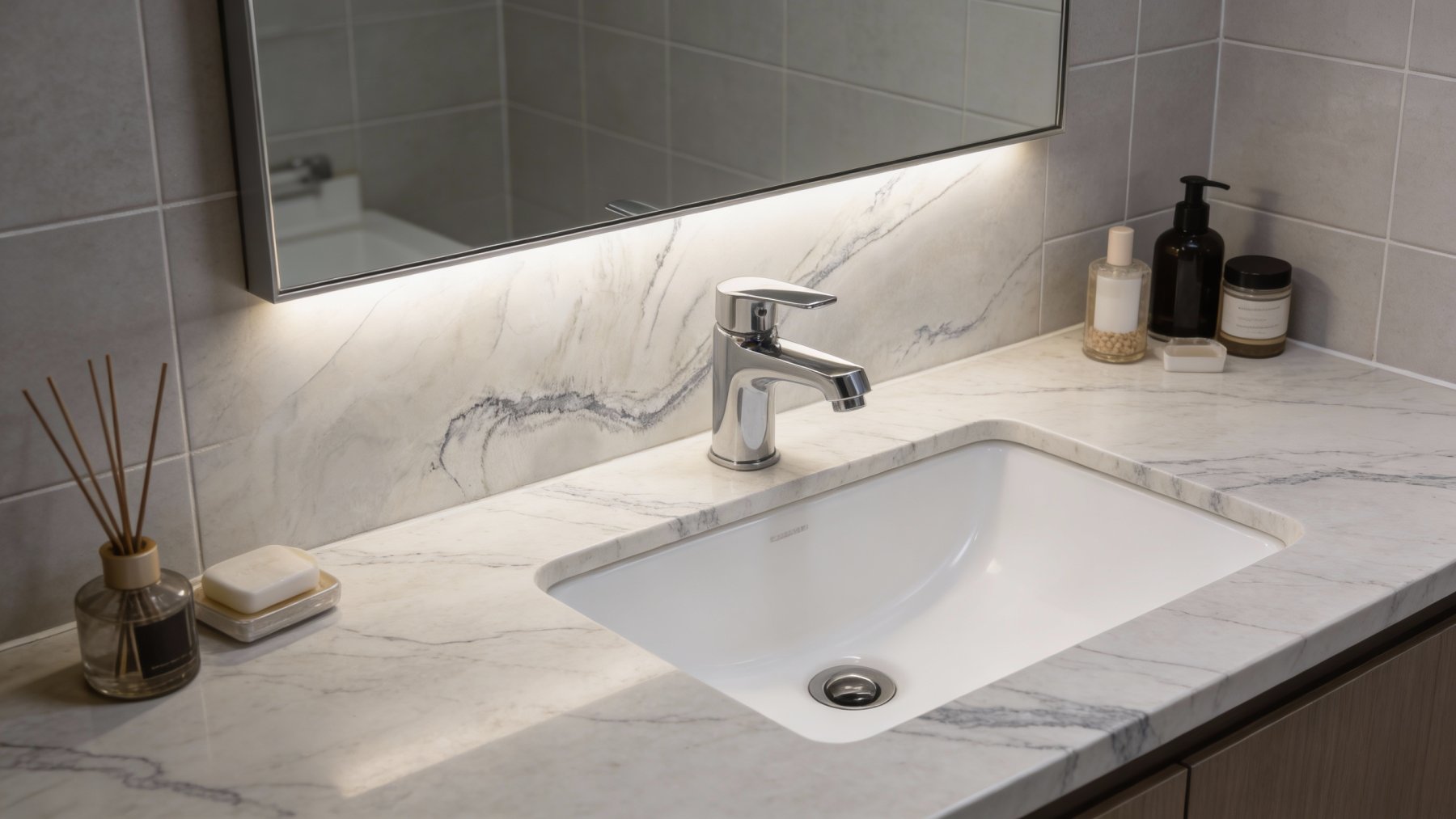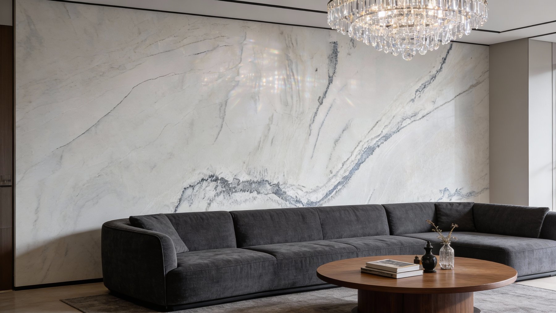 底色以温润的浅米白与淡灰色交织为主,整体基调柔和雅致,不张扬却自带静谧质感。浅色调中隐约透着一丝暖调,仿佛清晨薄雾笼罩的湖面般干净通透,既保留了石材的天然质朴,又传递出轻盈舒适的视觉感受,为空间奠定了清新雅致的基础。