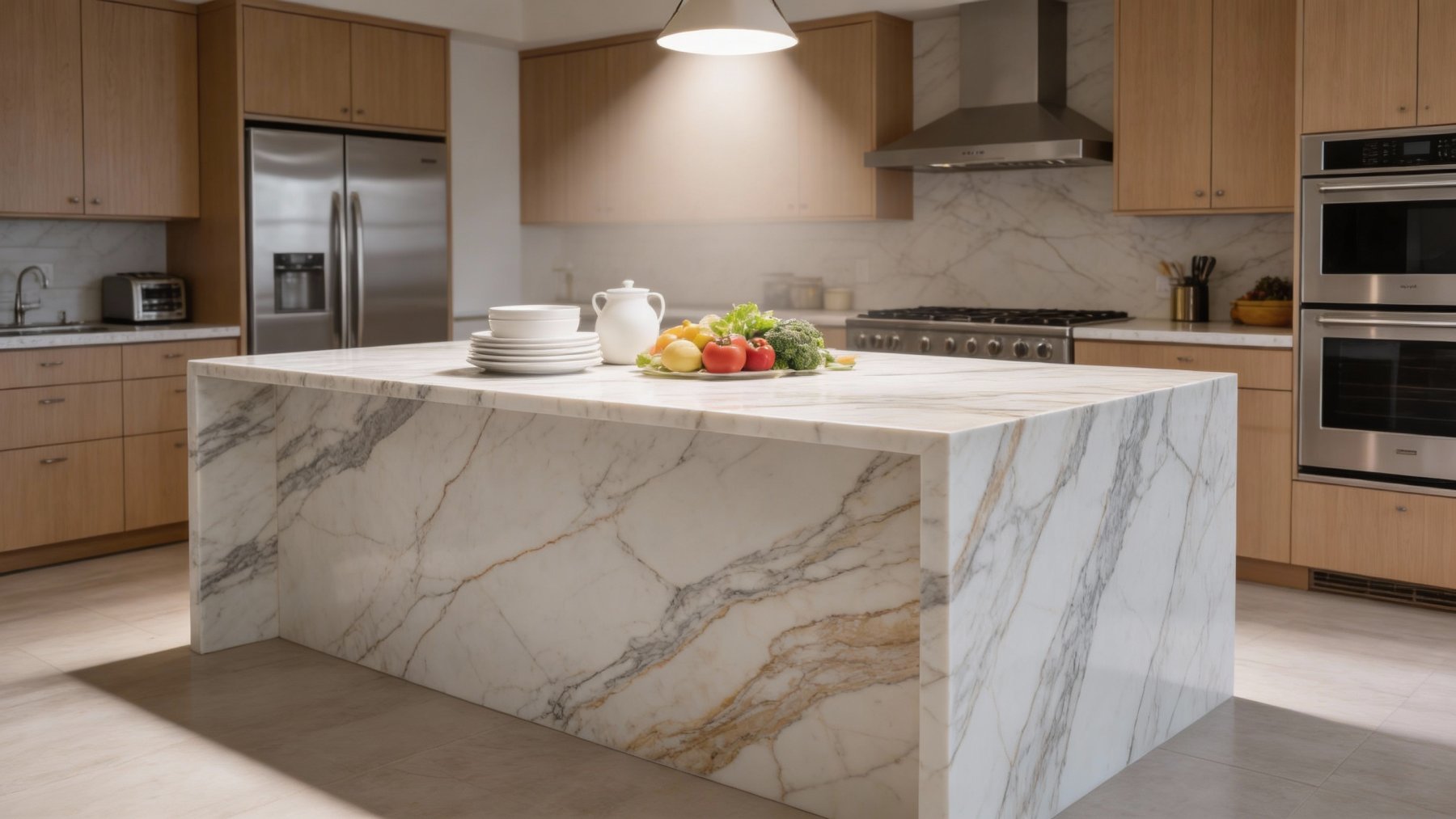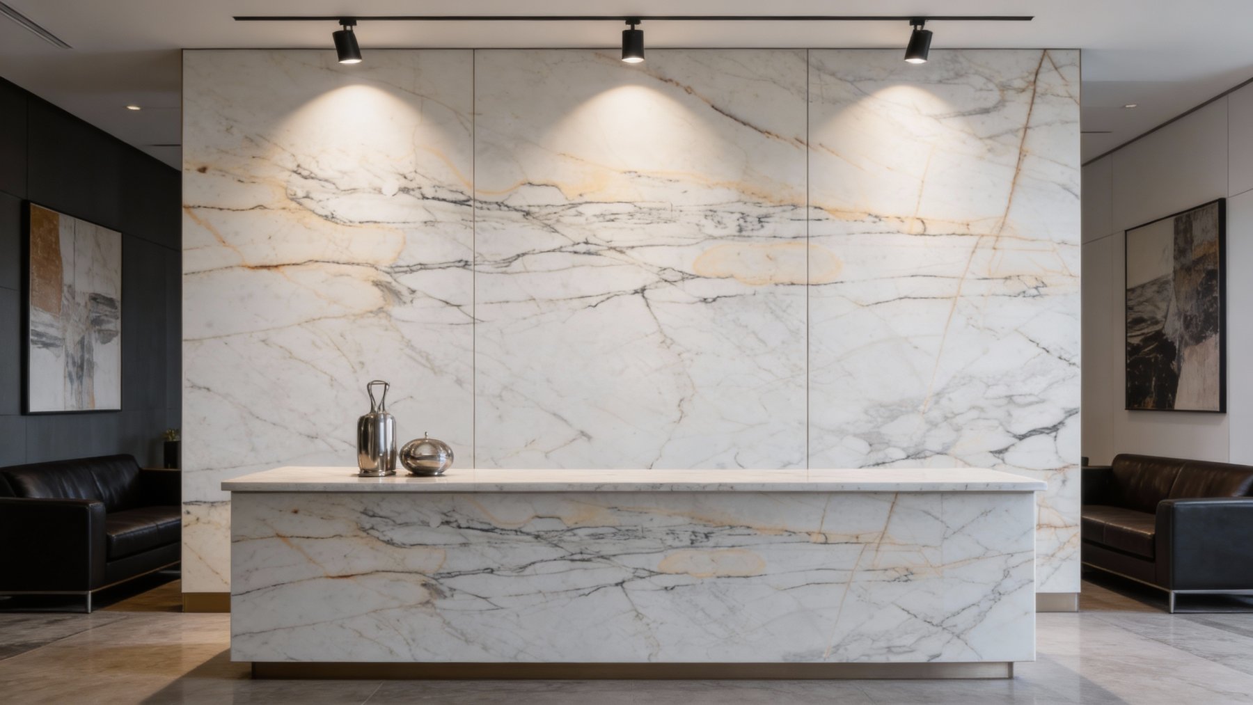 ### 底色基调 这款石材的底色基调为**温润雅致的浅白与米白色系**,间杂着朦胧的暖黄色调,整体明亮洁净却不失柔和质感,宛如清晨薄雾笼罩的初雪,既奠定了清新自然的视觉基底,又因暖调的融入避免了冷硬感,适配性极强。### 纹理形态 纹理呈现**自然流动的多元交织感**:深灰至近黑色的脉络状纹理纵横交错,或纤细如丝、或舒展如带,似天然石纹般随性分布,勾勒出石材的“骨骼”;同时点缀着淡金与暖黄色的不规则斑块及流云状条纹,与深色纹理相互碰撞、层次分明——如山水墨韵中晕染的鎏金余晖,无刻意雕琢的规整感,却自带生动的艺术韵律,仿佛将自然的岁月痕迹凝于一石。### 细节质感 细节处尽显**细腻温润的精致底蕴**:表面经精细抛光后,呈现出柔和内敛的光泽(非刺眼高光),触感应是平滑细腻却暗含石材的厚重质感。深色纹理边缘时而锐利分明、时而晕染朦胧,暖黄色调与浅白底色自然过渡,无生硬割裂感;整体既保留了天然石材的质朴肌理,又兼具现代工艺的光洁精致,视觉上雅致高级,触觉上舒适顺滑,尽显天然石材的独特魅力。
