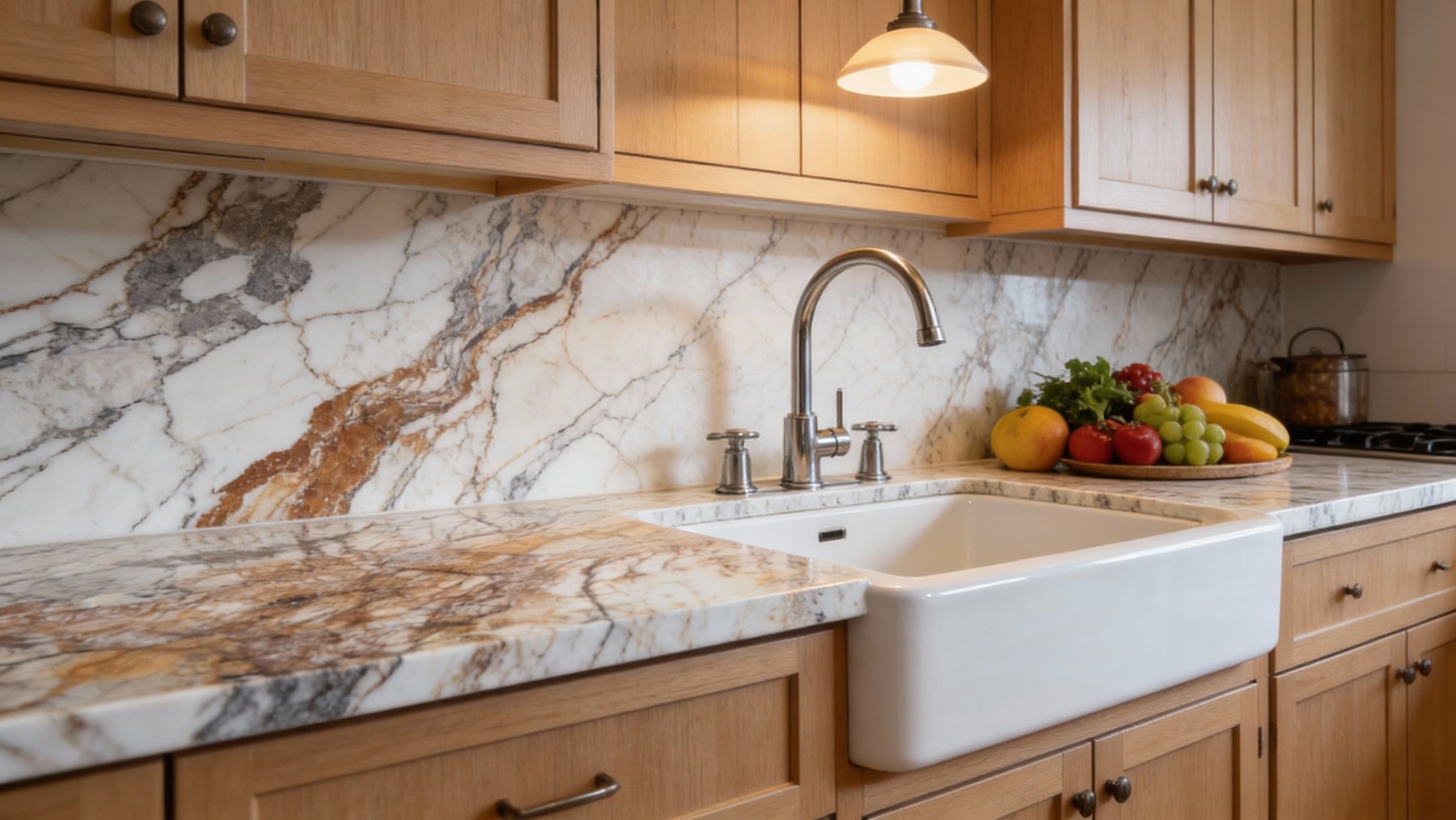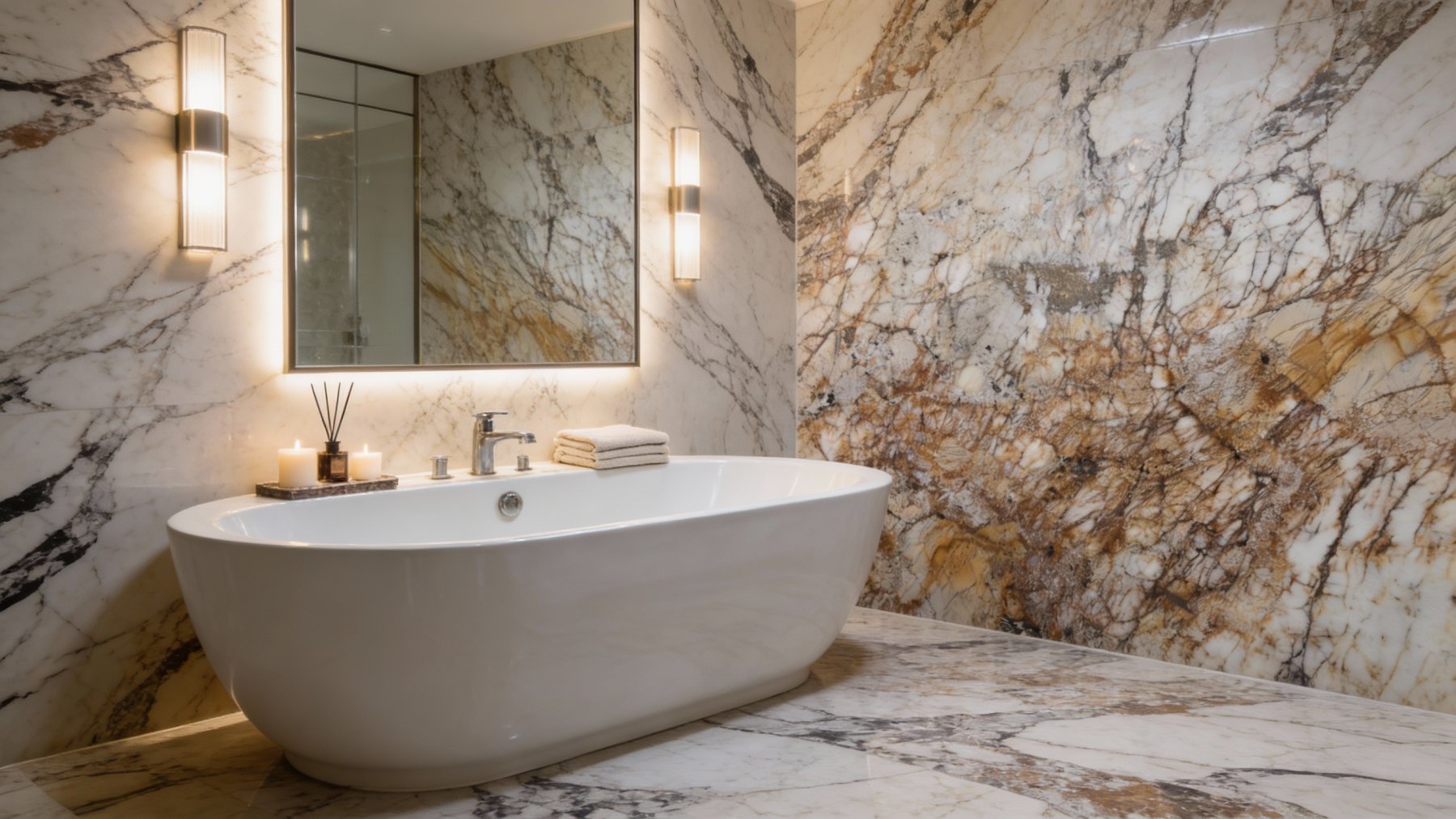 ### 底色基调 以暖白色与浅米色为核心基底,间杂若隐若现的淡灰色调,整体呈现柔和温润的浅暖色系。基底色调干净通透,既保留了天然石材的质朴感,又因暖调基底弱化了冷硬感,营造出舒适亲和的视觉基础。### 纹理形态 纹理以棕褐色、金棕色为主,辅以深褐色细密脉络,呈不规则网状交错分布。线条形态富有自然变化:时而纤细如丝,如毛细血管般蔓延;时而稍显宽厚,形成更具张力的脉络分支,相互缠绕、层叠,构成类似大地肌理或植物叶脉的有机图案。纹理分布密集却不杂乱,疏密有致的交错感赋予石材丰富的层次感,宛如天然形成的艺术纹路。### 细节质感 表面经抛光处理后光滑细腻,呈现温润的天然光泽,光线照射下反光均匀柔和。纹理边缘清晰却无刻意感,基底中可见细微的深色矿物斑点与浅色絮状纹理,增添了天然石材的独特性。整体质感坚硬致密,触感平滑细腻,既具备石材的厚重与耐用性,又因细腻的纹理细节与光泽感,透出精致优雅的气质。