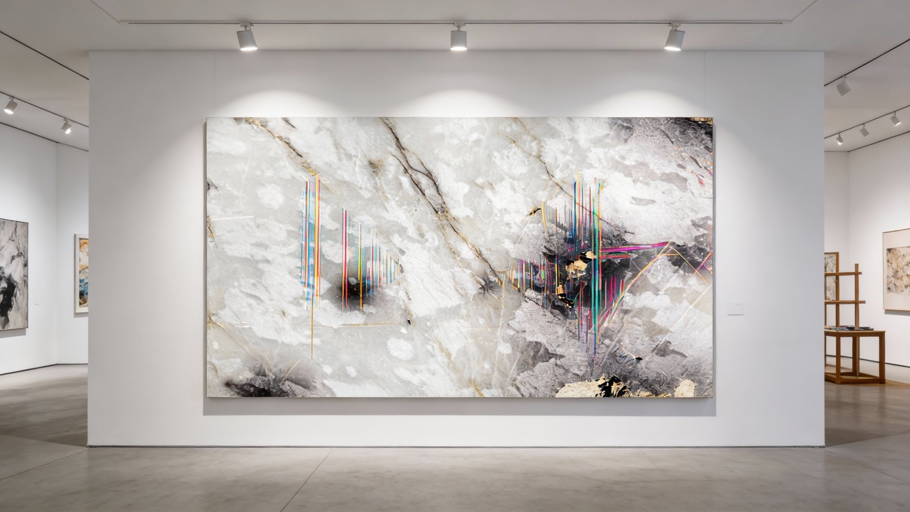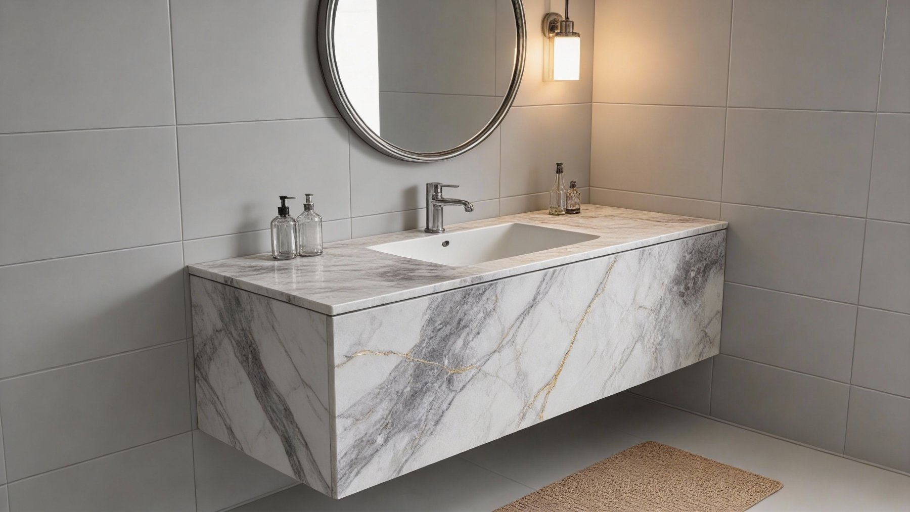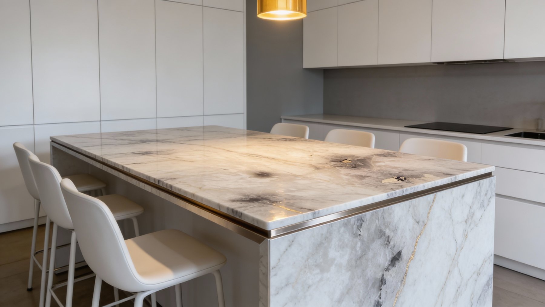 ### 底色基调 这款石材的底色基调以**浅灰白为主**,融合了柔和的米灰色调,整体呈现出淡雅清透的视觉效果,如同晨雾轻覆的浅滩,自带宁静舒缓的氛围感,既不会过于单调,也不会显得厚重,为空间奠定了雅致温和的基底。### 纹理形态 纹理以**自然随性的灰色系线条与斑驳色块交织**而成: - 线条粗细不一,时而纤细如丝缕般蜿蜒,时而舒展如飘带般流动,无规则却暗含韵律,似山间溪流的自然轨迹; - 同时夹杂着云雾状的朦胧晕染,局部区域有深浅过渡的灰黑色块,如同墨汁在宣纸上晕开的写意效果,层次丰富且灵动,赋予石材“虽由天造,宛如画成”的艺术感。### 细节质感 表面质感**细腻温润**,呈现柔和的半哑光或哑光效果: - 触摸时能感受到天然石材的温润肌理,而非冰冷光滑的镜面感; - 仔细观察可见细微的矿物颗粒与天然形成的小斑点,纹理晕染处的渐变过渡自然细腻,局部色块的边缘带有朦胧的模糊感,既保留了石材的质朴原生感,又兼具雅致的艺术质感。