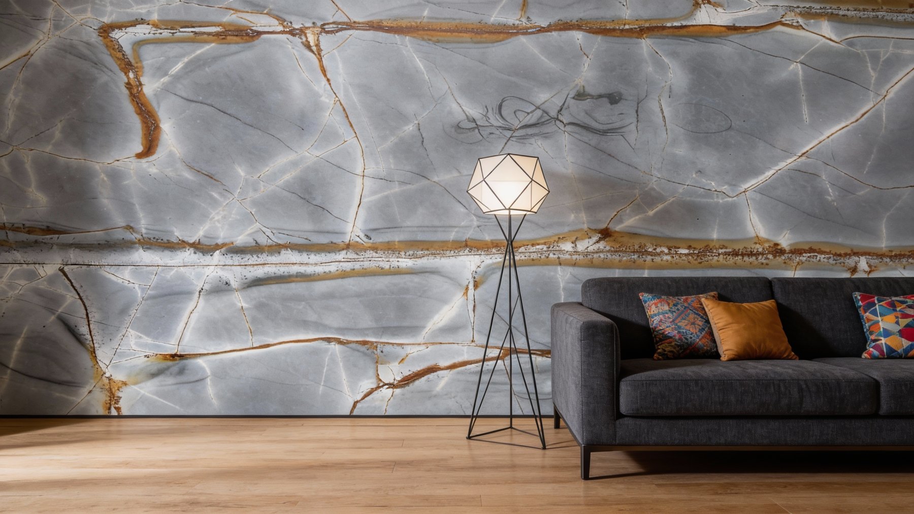 #### **1. 底色基调** 石材的底色基调为**浅灰至中灰色**,整体色调偏冷,呈现出沉静雅致的质感。灰色基底中隐约透着微妙的冷调光泽,既不沉闷也不过于张扬,为空间奠定了低调高级的基础氛围,适配现代、轻奢或极简等多种风格。#### **2. 纹理形态** 纹理层次丰富且富有对比性: - **纤细脉络纹**:遍布石材表面的白色/浅灰色细裂纹,如天然冰裂纹般纵横交织,像植物脉络一样勾勒出灵动的线条感,增添了石材的“呼吸感”; - **暖棕横向条带**:穿插着宽窄不一的暖棕色(或金褐色)横向条带,条带边缘自然过渡,与冷灰色基底形成鲜明的冷暖对比,打破单调; - **细节变化**:部分区域还点缀着不规则的细裂纹,让整体纹理既有序又充满自然随机性,避免刻板感。#### **3. 细节质感** 从细节质感来看: - 表面**光滑细腻**,触感应带有天然石材的温润与致密感; - 暖棕色条带区域蕴含细微矿物颗粒光泽,呈现半透明的温润质感,似天然玉石般的通透感; - 白色脉络纹清晰利落,如同天然形成的肌理,增强了石材的立体感与天然气息。整体质感细腻且层次分明,既有石材的坚硬属性,又不失柔和的视觉体验。