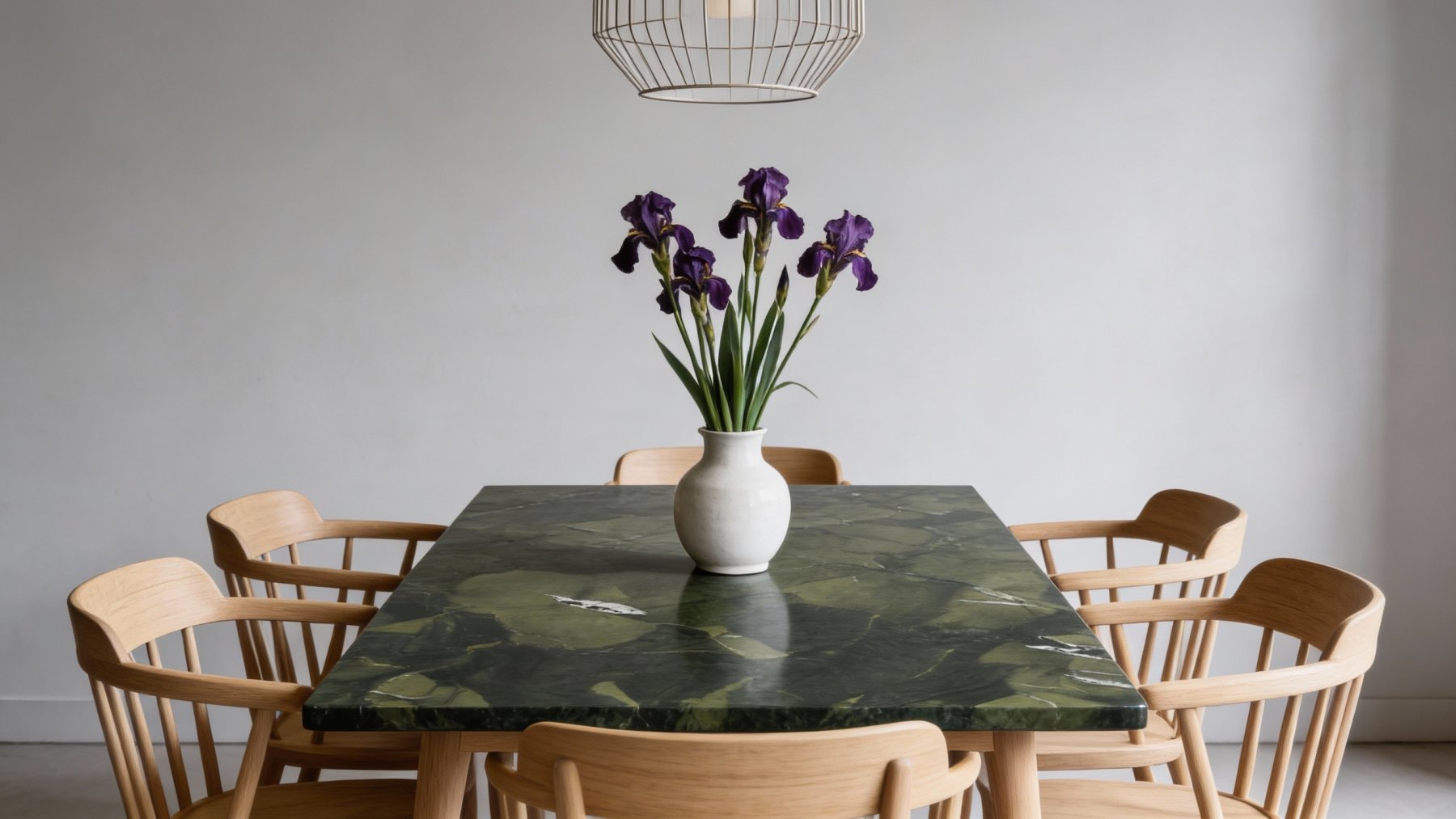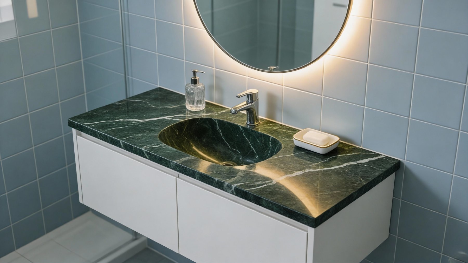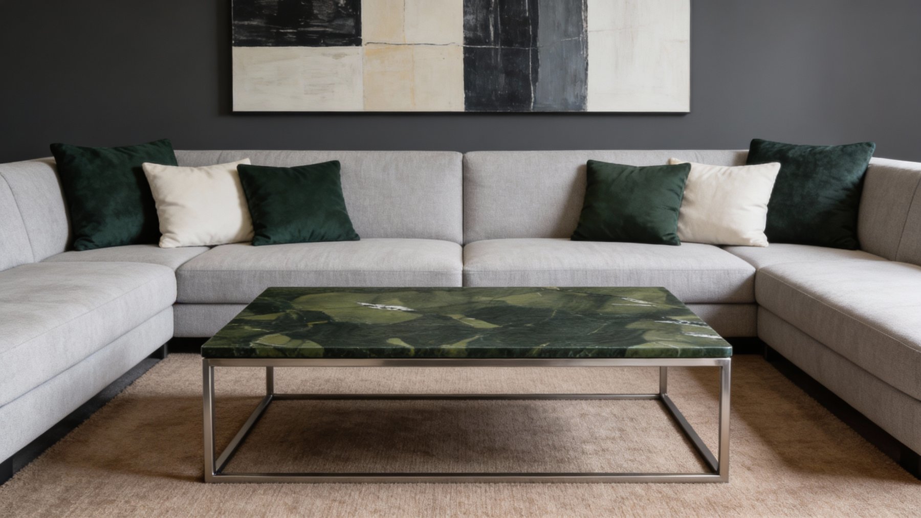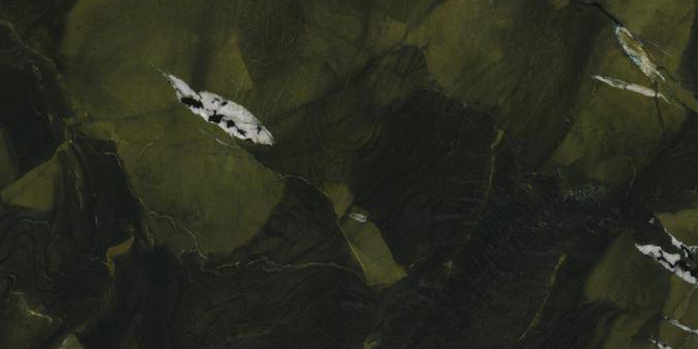 ### 底色基调 以**深墨绿**为核心基底,交织着**炭黑色**的深沉晕染,整体色调浓郁而沉稳,如同暮色中的森林秘境,自带静谧高级的氛围感。深浅色彩的过渡自然柔和,无生硬界限,似墨汁在宣纸上缓缓晕开的层次感,既保留了天然石材的厚重感,又透出古朴雅致的东方韵味,奠定了石材低调奢华的基调。### 纹理形态 纹理呈现**自然随性的流动感**:白色脉络似山间云雾般轻盈飘曳,或如溪流般蜿蜒穿梭于深绿与炭黑之间,形态不规则却富有韵律;深绿色块与炭黑色纹理相互交错,呈片状、条状的自然分布,无刻意雕琢的痕迹,每一处纹理都独一无二——仿佛是大自然亲手绘制的抽象画卷,既有“大江东去”的磅礴动感,又藏“云雾缭绕”的轻盈诗意。### 细节质感 表面肌理**细腻温润**,触之平滑如玉;白色纹理部分略带**通透感**,似凝脂般莹润,与深色基底的柔和哑光形成微妙质感对比;纹理边缘过渡自然,细微处可见深浅色交织的细腻层次,整体散发着**低调的微光**——既具天然石材的坚实厚重,又不失雅致的细腻质感,如同被时光打磨过的玉石,每一寸都藏着自然的精致。