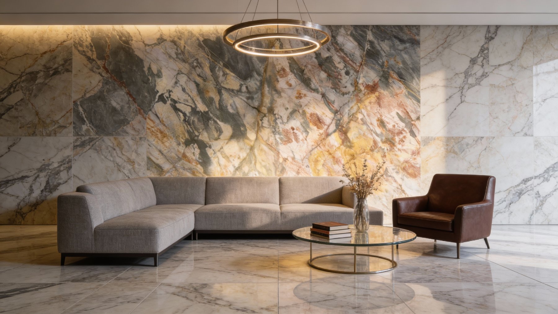 表面经抛光处理后呈现**细腻温润的光泽感**,触摸时平滑细腻;纹理边缘过渡自然,深浅色彩的叠加让质感富有层次——浅底色部分如凝脂般温润,深灰区域显沉稳厚重,棕红色斑块的视觉颗粒感增添了天然矿物的真实感。整体既保留了石材的坚硬质感,又因色彩与纹理的细腻交织,传递出雅致而富有生命力的视觉与触觉体验。