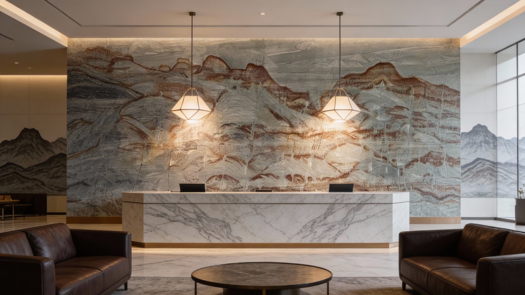 呈现出**层叠起伏的地质地貌意象**:红褐色的脉络如错落的峰峦轮廓,线条硬朗却不失自然过渡,构成视觉焦点;深浅不一的灰色肌理交织其间,似山谷褶皱或岩层剖面,纹理走向既有横向的层叠感,又有斜向的起伏动态,主次分明、层次丰富,仿佛将自然山川的壮阔微缩于石材之上。