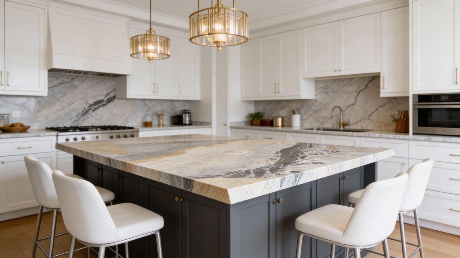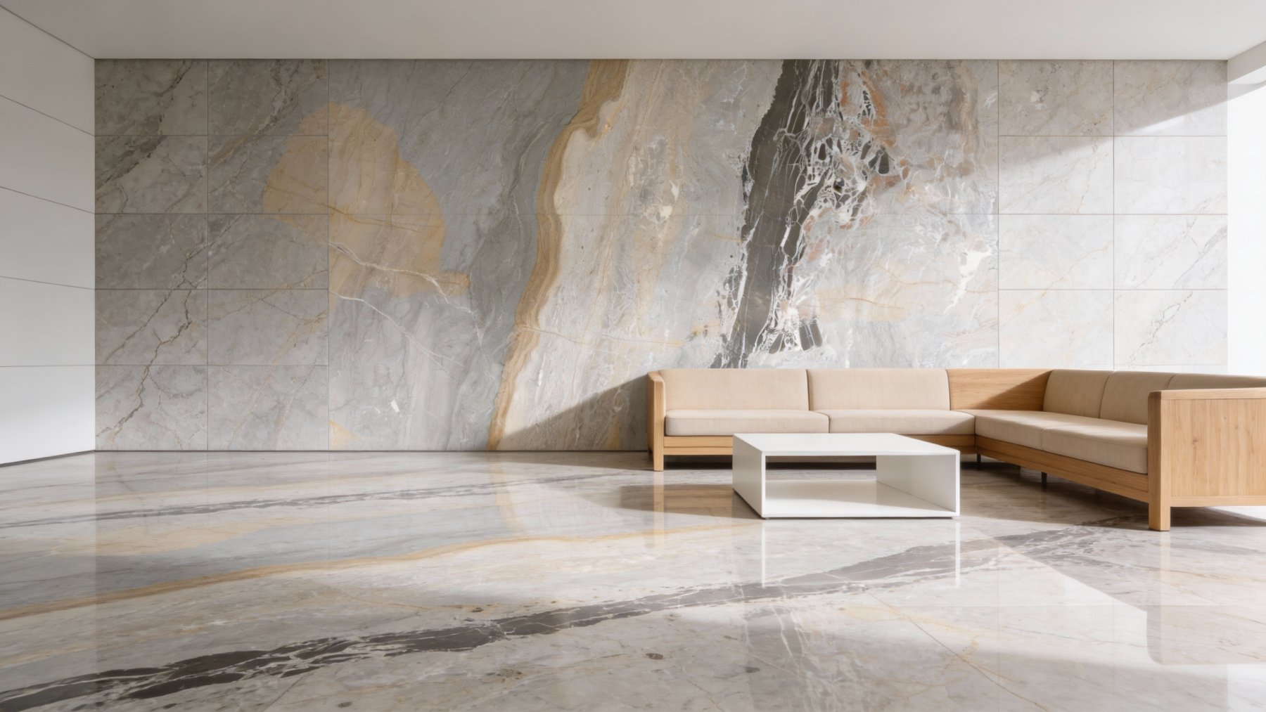 表面呈现温润细腻的石材质感:浅色调区域触感应平滑柔和,带柔光质感,细腻如凝脂;深色调区域因白色纹理的映衬,肌理层次更显立体,纹理边缘的自然晕染(如暖棕带与浅灰的渐变)增添了过渡的丝滑感;局部散落的微小矿物斑点(如淡黄绿小点)与细碎的絮状纹理,赋予石材原生的质朴感。整体光滑却不单调,兼具自然石材的厚重底蕴与灵动气息。