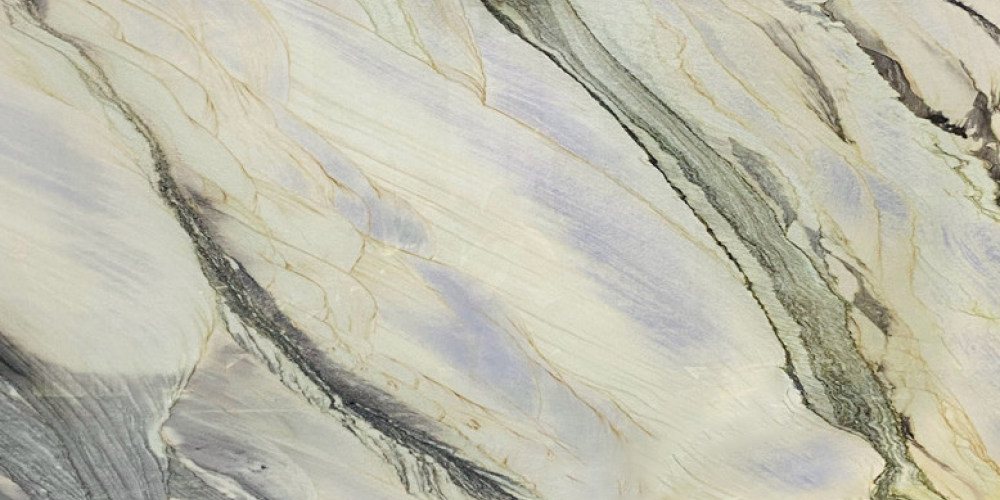 纹理呈现自然流动的脉络感,深灰近黑的粗线条与浅金色的纤细纹路交织错落:粗重的深灰纹理如山间溪流般蜿蜒穿梭,带着原生石材的苍劲;细碎的浅金色纹路则似阳光洒在水面的光斑,轻盈点缀其间;淡紫灰调以晕染方式与米白基底过渡,形成层次丰富的渐变效果。整体纹理无规则却尽显动态韵律,既有水墨写意的飘逸,又有天然石材的野性张力。
