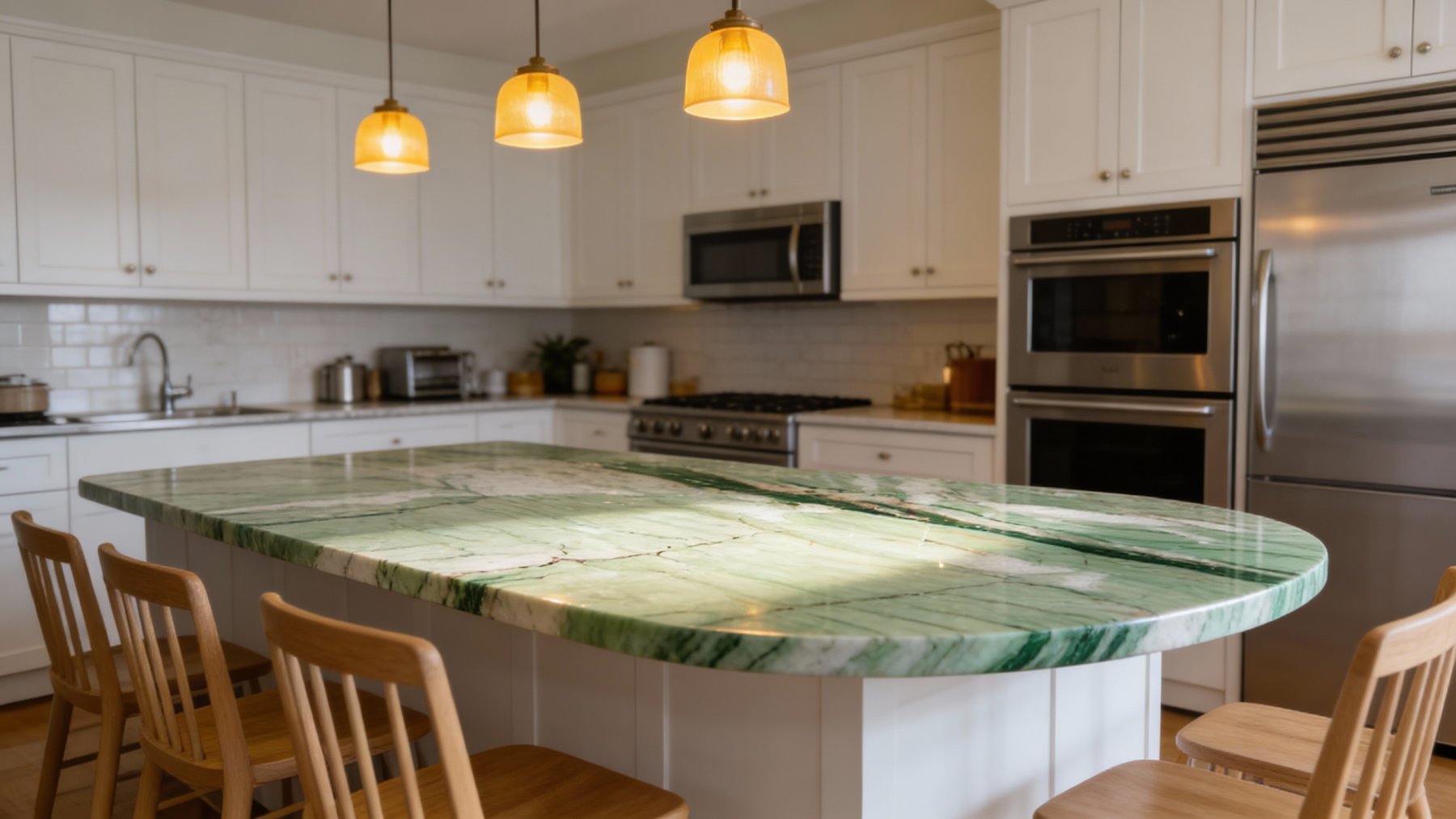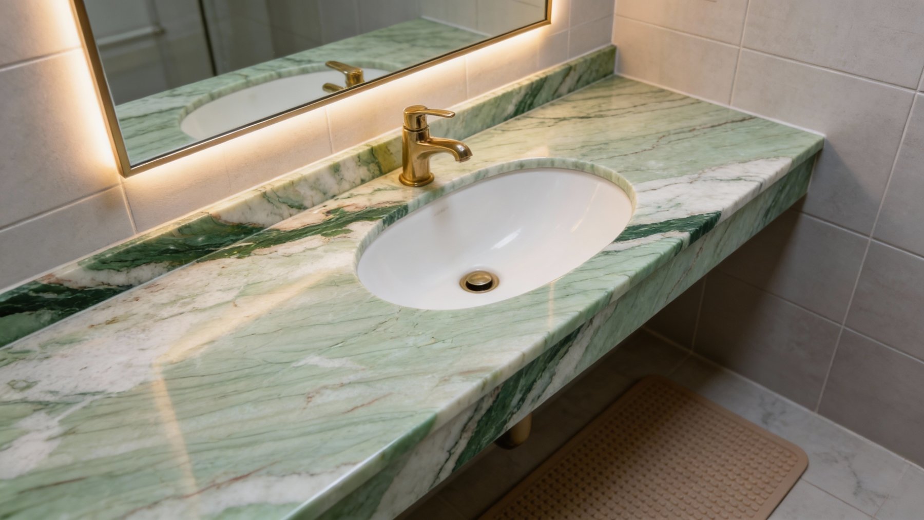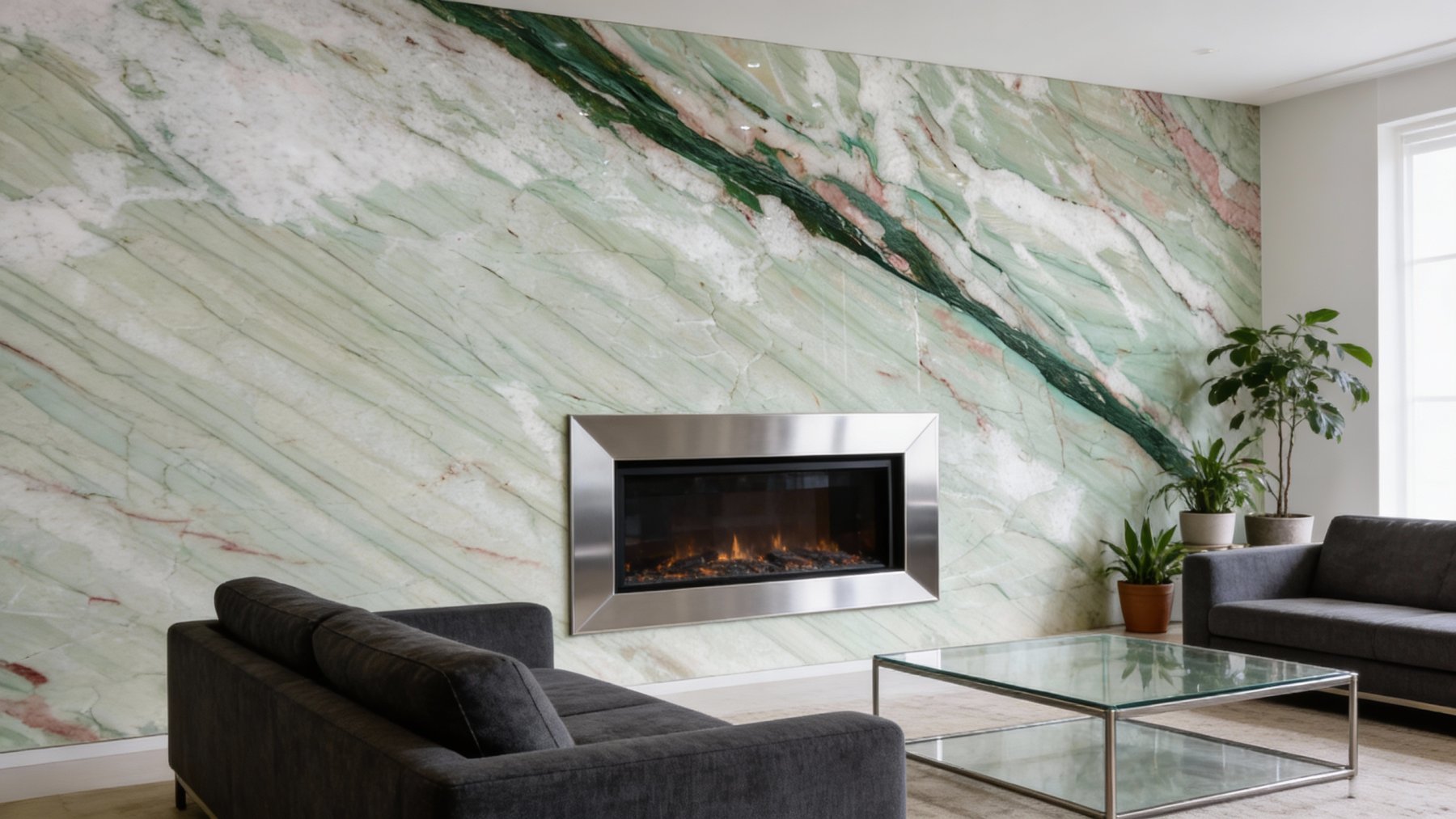### 底色基调 石材底色以**淡雅的浅青绿色与米白色交织**为主,基调柔和温润,似清晨薄雾中的青草地与柔光下的米白肌理相融,既无浓烈色彩的张扬,又不失自然清新的质感,整体呈现出一种静谧、雅致的视觉氛围。### 纹理形态 纹理呈**线性层状流动分布**,以斜向脉络为核心特征:一条深绿色粗脉如自然“肌理主线”贯穿画面,旁侧伴生细密的浅绿、米白及淡褐条纹,似岩层沉积的自然痕迹。纹理走向有序且富有动态感,非杂乱堆砌,而是如溪水般顺势流淌,层次分明,既有大面积的柔和铺陈,又有鲜明的脉络对比,赋予石材生动的自然韵律。### 细节质感 表面经抛光处理后**细腻光滑**,带有玉石般的温润光泽,触感应是冰凉而顺滑的。细节处可见颜色过渡自然柔和——深绿脉络与浅底色的边界并非生硬切割,而是渐变交融;细微的肌理纹路(如浅色区域的淡褐细纹)若隐若现,增添了自然的“呼吸感”。整体质感兼具石材的坚实与玉石的温润,精致中透着原始的自然张力,无刻意雕琢的痕迹。