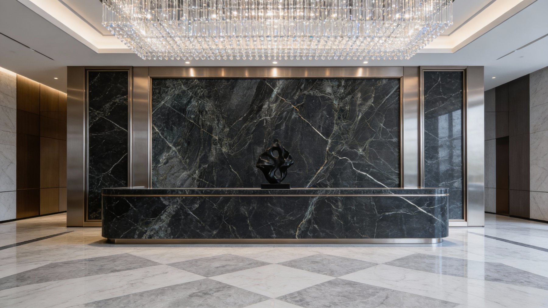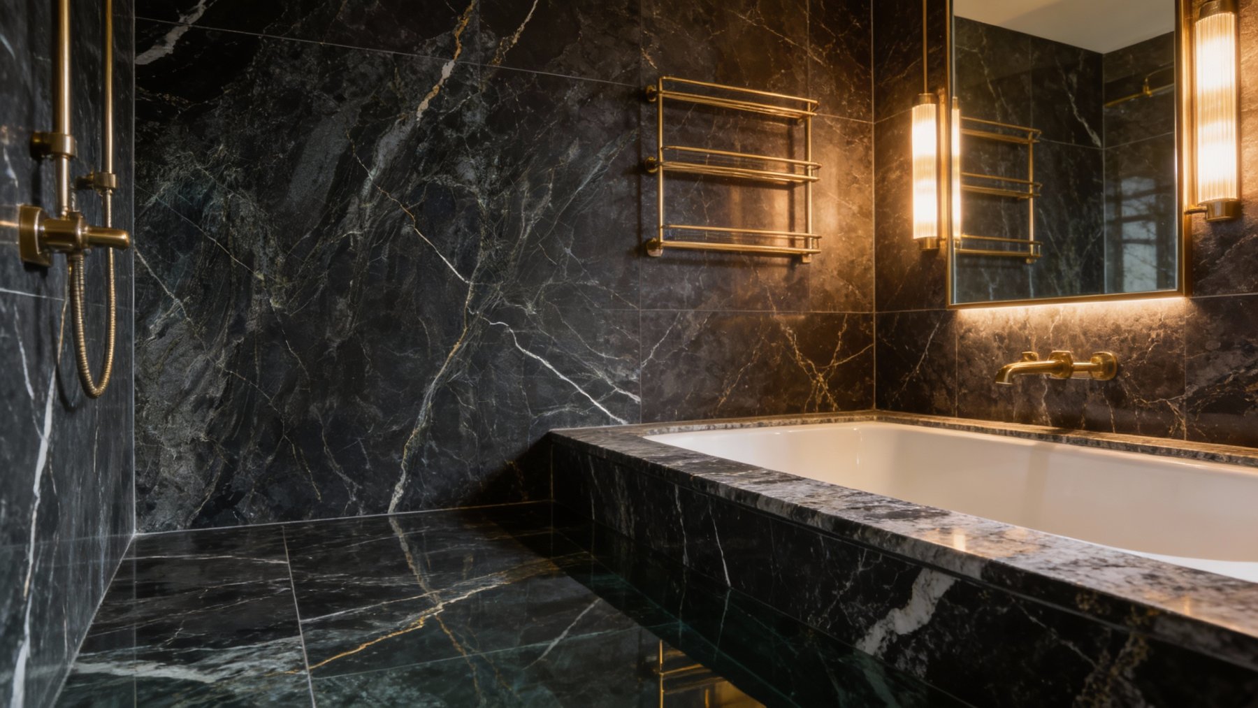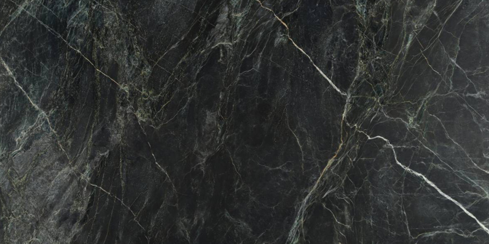 以深邃浓郁的**墨黑**为核心底色,间杂着暗灰与隐现的墨绿调,整体色调沉稳厚重,如深夜的墨池般静谧内敛,既保留了天然石材的原始深邃感,又因暗调中的细微色彩变化(暗绿、深灰)增添了层次,奠定了奢华而低调的视觉基底。