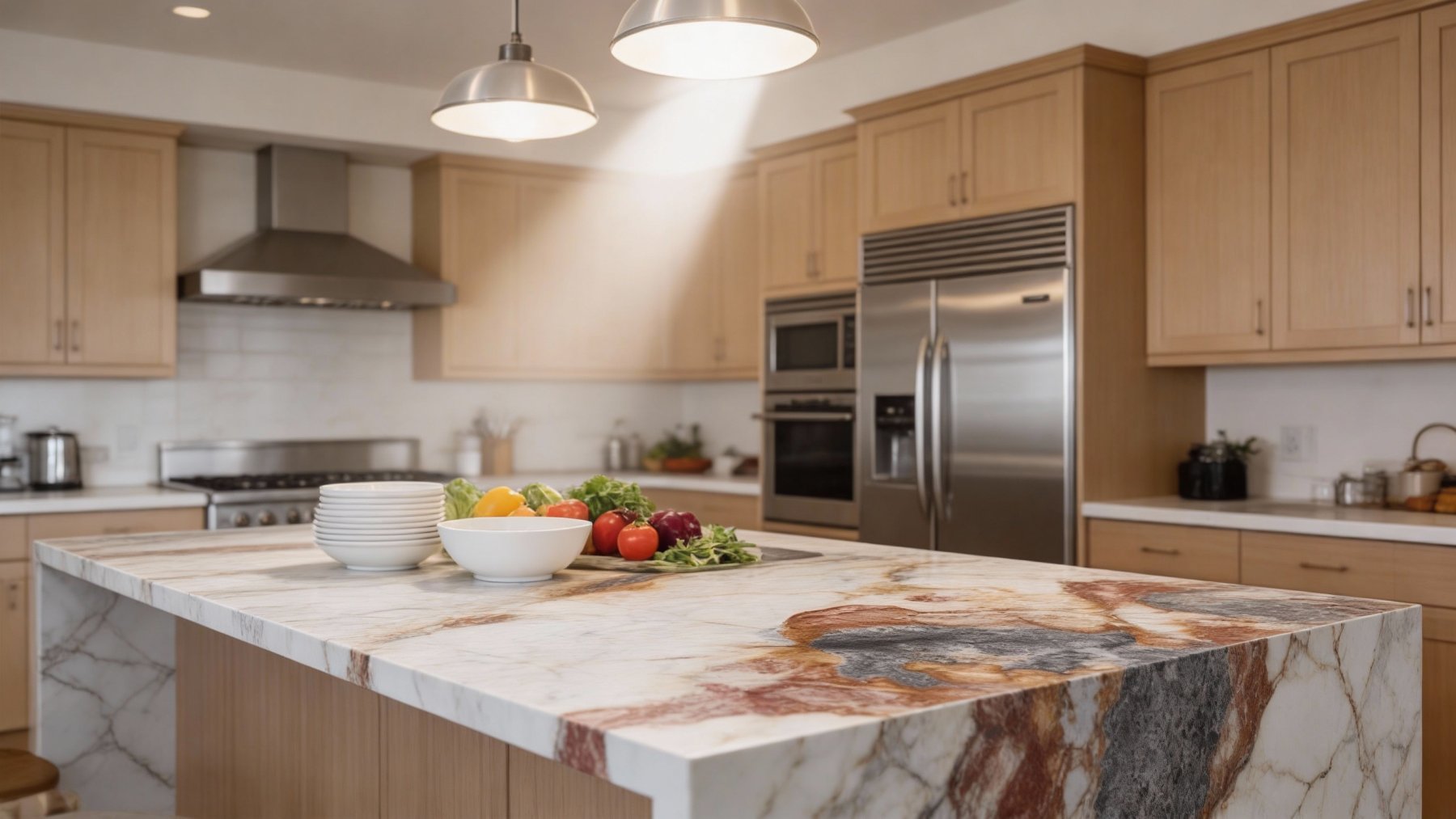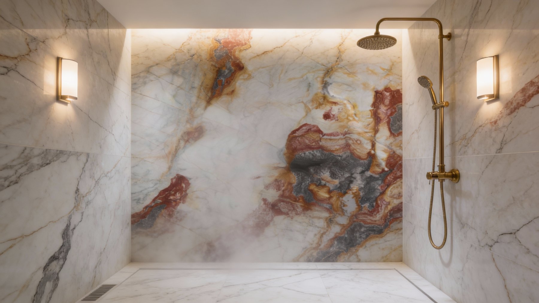 ### 底色基调 石材基底以**浅白色为主**,略带温润的米白或淡青底色,整体纯净透亮,如清晨薄雾般柔和雅致。干净的基底为纹理提供了清新的画布,既凸显了纹理的层次,又传递出自然清新的基调。### 纹理形态 纹理呈现**天然矿物浸染的流动感**:暖调的赭石色、铁锈红交织着深灰近黑的斑块,线条或蜿蜒如溪流,或层叠似云霞,或聚集成不规则色块。布局疏密有致——疏处留白透气,密处色彩浓郁,整体如一幅写意山水,动感与静谧兼具,每一处纹理皆为自然随机的艺术创作。### 细节质感 表面**细腻温润**,带大理石特有的柔和光泽,触感应光滑致密。红色区域色泽饱满浓郁,深色斑块沉稳厚重,浅色基底通透感强;纹理边缘清晰却不生硬,色彩过渡自然,展现出天然石材的细腻层次与质感,兼具视觉的雅致与触觉的顺滑。