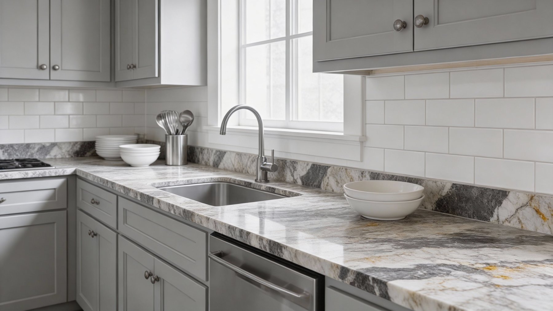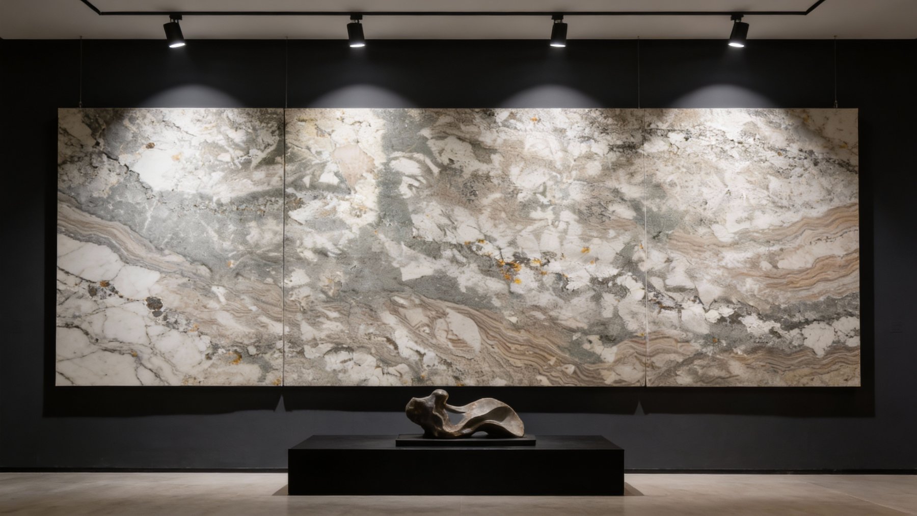 ### 底色基调 这款石材的底色基调以柔和的中性灰为主调,交织着浅米白与淡褐的自然晕染过渡,整体呈现出地质层积般的沉稳质感。色调无强烈冲突,温润内敛,既保留了天然石材的原始厚重感,又因色彩的柔和交织而不显沉闷,适配多种空间风格的基调营造。### 纹理形态 纹理形态丰富且富有地质韵律:上部以不规则块状与碎裂状纹理为主,似矿物结晶自然堆砌,边缘模糊随性;下部则渐变为层理分明的波浪状条纹,如地质沉积形成的自然层叠,线条流畅且带有轻微起伏感。两种纹理交织融合,边界过渡自然,既有块状纹理的力量感,又有条纹纹理的流动感,整体呈现出“静态沉积与动态结晶”并存的自然肌理。### 细节质感 细节质感层次饱满:表面蕴含细腻的颗粒感,可见零星分布的浅黄矿物斑点(似铁氧化物结晶),增添了天然生动性;整体质感偏向哑光或半哑光,触感应是细腻中带着轻微的磨砂粗糙感,无明显尖锐起伏,但能感知到不同纹理区域的质感差异——浅色斑块部分更显温润细腻,深色条纹区域更显沉稳厚重,黄色颗粒则带有微小的凸起颗粒感,尽显天然石材的原始质感与细节张力。