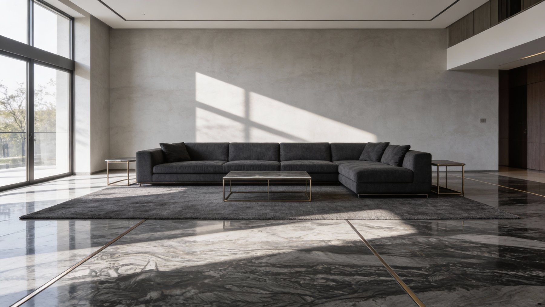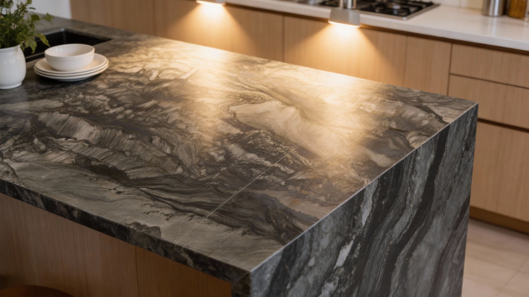 石材底色以**深灰为基底**,交织着墨黑的厚重质感,整体呈现冷调沉稳的视觉氛围,似暮色笼罩下的山林,低调中透着深邃静谧的张力,无张扬之色却自带高级感。