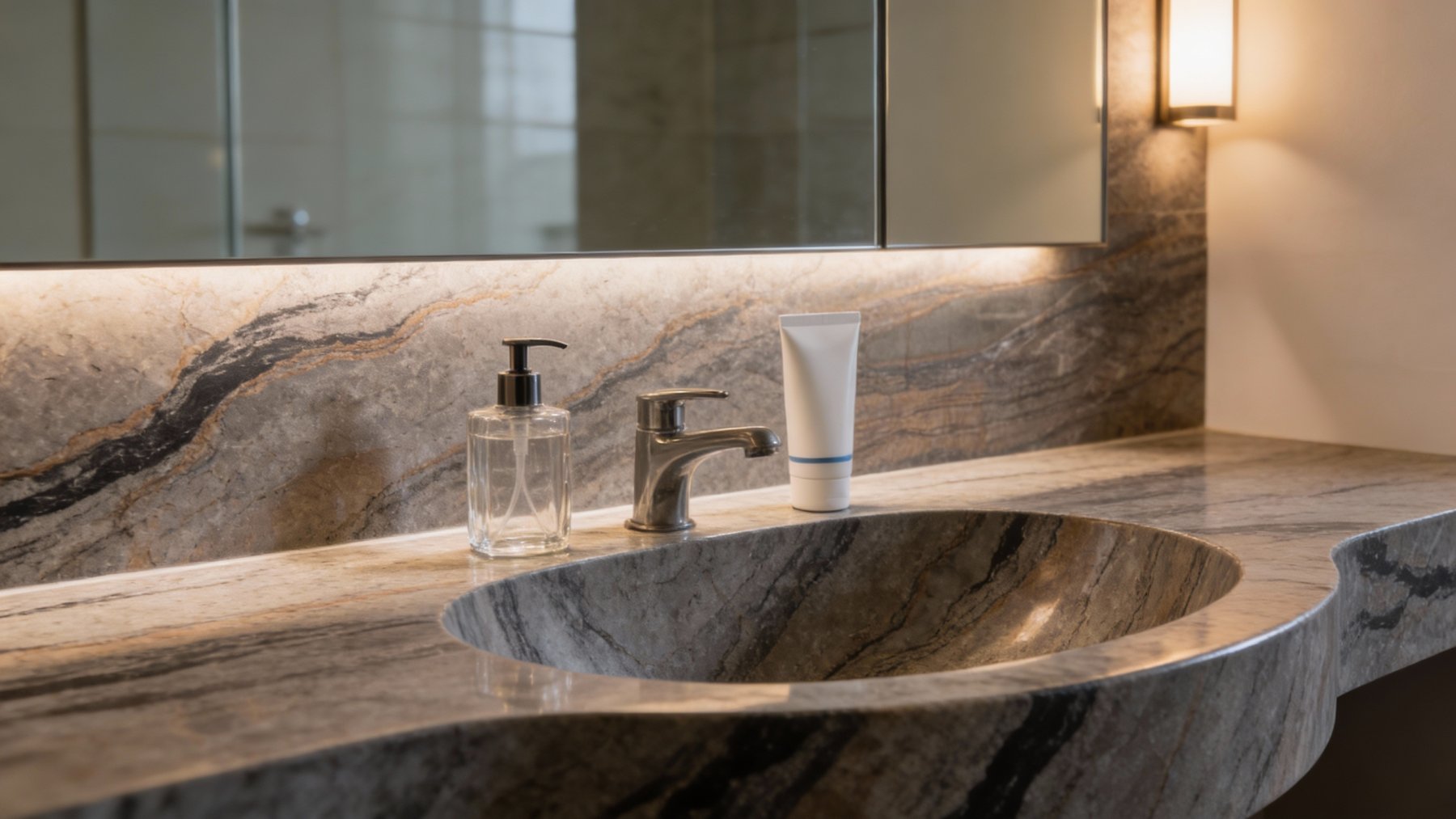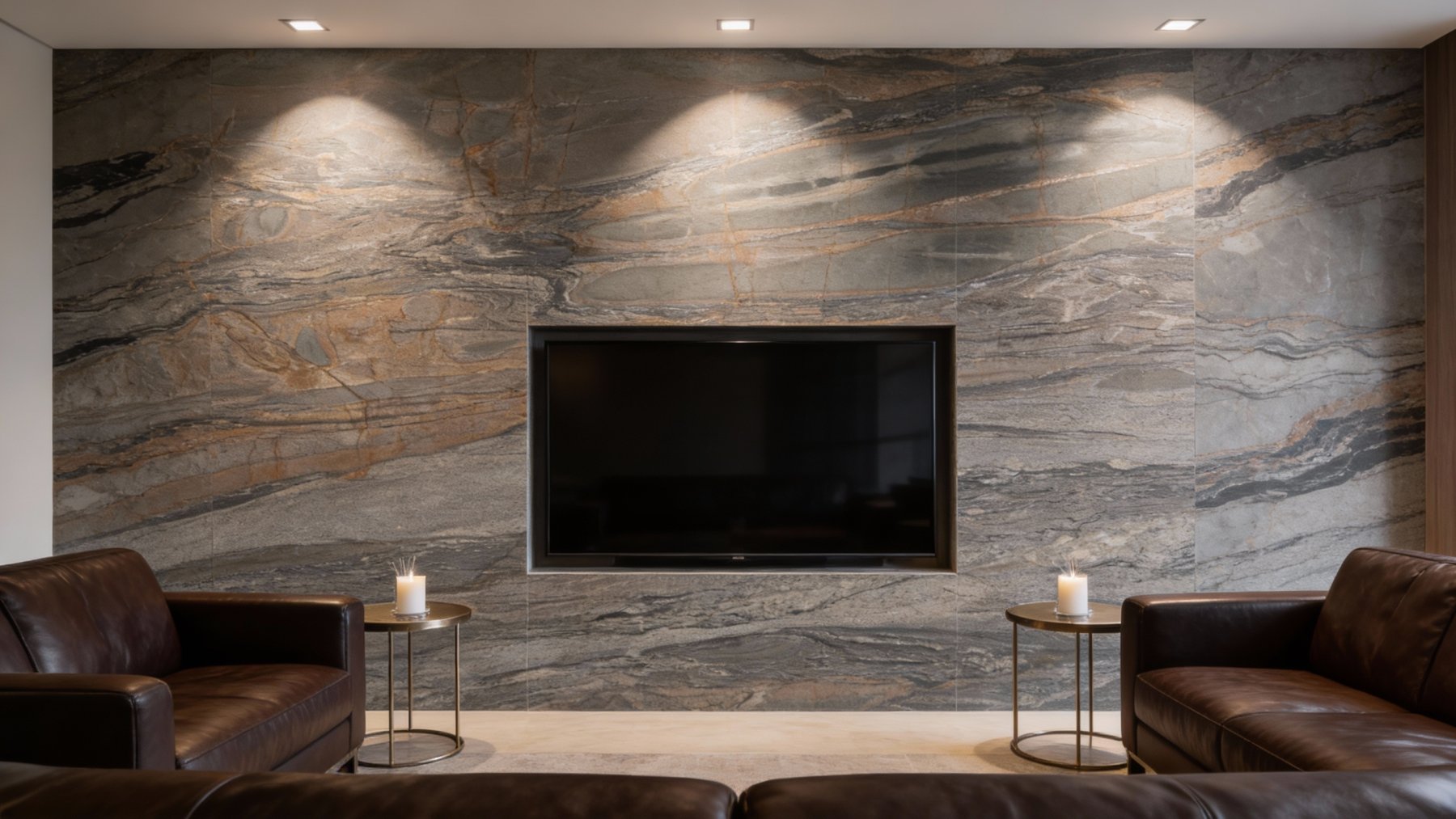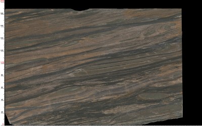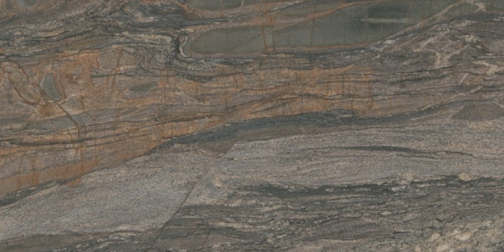 ### 底色基调 这款石材的底色以**深灰色与灰褐色交织的复合色调**为主,整体基调沉稳厚重,兼具中性色的内敛与自然矿物的质朴感。底色并非单一纯色,而是由深浅不一的灰褐、炭灰、暗棕等色调自然融合,形成富有层次的基底,既不张扬也不失质感,为纹理提供了沉稳的衬托。### 纹理形态 纹理呈现**自然流动的层状与脉络状交织形态**,仿佛地质运动中岩层挤压形成的天然肌理: - 主体为深浅过渡的灰黑色层状纹理,走势蜿蜒起伏,带有柔和的波浪感,如同缓慢流动的岩层; - 其间穿插着**暖棕色(或橙褐色)的细脉纹理**,线条纤细却清晰,如矿物沉淀的痕迹般点缀其中,打破了深色基底的单调; - 局部还夹杂着细碎的斑驳色块与不规则的纹理节点,整体纹理连续且富有动态感,既有大面积的层状延伸,也有局部的细节跳跃,呈现出天然石材的随机与生动。### 细节质感 表面质感偏向**细腻却不失天然肌理的半哑光质感**: - 触感应是温润且带有细微颗粒感的,并非完全光滑的镜面效果,保留了天然石材的原始肌理,但经过处理后又显得细腻柔和; - 深浅纹理之间的过渡自然无生硬边界,暖棕色细脉的边缘略带模糊感,仿佛天然矿物渗透的痕迹; - 整体光泽内敛,不反光刺眼,却能在光线下隐约透出纹理的层次感,细节处的矿物颗粒与纹理脉络相互呼应,赋予石材丰富的触觉与视觉层次。