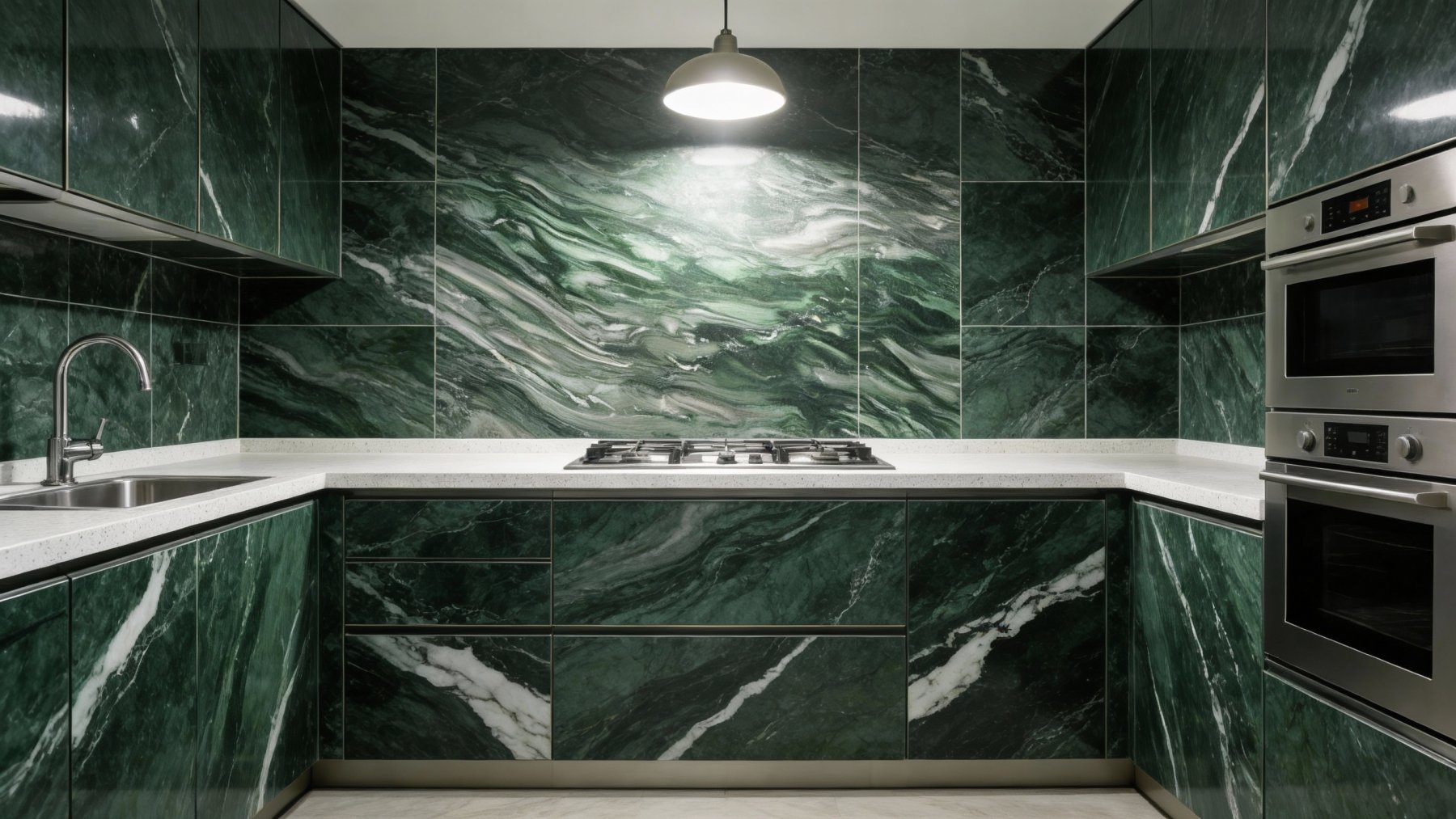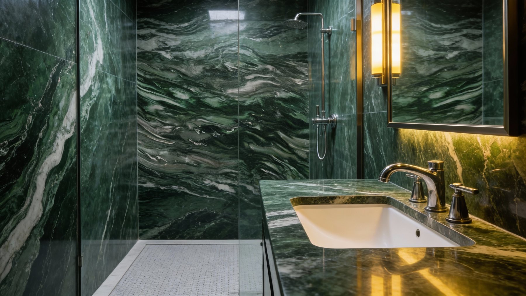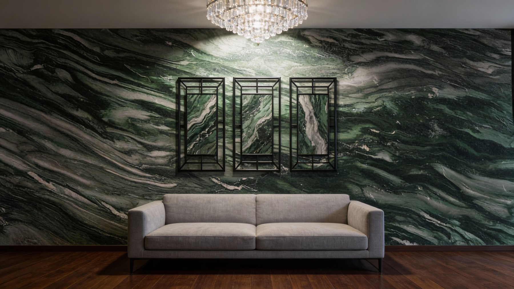 #### 1. 底色基调 石材底色以**深邃浓郁的墨绿**为核心基调,交织着近黑的沉郁色块与浅灰绿、银灰的过渡层次,整体色调沉稳厚重却不沉闷——墨绿的浓郁赋予空间静谧感,近黑的深沉增添质感,而灰绿与银灰的点缀则打破单调,形成富有呼吸感的色彩层次,既保留自然石材的原始张力,又透出低调奢华的大气。 #### 2. 纹理形态 纹理呈现**层叠蜿蜒的流动态势**,似山间云雾的缥缈舒展,又若深海波浪的轻柔起伏:粗细不一的线条相互交织、晕染,时而密集如织,时而疏朗如练,无规则却暗含韵律感。仿佛将自然的动态瞬间凝固,每一处纹理都独一无二,如写意山水般灵动,自带“移步换景”的视觉趣味,为空间注入艺术张力。 #### 3. 细节质感 表面质感**细腻温润**,带有柔和的自然光泽:深色区域浓郁醇厚,触感应平滑致密;浅色纹理(如银灰、浅绿线条)则隐约透出丝绒般的细腻光泽,似云母碎屑般暗藏微光,却不刺眼。整体视觉上层次丰富且富有深度,既具备石材的坚硬质感,又兼具玉石般的温润底蕴,摸起来顺滑亲肤,尽显高端石材的精致与质感。
