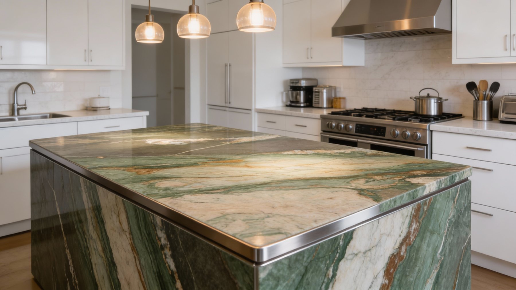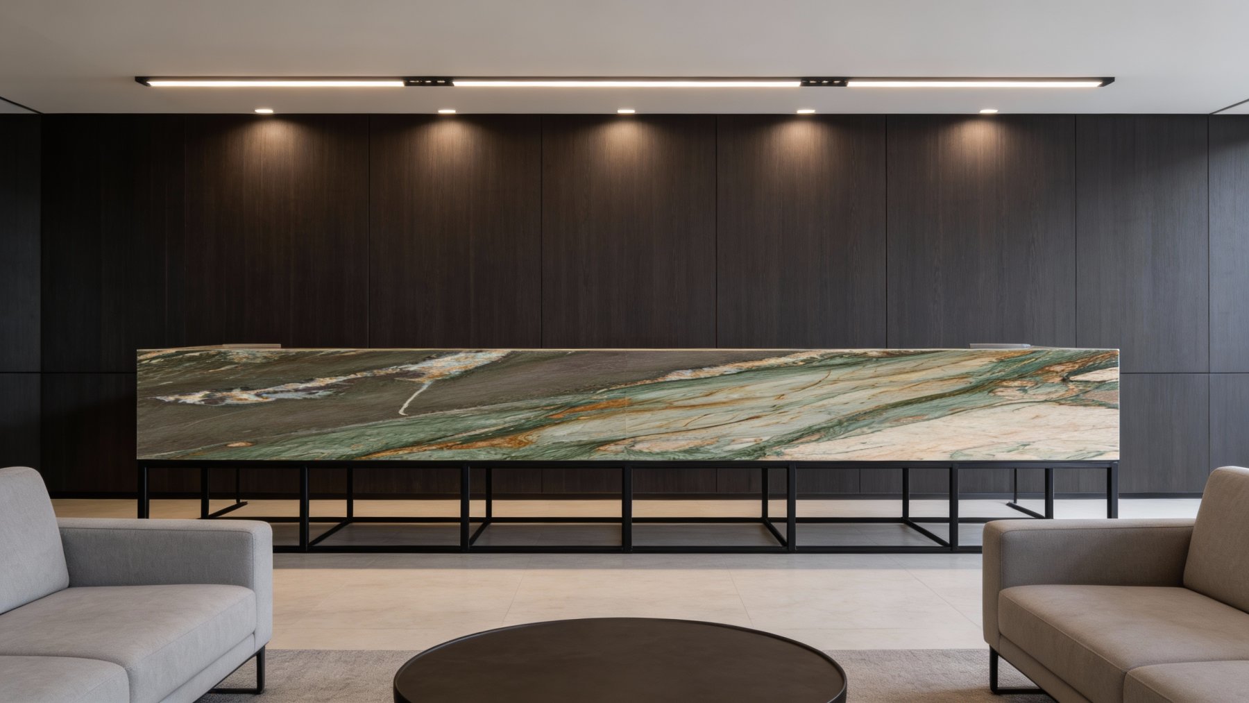 表面质感细腻温润,带有天然石材特有的致密光泽。墨绿色区域蕴含着细微的矿物结晶闪光,在光线下隐约透出玉石般的温润感;棕金色纹路则呈现出丝缕般的肌理层次,触感平滑却不失天然的肌理细节。整体既具备石材的厚重致密性,又带有类似玉石的细腻光泽,视觉上厚重而不笨重,触感上平滑却富有层次变化,尽显天然石材的独特质感。