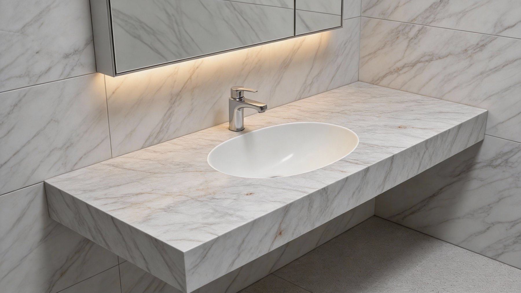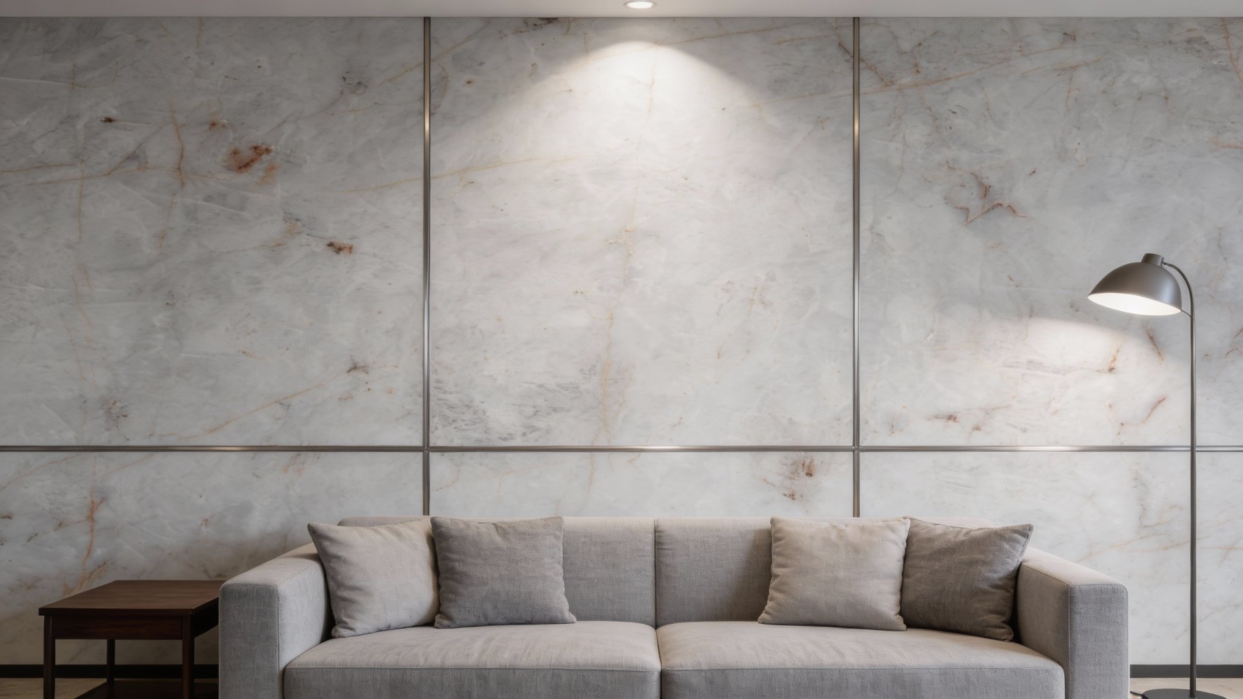 这款石材的底色以**浅灰白色**为主调,色调柔和雅致,不张扬刺眼,呈现出一种干净清爽又略带朦胧温润的质感,仿佛蒙上一层细腻的薄雾,给人静谧舒适的视觉感受,无强烈色彩冲突,适配性强。