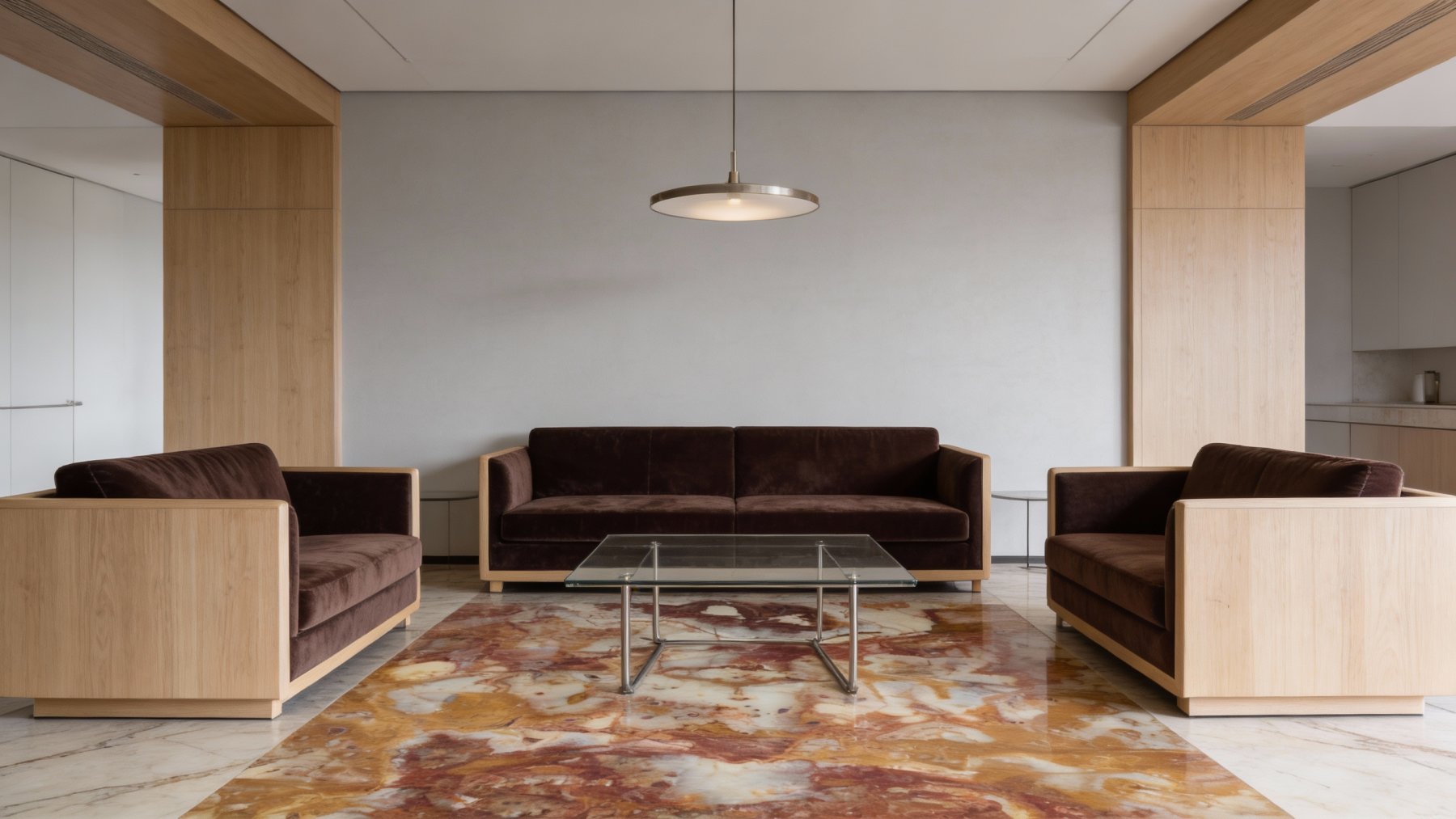 表面质感**细腻温润,自带柔和光泽**:浅色区域隐约透出半透明的玉质感,仿佛蕴含着温润的油脂光泽;纹理交汇处的色彩过渡自然柔和,无生硬边界;细微处可见天然矿物形成的星点斑点(如浅底色上的细小深色颗粒),增添了肌理的独特性;触摸时应能感受到石材的致密顺滑,兼具天然石材的厚重感与细腻触感,整体散发着低调奢华的天然气息。