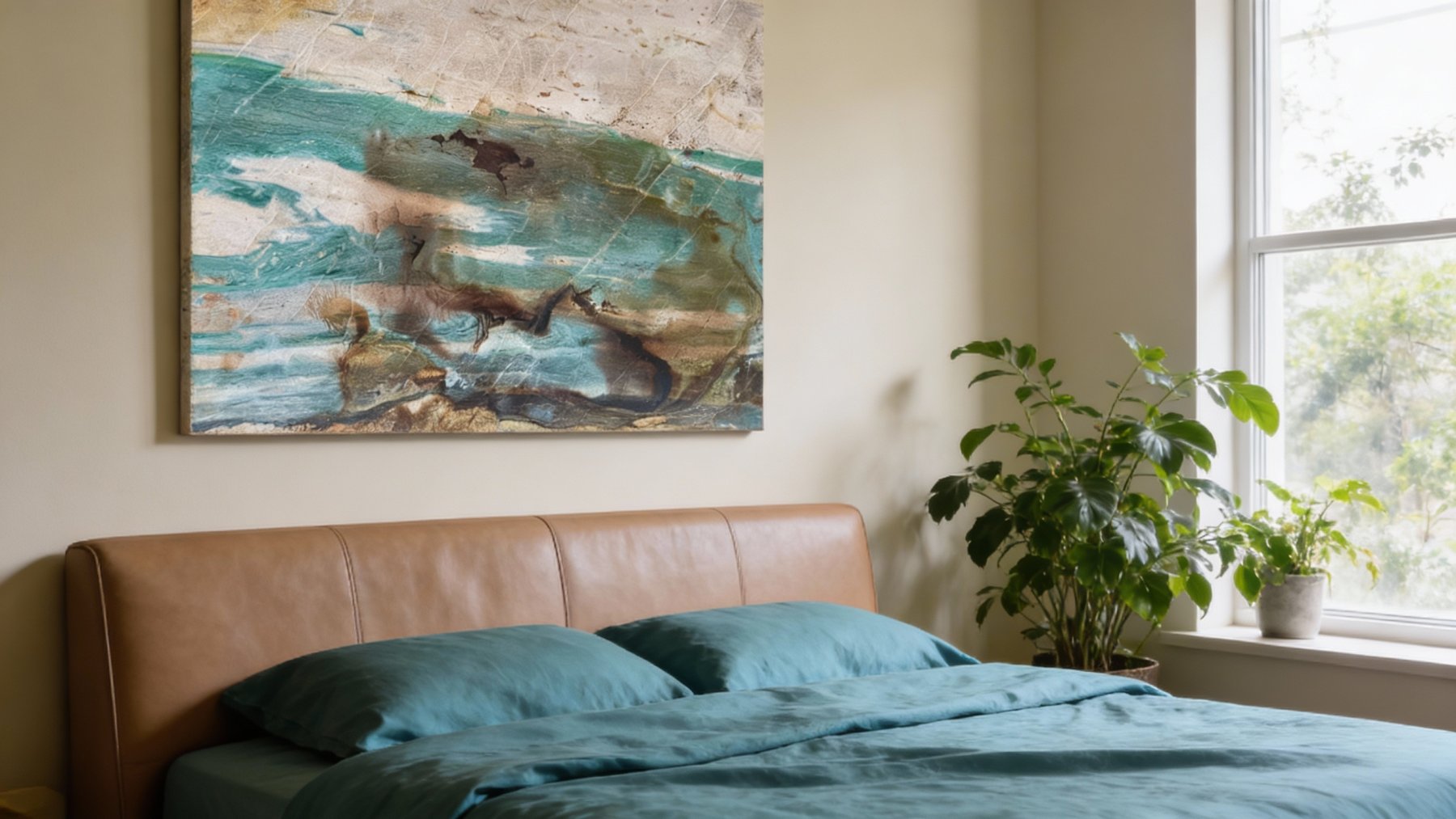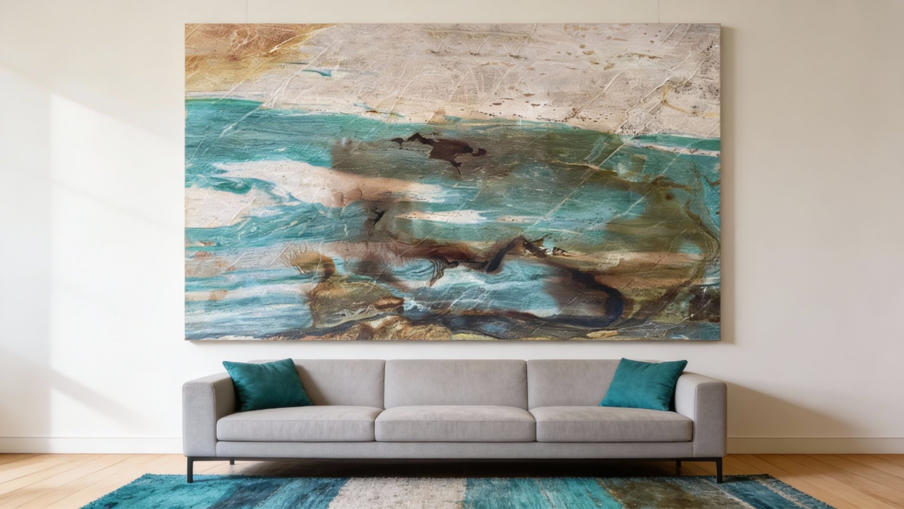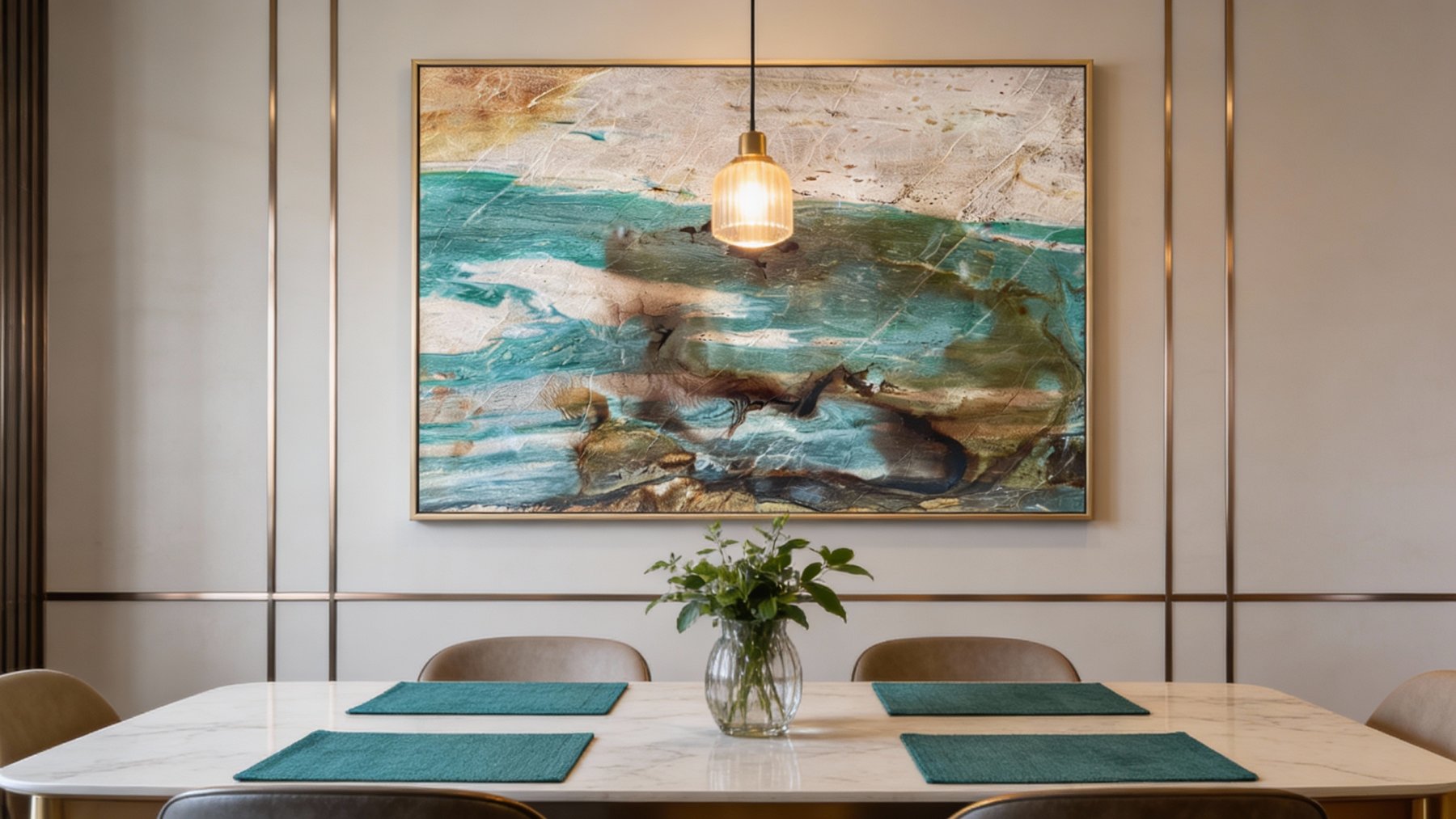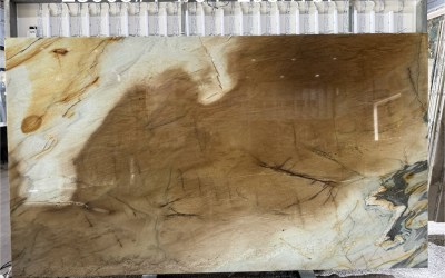 ### 底色基调 石材底色呈现**冷暖交织的分层质感**:上部以暖调浅米色为基底,间杂淡灰与微褐的斑驳肌理,似经岁月风化的岩石表层,质朴温润;下部核心为冷调蓝绿色系,从清新薄荷绿渐变至深邃孔雀蓝,融入浅灰、奶白的过渡色块,冷暖碰撞形成丰富的视觉层次,宛如自然地貌的缩影。### 纹理形态 纹理以**自然流动的动态曲线**为主,兼具“水波纹”与“云雾晕染”的双重意境:蓝绿色区域内,近黑褐的深色斑块如墨滴沉落般散布,或聚集成团、或延展成纤细线条,与浅底色的细腻纹路相互穿插;线条粗细变幻无章,时而舒展飘逸(如溪流漫淌),时而紧凑交织(似云雾卷舒),整体无规则却充满韵律感,仿佛记录了矿物沉积时的动态过程。### 细节质感 表面质感**温润多元**:蓝绿色区域带有半透明的莹润光泽,似玉石般通透细腻;浅米色区域呈哑光肌理,局部可见细微的天然石纹(裂隙感),增添岁月沉淀感;深色斑块质感深沉厚重,与周围通透纹理形成对比,触感应兼具光滑与细微颗粒感,整体既保留天然石材的质朴,又蕴含玉石的温润层次,细节处尽显自然造物的精妙。