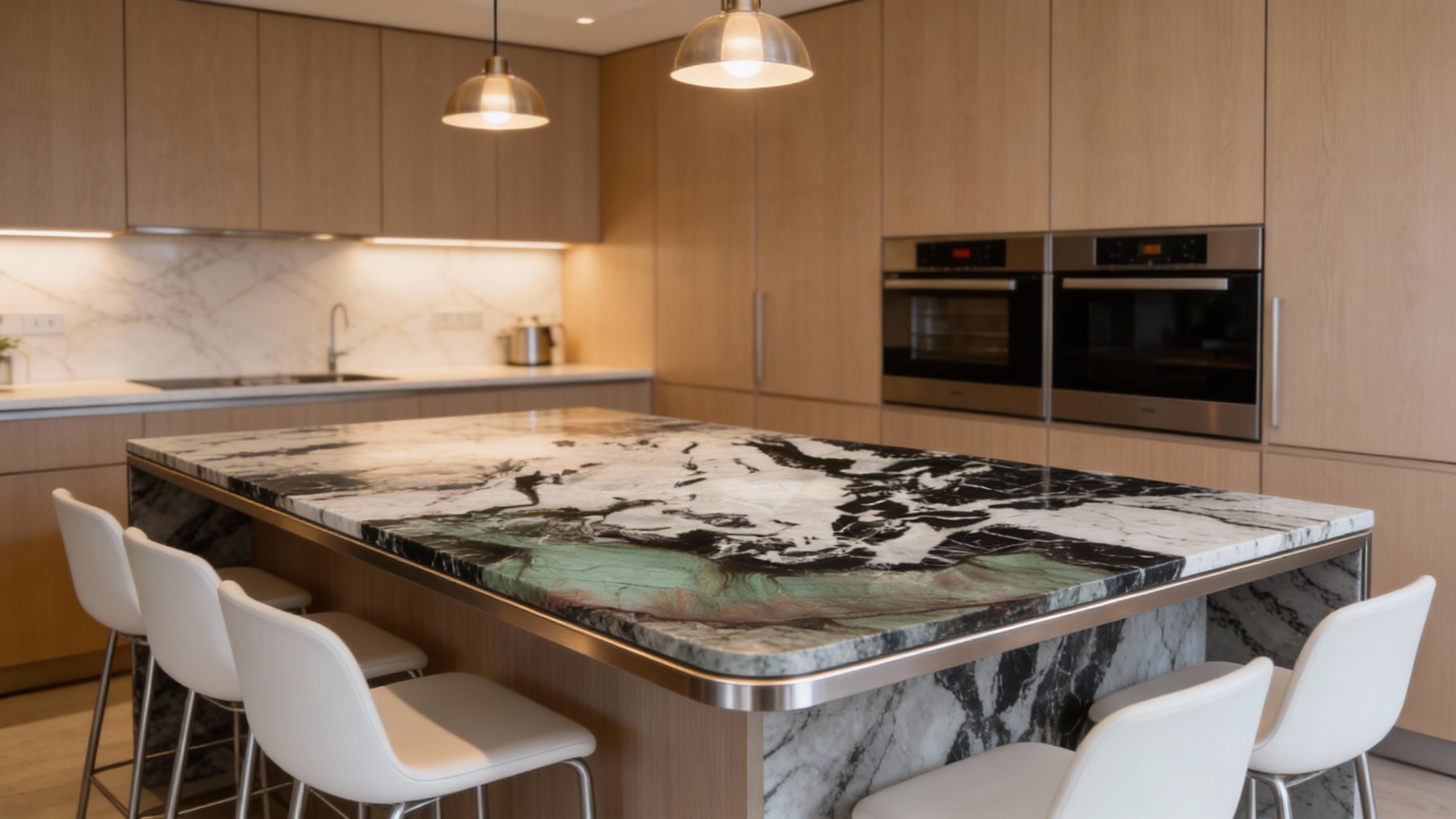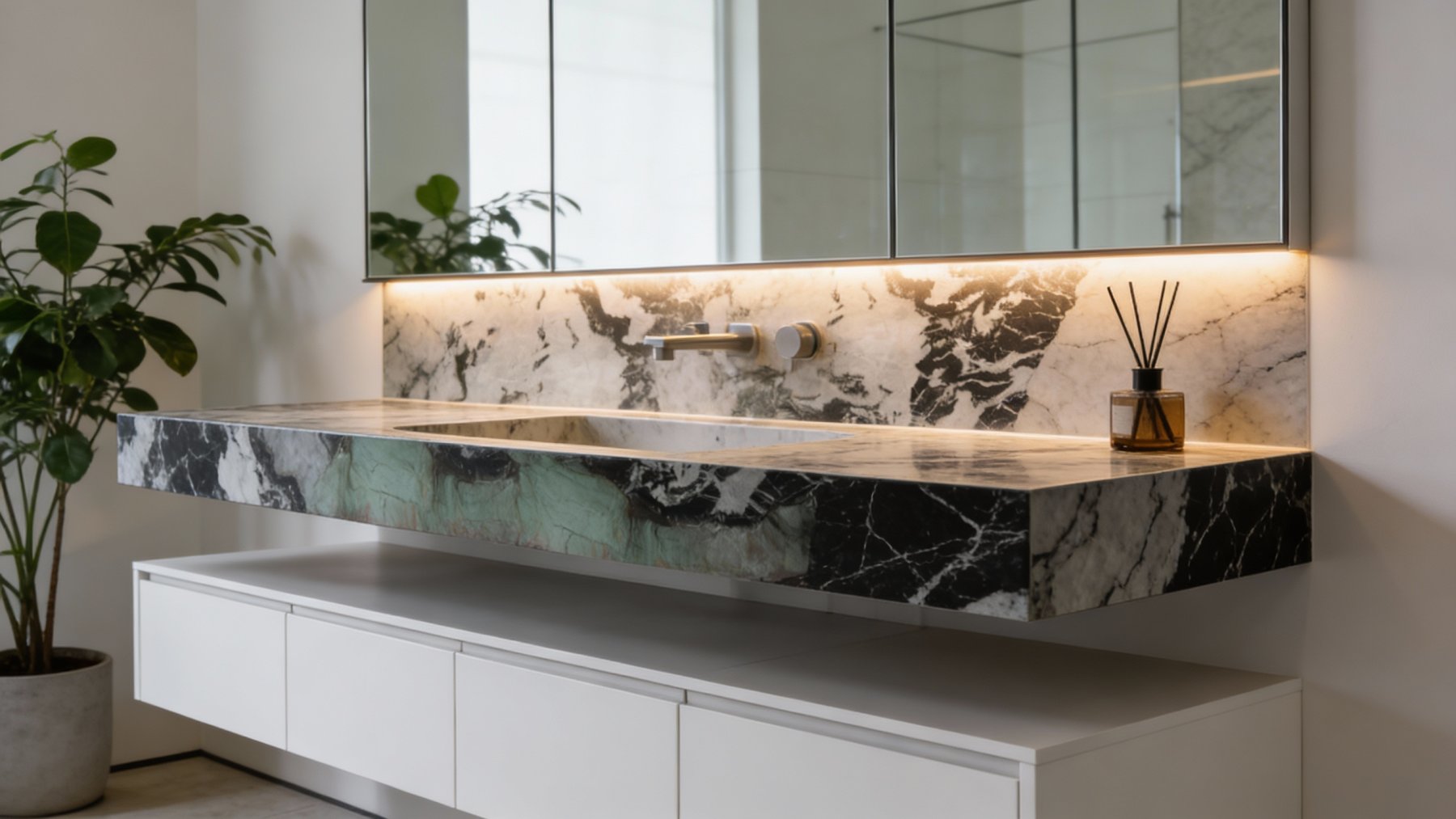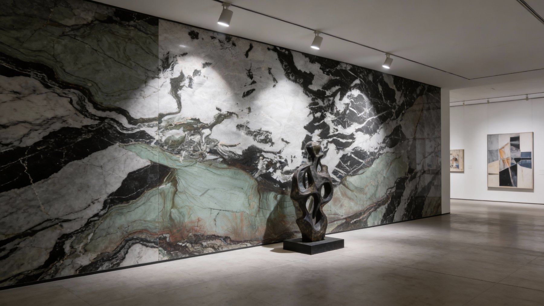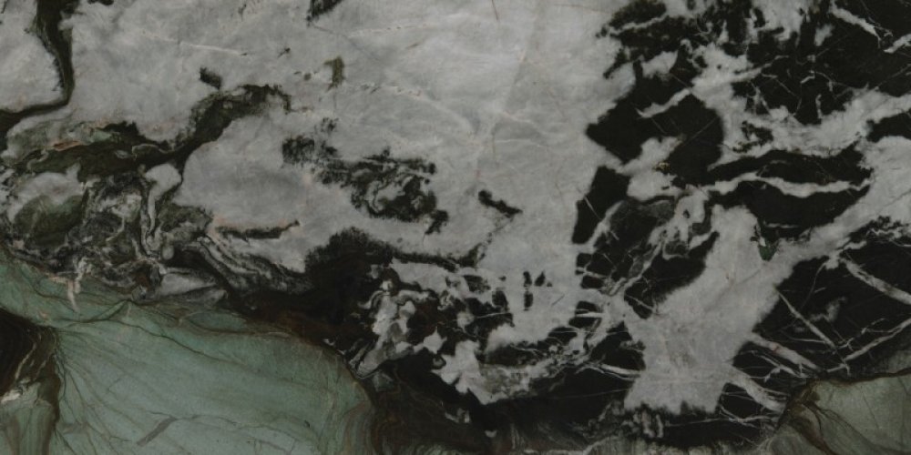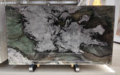 #### 1. 底色基调 石材底色呈现鲜明的上下分区特征,兼具雅致与张力:下半部分以**柔和灰绿色(浅青绿色)**为主调,色调裹挟着淡淡的雾感,温润不张扬,似清晨山林间的薄雾笼罩;上半部分由**深邃黑色**与**清透白色**交织构成基底,黑如浓墨、白似凝雪,二者强烈碰撞又自然融合,形成极具视觉冲击力的对比。底部边缘隐约点缀几缕淡红色细脉,为素雅基调注入一丝微妙暖意,更显层次丰富。 #### 2. 纹理形态 纹理以自然流动的姿态展现原始艺术感: - 下半部分灰绿色区域内,**细密蜿蜒的浅白脉络**如溪流般舒展蔓延,线条柔和且富有动感,仿佛将山间流水的灵动定格; - 上半部分黑白区域中,黑色斑块与白色肌理**相互缠绕、渗透**,似水墨泼洒般无拘无束——既有粗重的块状纹理,也有纤细的丝状脉络,交织成抽象生动的自然图案,整体无序却暗含和谐韵律,如天地初开的混沌之美。 #### 3. 细节质感 表面经精细抛光后,呈现**细腻温润的光泽**,触感应平滑致密: - 灰绿色区域质感如凝脂般细腻,脉络处矿物颗粒均匀分布,触感顺滑,似玉石般温润; - 黑白区域中,黑色部分质地厚重紧实,白色部分略带半透明感,纹理边缘时而**模糊晕染**(如云雾弥散)、时而**清晰锐利**(如刀刻斧凿),层次分明; 整体兼具石材的坚硬质感与玉石的温润光泽,细节处的矿物肌理若隐若现,每一寸纹理都彰显着自然造物的独特性。