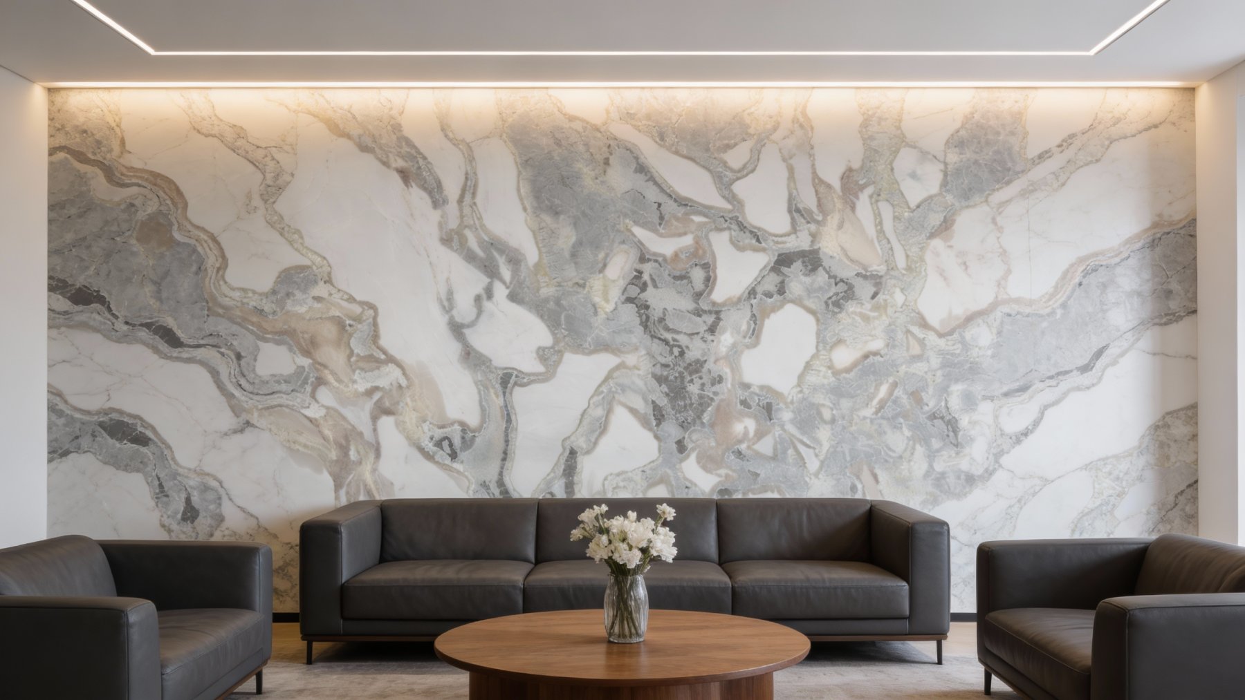 ### 底色基调 这款石材以**纯净雅致的白色为核心底色**,间杂着浅米白与淡灰色的柔和过渡,整体色调清新明快却不失温润感。白色基底干净通透,如晨雾般轻盈;浅灰与米白的融入则弱化了纯白的冷硬,让色调更显亲和自然,既保留天然石材的原生质感,又透出简约洁净的现代气息。### 纹理形态 纹理呈现**不规则的自然脉络状**,以深浅不一的灰色为主导,交织着深灰乃至近黑色的纤细线条,蜿蜒流动、交错分布。纹理无固定规律却于无序中见协调:时而如行云流水般舒展蜿蜒,似山间溪流般灵动;时而如水墨晕染般层层叠叠,在局部形成密集的视觉焦点;稀疏处则留白得当,让空间更显通透呼吸感,整体纹理如自然天成的艺术画作,充满动态韵律。### 细节质感 表面质感**细腻温润,触感应是光滑莹润**,带有天然石材特有的柔和光泽。白色基底部分细腻纯净,似打磨过的羊脂玉般细腻;灰色纹理区域则藏着丰富的层次变化——部分纹理边缘模糊晕染,如墨汁在宣纸上自然扩散;部分线条清晰利落,如自然勾勒的笔触;深浅灰调的过渡让纹理更具立体纵深,整体既具细腻的触感,又有视觉上的高级质感,尽显天然石材的精致与厚重。