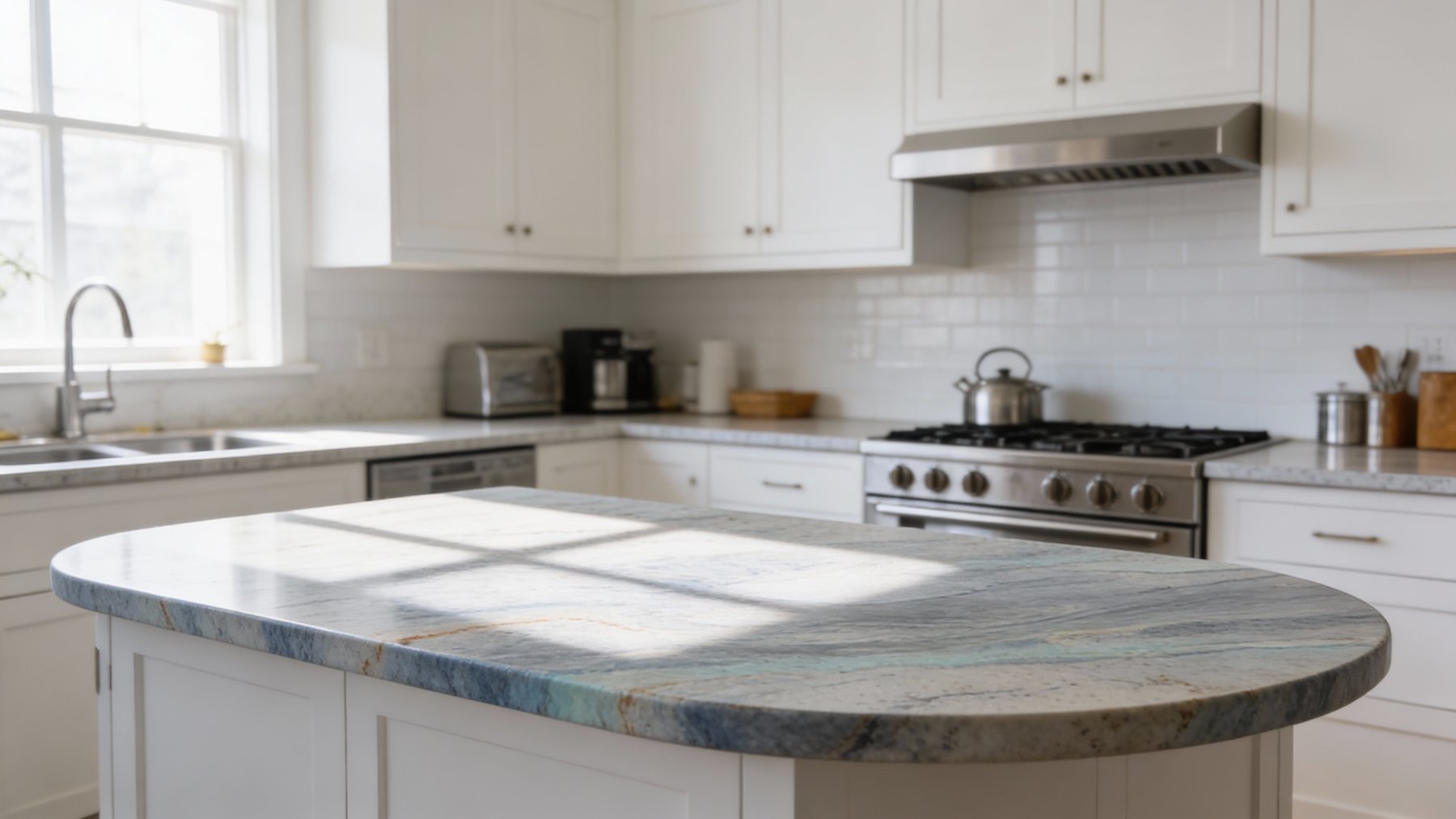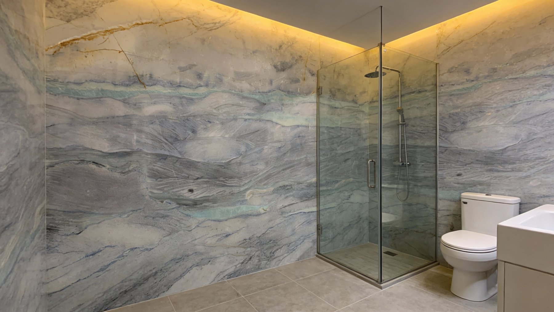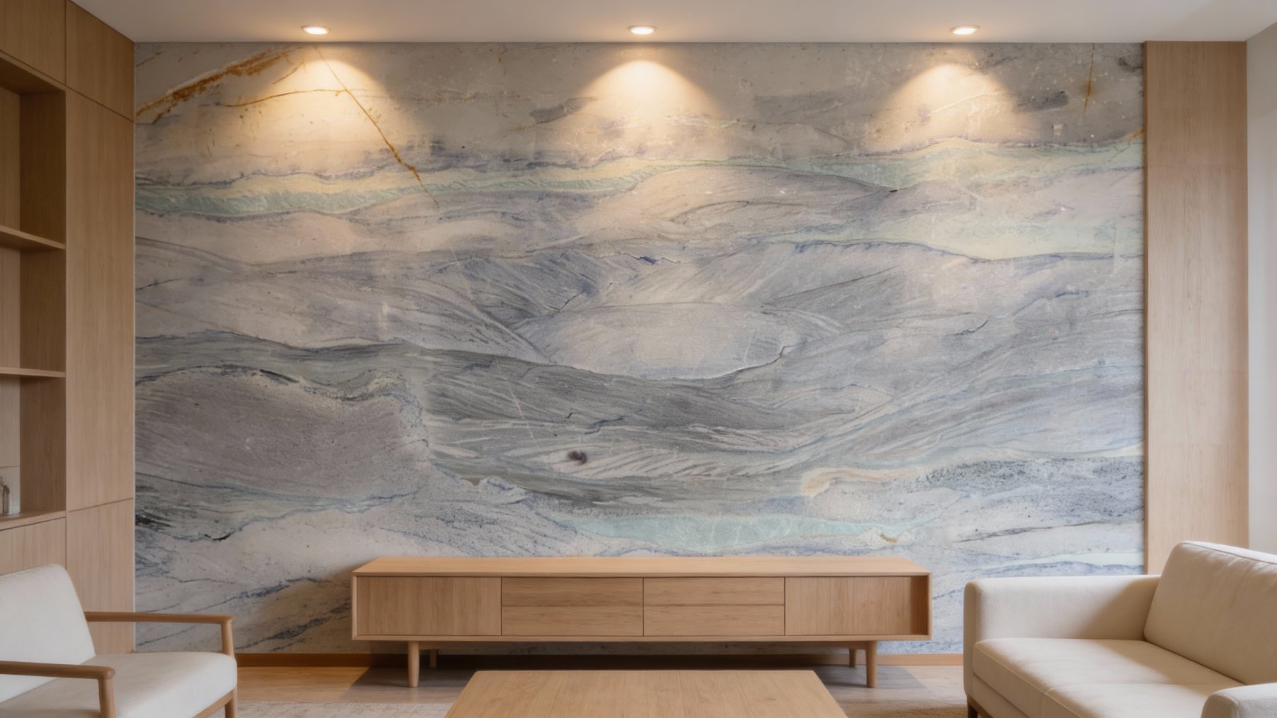 以柔和的浅灰白色为基底,基调清新淡雅,如同晨雾笼罩的静谧湖面,隐约透出朦胧的暖意,为石材奠定了宁静舒缓的视觉基础,整体氛围温润而不张扬。