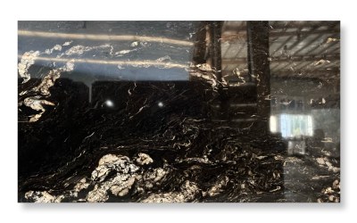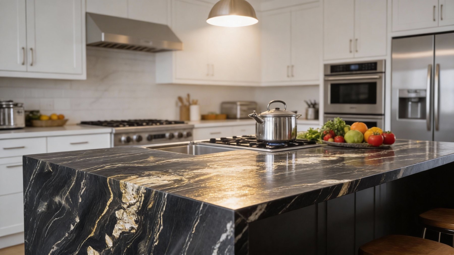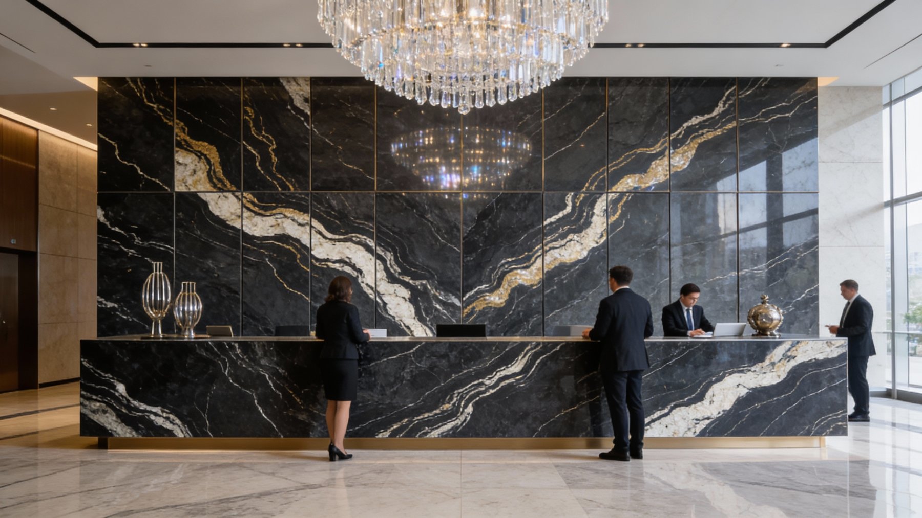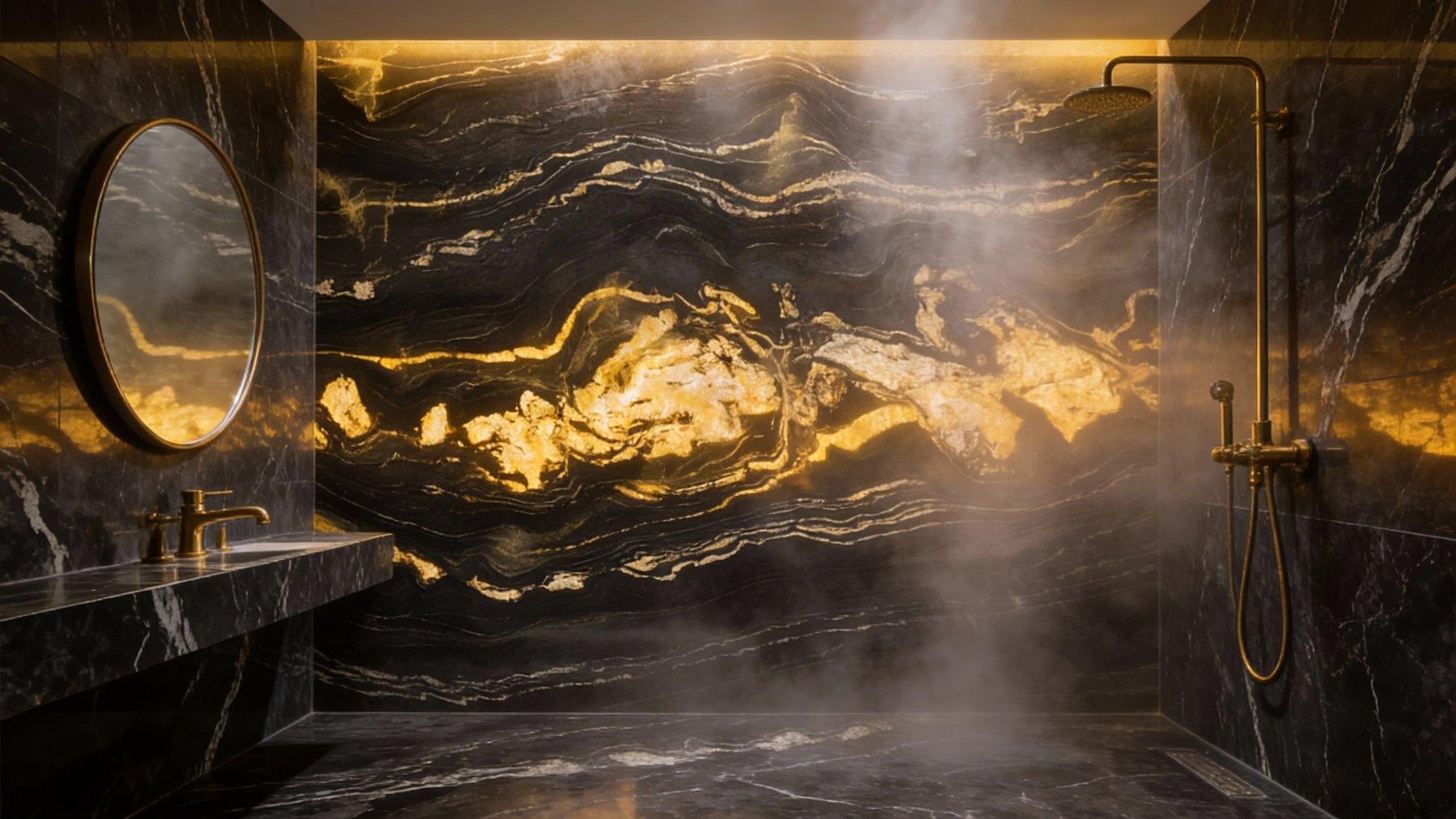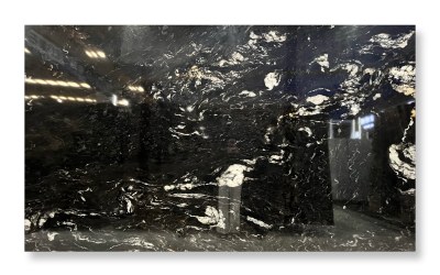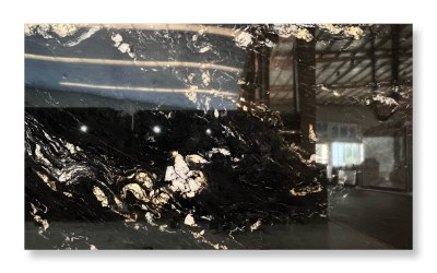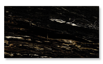 ### 底色基调 以**深邃炭黑**为基底,色泽浓郁且匀净,似夜幕般沉稳内敛,无多余杂色干扰,奠定了整体大气厚重的基调。基底质感纯粹,带有天然石材特有的温润哑光感,触之细腻,视觉上传递出静谧而高级的质感张力。### 纹理形态 纹理呈现**自然流动的波浪状脉络**,由暖金色与浅米白色的矿物线条交织而成: - 线条粗细变幻莫测:时而纤细如丝,蜿蜒穿梭于黑底间;时而宽幅如带,舒展铺陈出层次; - 局部点缀不规则斑块:中部及边缘散布着云絮状、结晶状的浅金色区块,似地质运动中矿物熔融的瞬间定格,与流动线条相互呼应; 整体纹理动态感十足,兼具韵律与张力,仿佛将亿万年地质演变的轨迹浓缩其中,层次丰富且富有故事性。### 细节质感 石材表面经精细抛光处理,触感应**平滑细腻**,却又暗藏天然肌理的微妙层次: - 底色区域:呈现温润哑光质感,细腻如墨玉,低调中透着厚重; - 金色纹理:蕴含矿物特有的**内敛光泽**,在光线下隐约折射出柔和闪光(似云母碎屑的天然肌理),与哑光黑底形成明暗与光泽的对比; 纹理边缘过渡自然,无生硬界限,既保留了天然石材的粗犷底蕴,又兼具现代工艺的精致触感,视觉与触觉双重质感拉满。