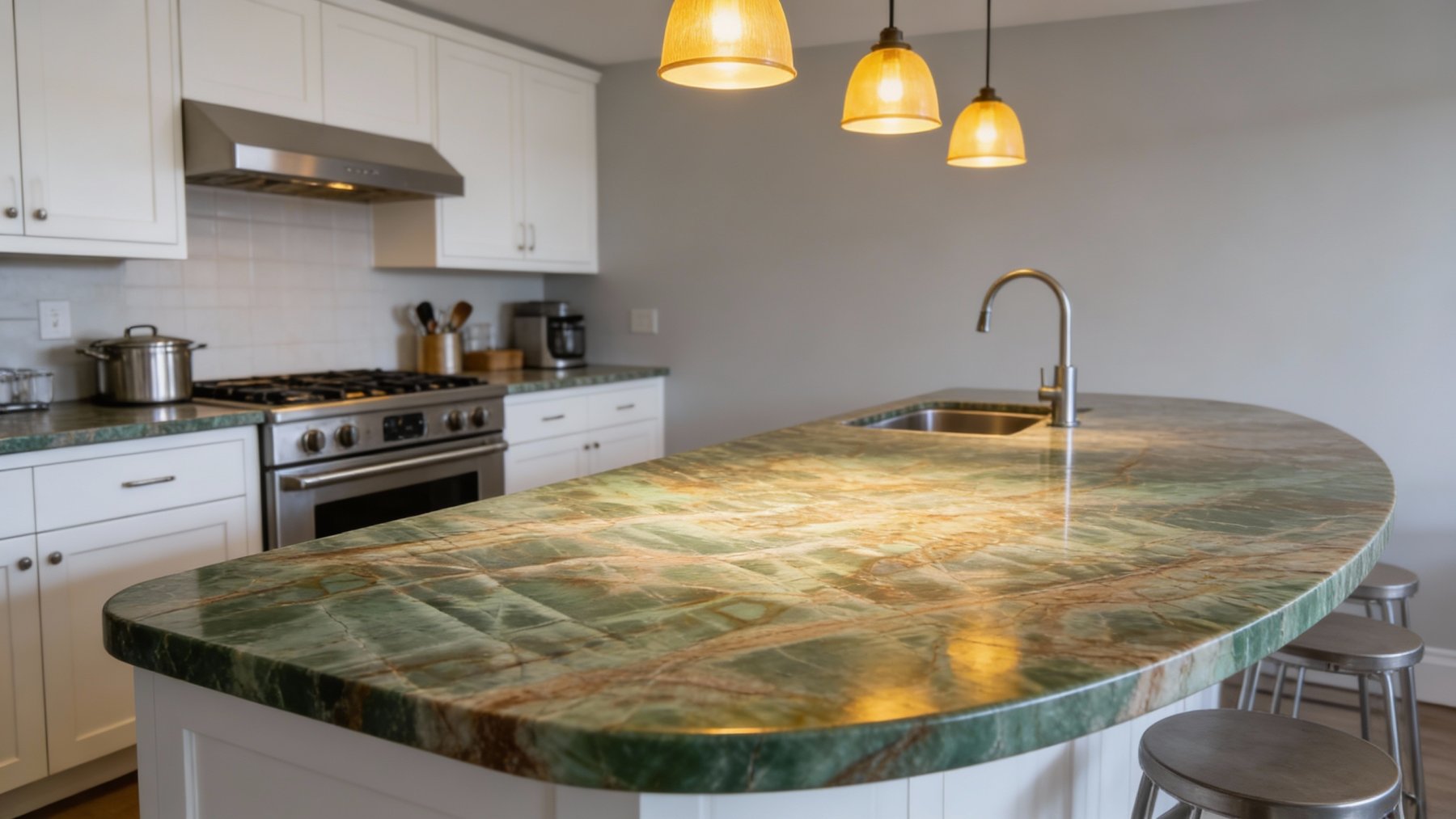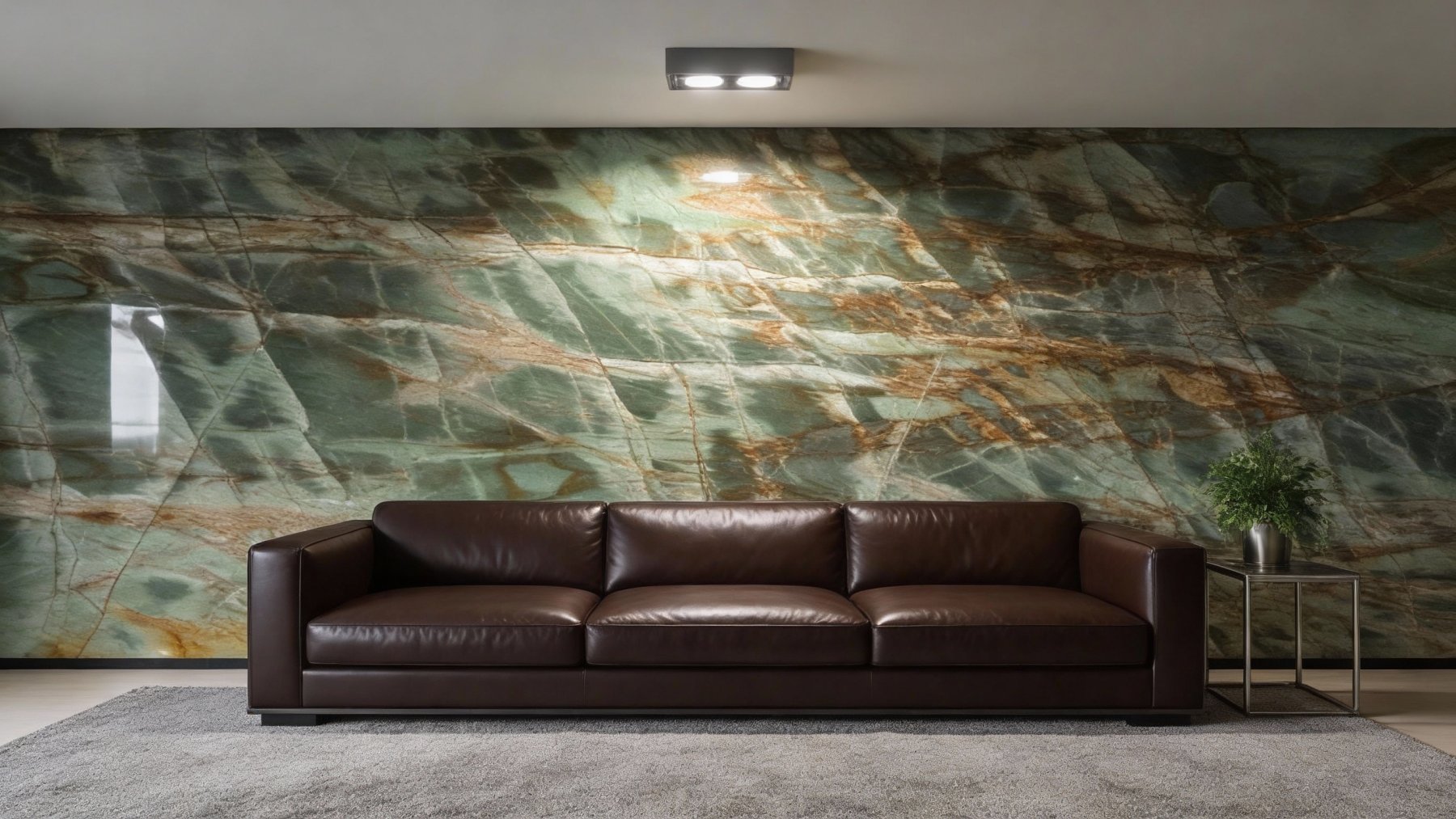 ### 底色基调 这款石材的底色以**浅灰绿为基底**,间杂淡褐与米白的温润色调,整体呈现出柔和自然的基调——既无艳丽跳脱的色彩,也不沉闷单调,仿佛将自然岩壁的质朴感凝萃其中,给人一种静谧温润的视觉感受。### 纹理形态 纹理形态丰富且富有动感:以**褐棕色、墨绿色及深褐色**为主色调的线条与斑块交织分布。线条或纤细如丝、纵横穿梭,或粗犷如带、层叠延展,交织成不规则的“脉络状”结构;部分区域纹理密集呈网状,部分区域则以块状纹理点缀,整体纹理富有流动感与层次感,仿佛记录了地质演变中矿物质沉淀、挤压的自然轨迹,充满原始的自然张力。### 细节质感 细节处彰显细腻质感:表面经精细抛光后,呈现出**温润的光泽感**,触感应顺滑致密;纹理间的色彩过渡自然柔和,无生硬边界,细微处可见天然矿物颗粒的肌理痕迹——既保留了石材原生的质朴质感,又兼具精致的视觉效果,整体给人厚重雅致、质感上乘的印象,仿佛能触摸到地质时光的沉淀。